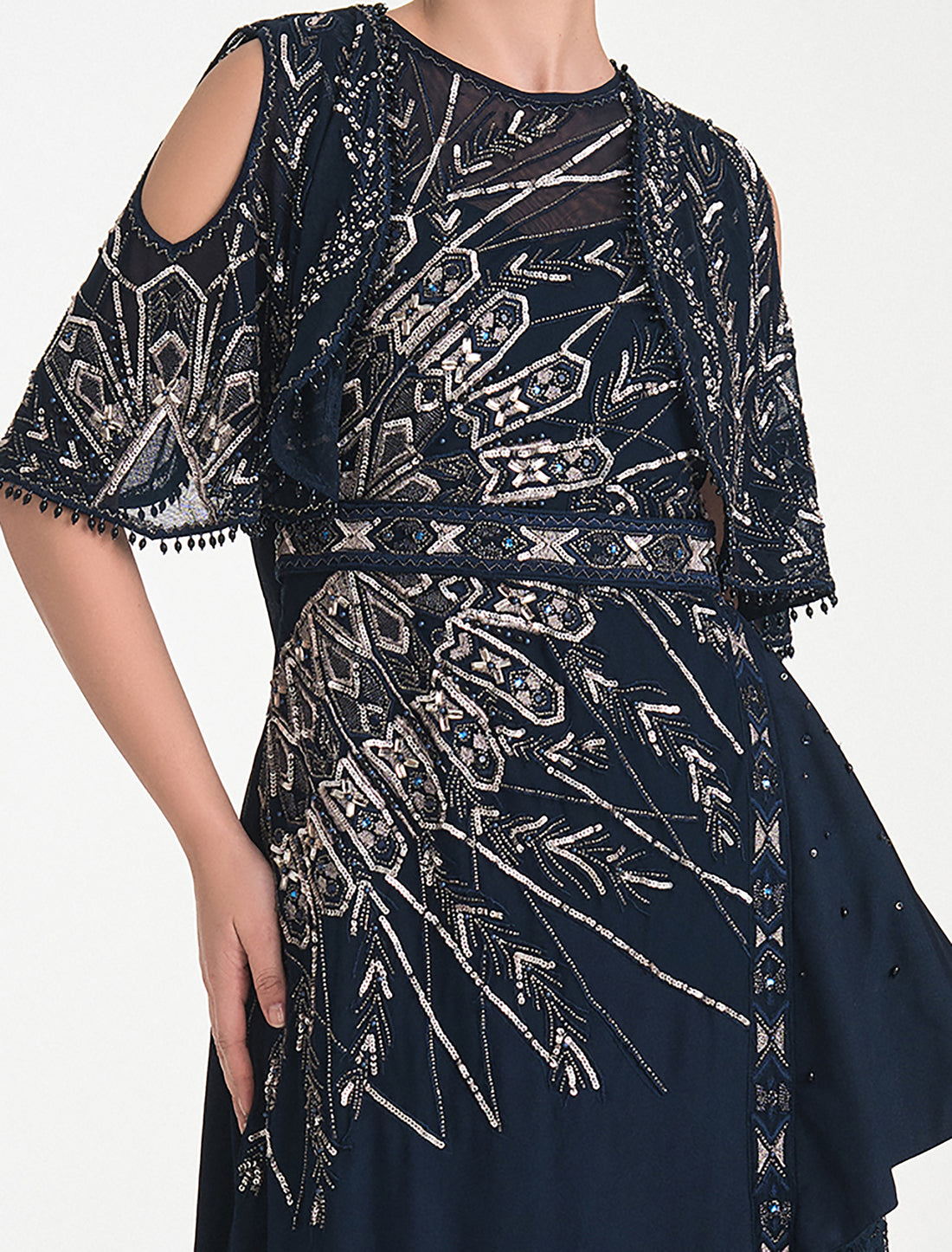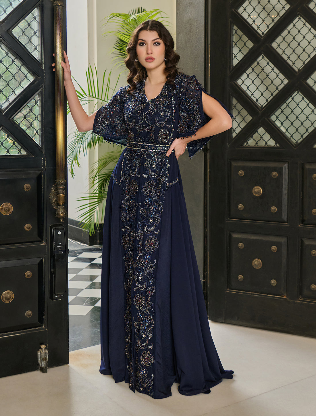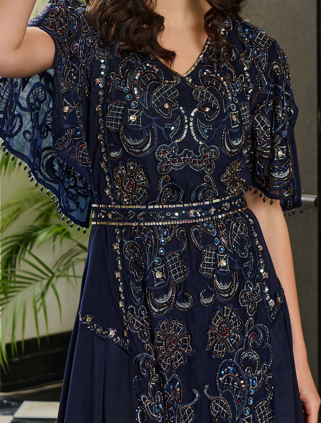 فستان درابيه من الوسط بلون كحلي بتطريزات يدوية