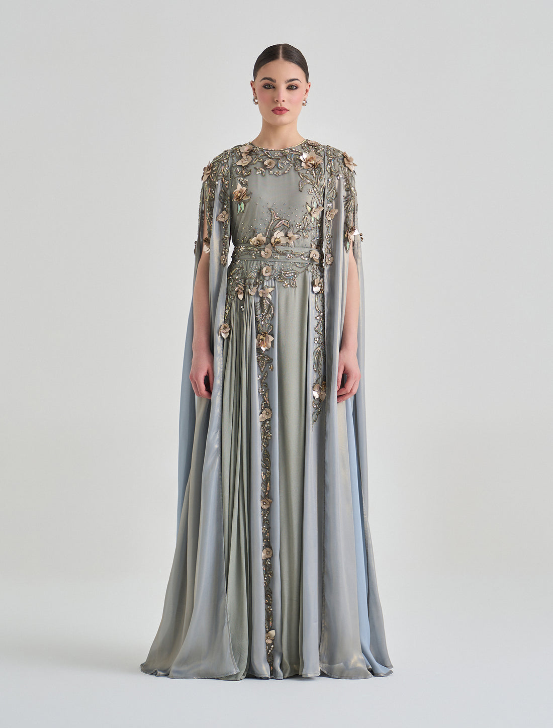 فستان سهرة مطرز يدويًا من ماركة شالكي اللون: رماديالطول: ٦٠ بوصة لجميع المقاسات.تطريز مميز من...