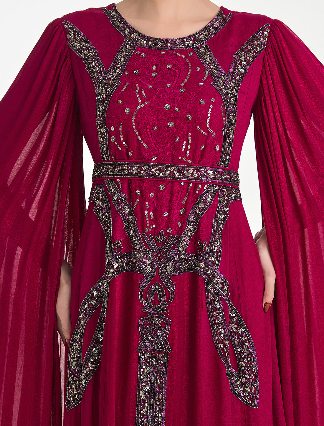 فستان انيق كم طويل بلون فوشي بتطريز يدوي متقن