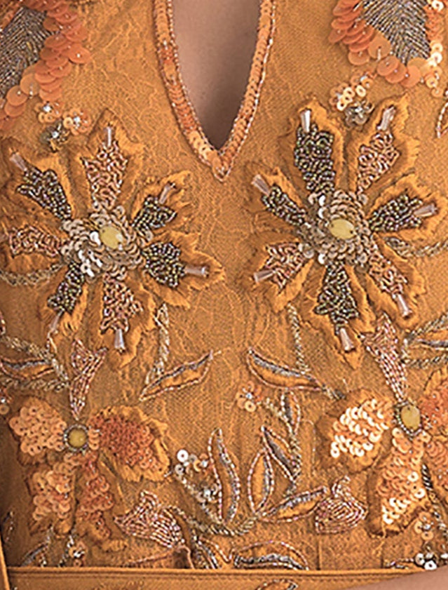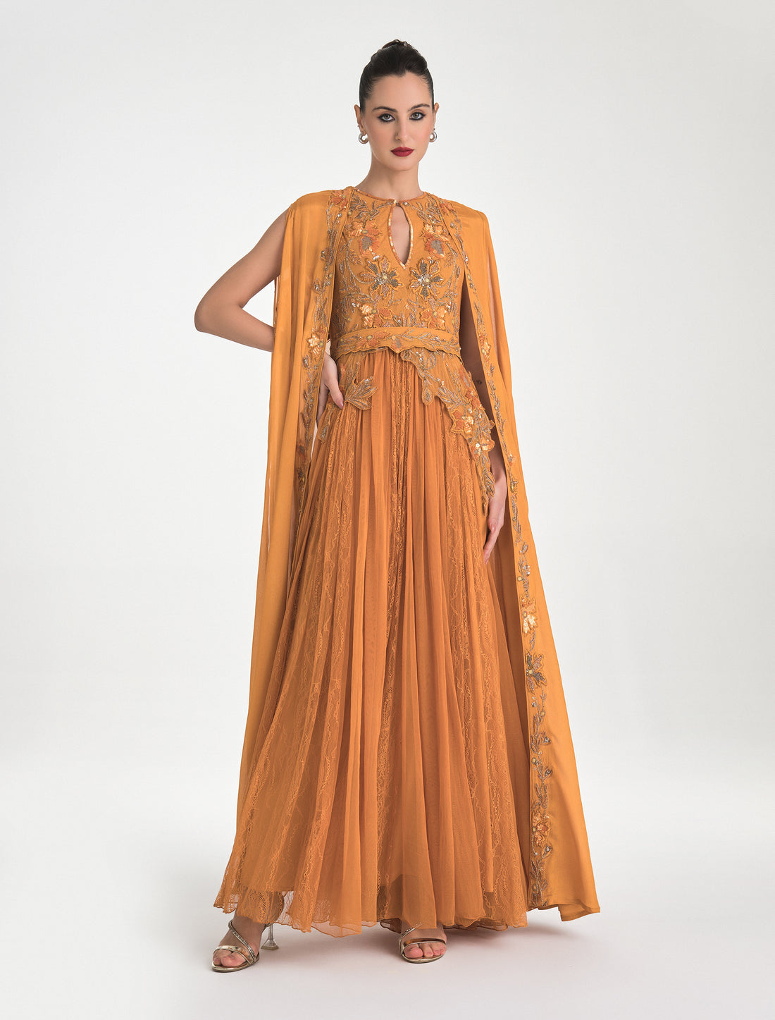 فستان أصفر كموني مصنوع من قماش الكريب مع تول ناعم، يتميّز بتصميم فاخر يجمع بين...
