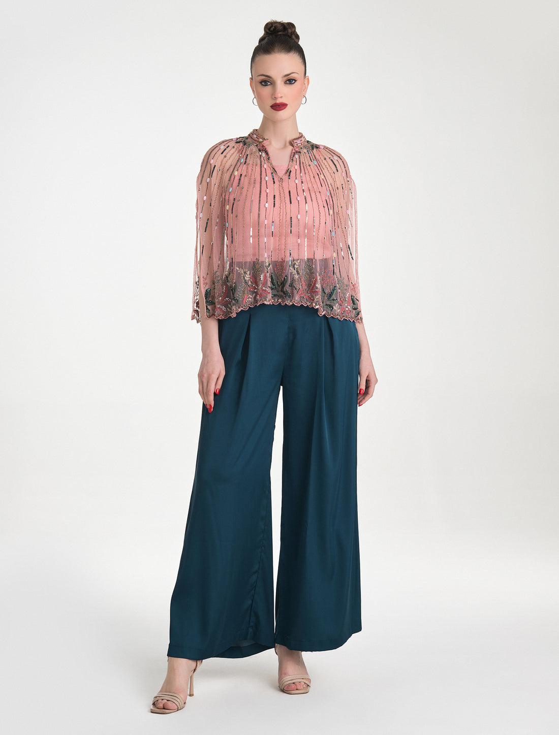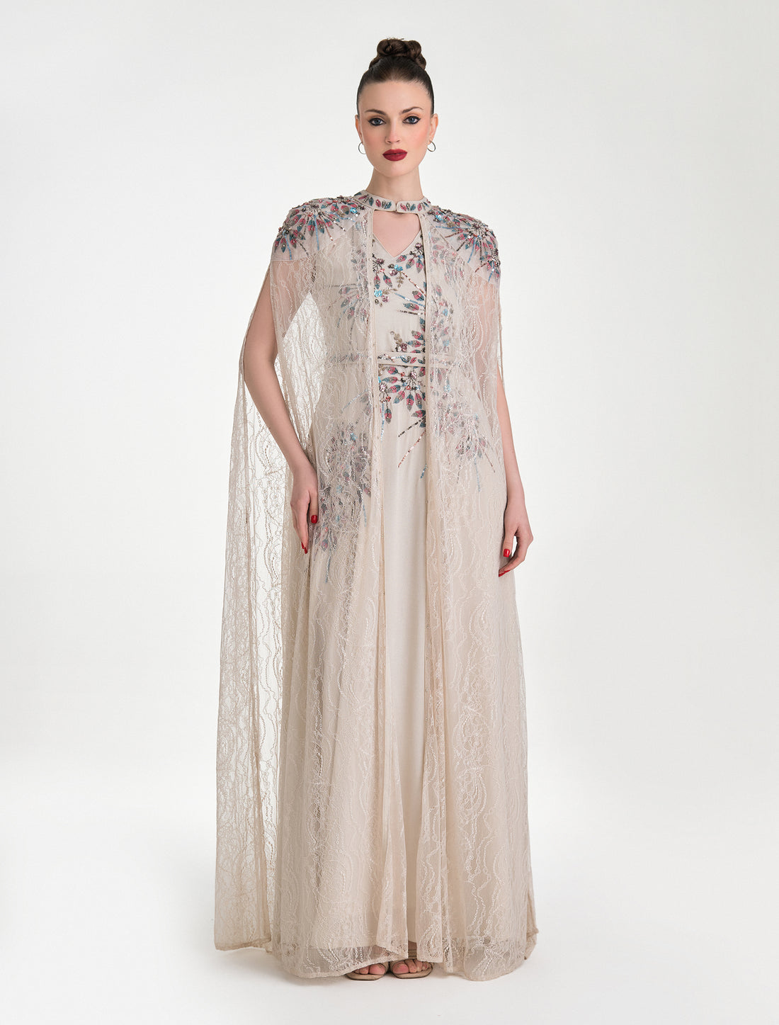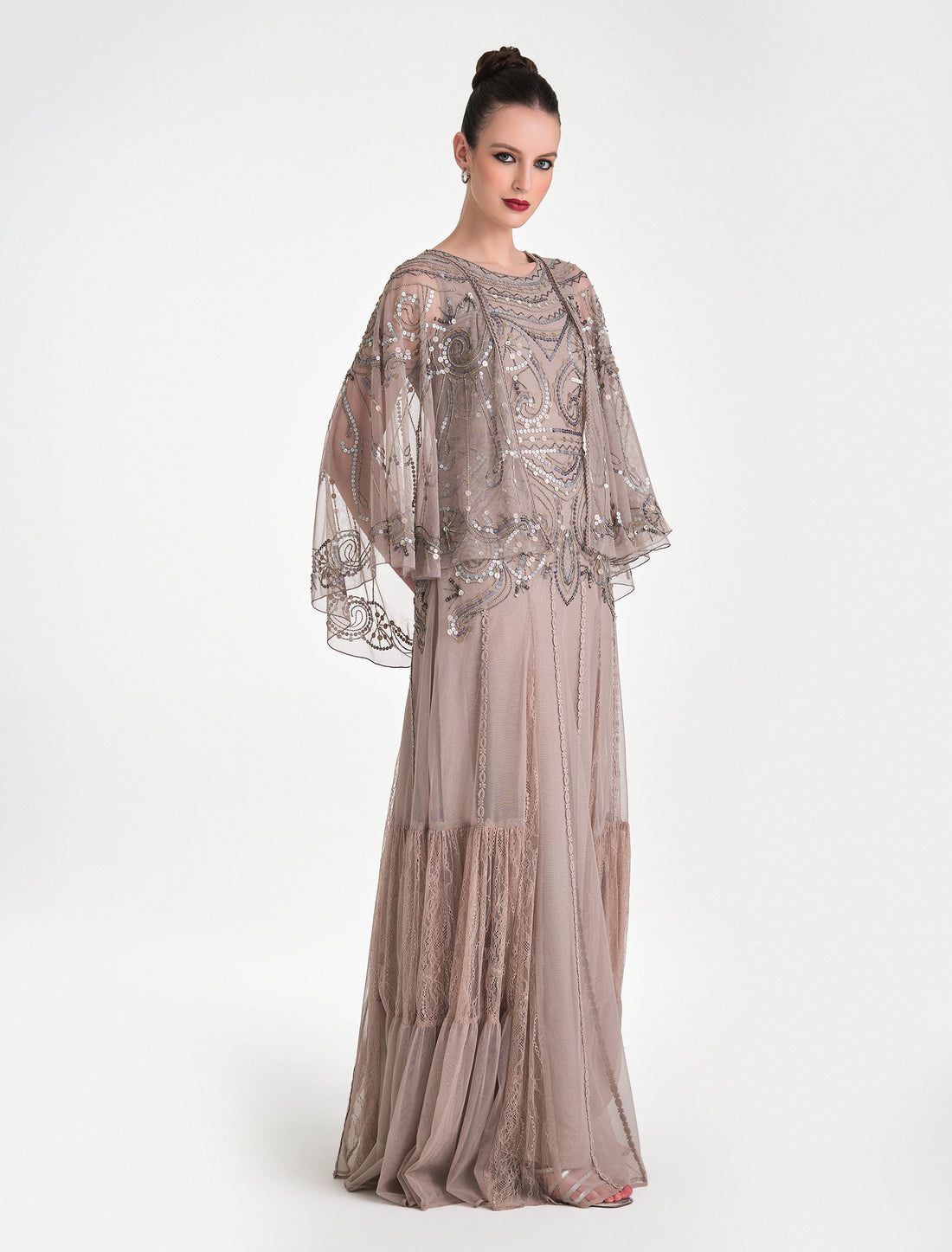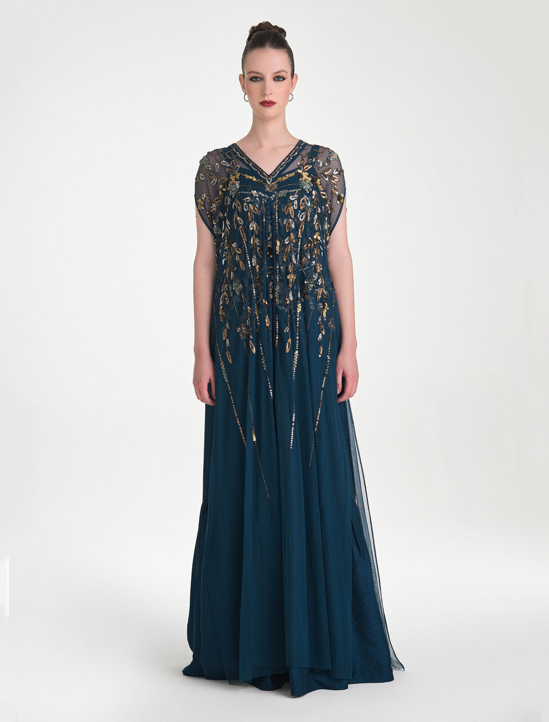 فستان سهرة اخضر غامق بستايل فضفاض مع كاب مفتوح
