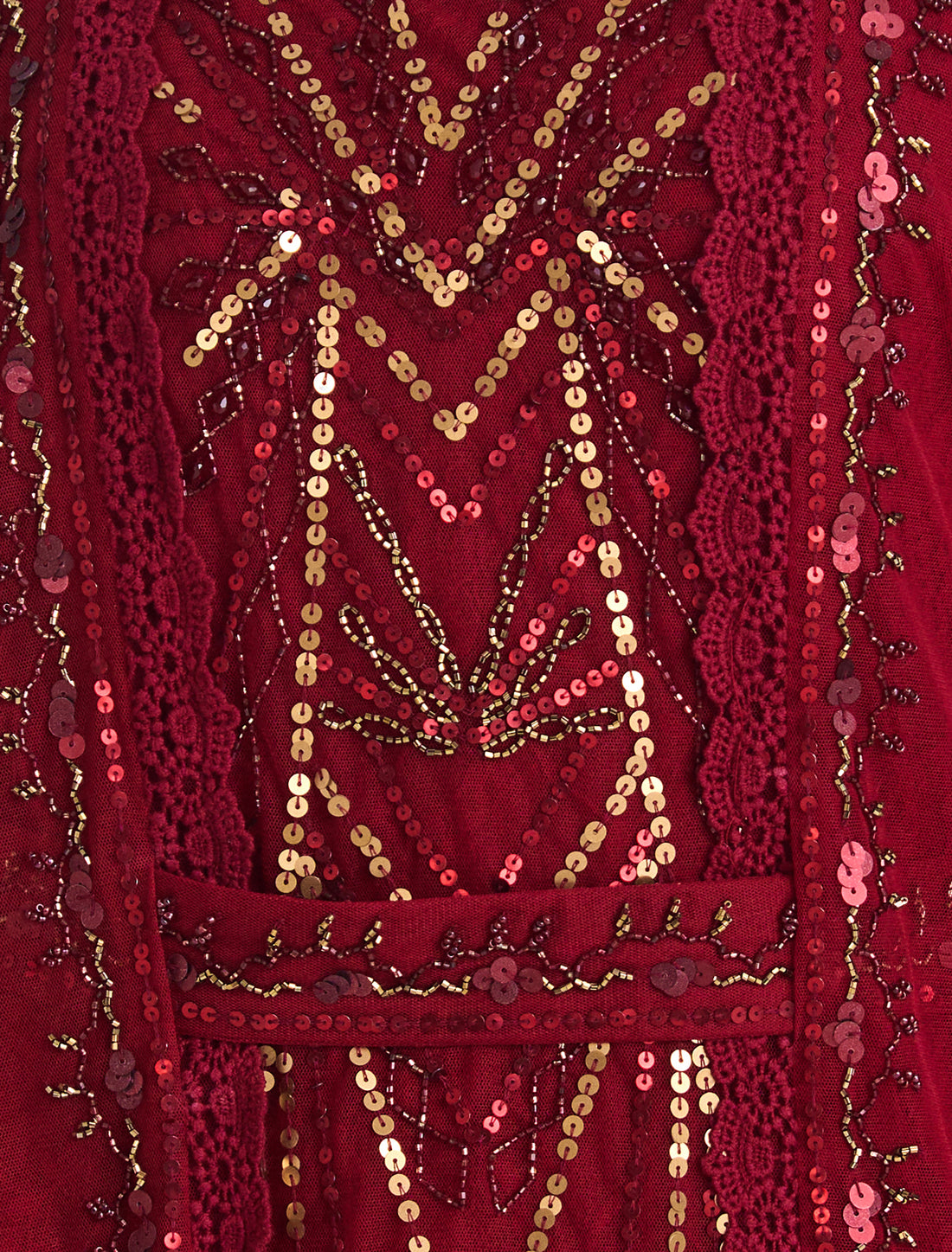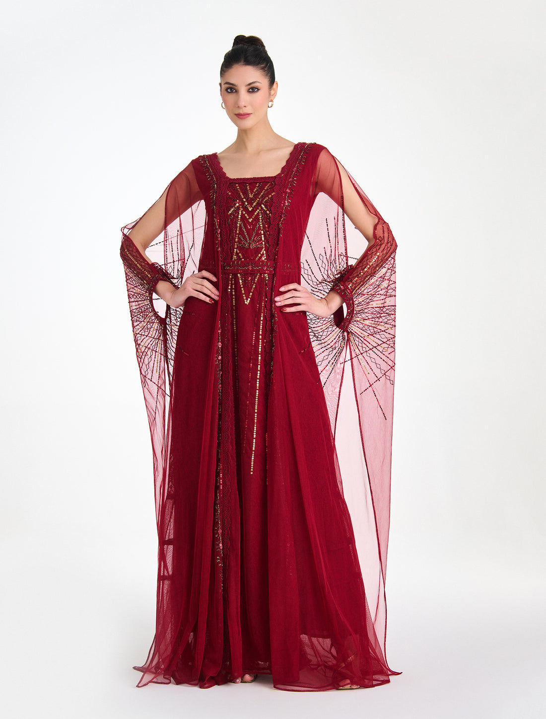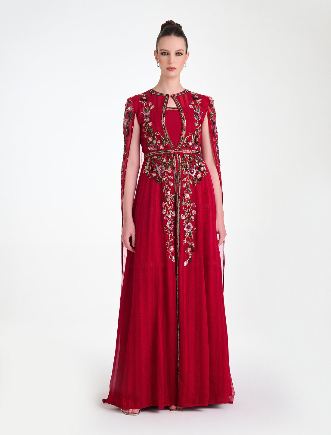 فستان سهرة مطرز يدويًا من ماركة شالكي اللون: احمرالطول: 60 بوصة لجميع المقاسات الخامة: مخمل...