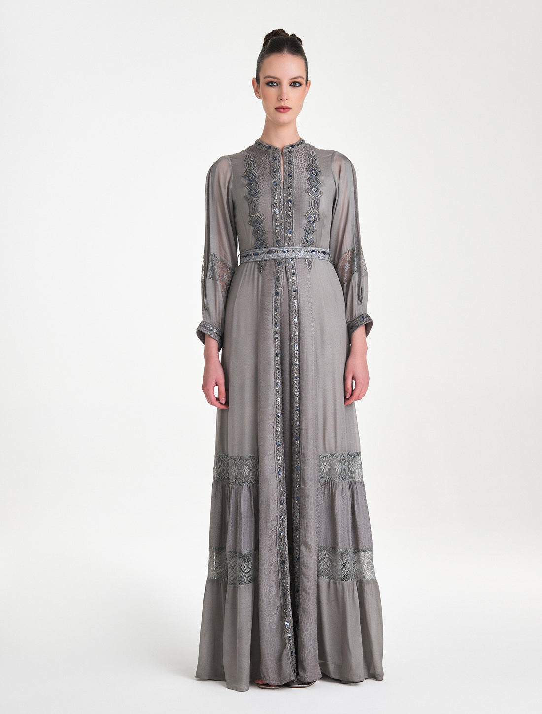 فستان سهرة مطرز يدويًا من ماركة شالكي اللون: رصاصيالطول: 60 بوصة لجميع المقاسات الخامة: مخمل...