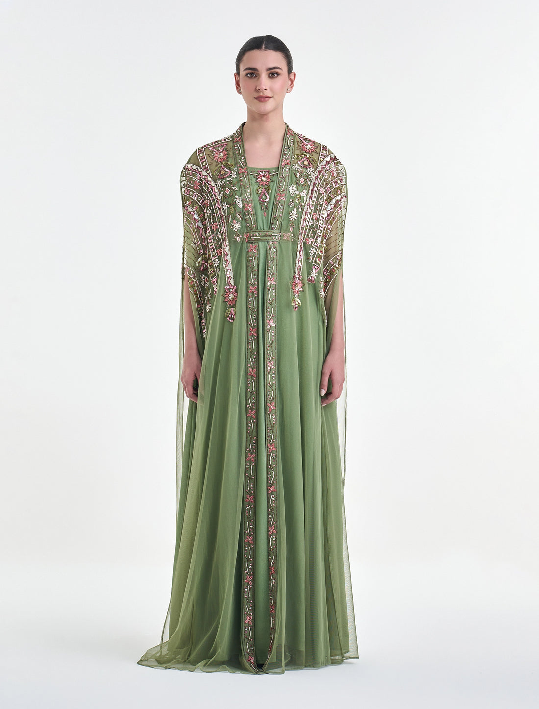 فستان سهرة مطرز يدويًا من ماركة شالكي اللون: اخضر فاتح الطول: 60 بوصة لجميع المقاسات الخامة:...