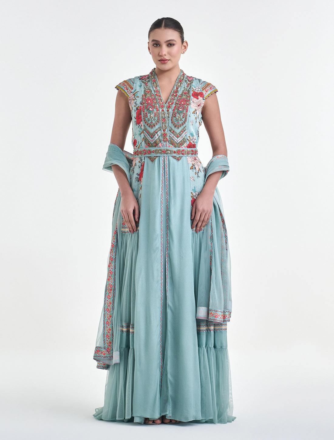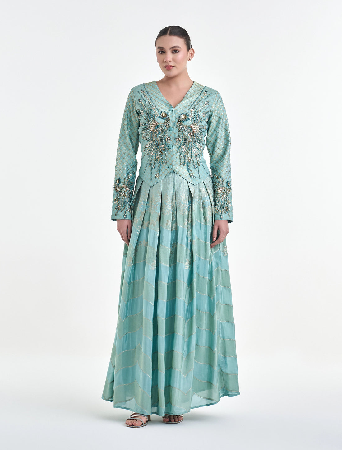 طقم سهرة مطرز يدويًا من ماركة شالكي اللون: فيروزيالطول: 60 بوصة لجميع المقاسات. الخامة: تطريز...