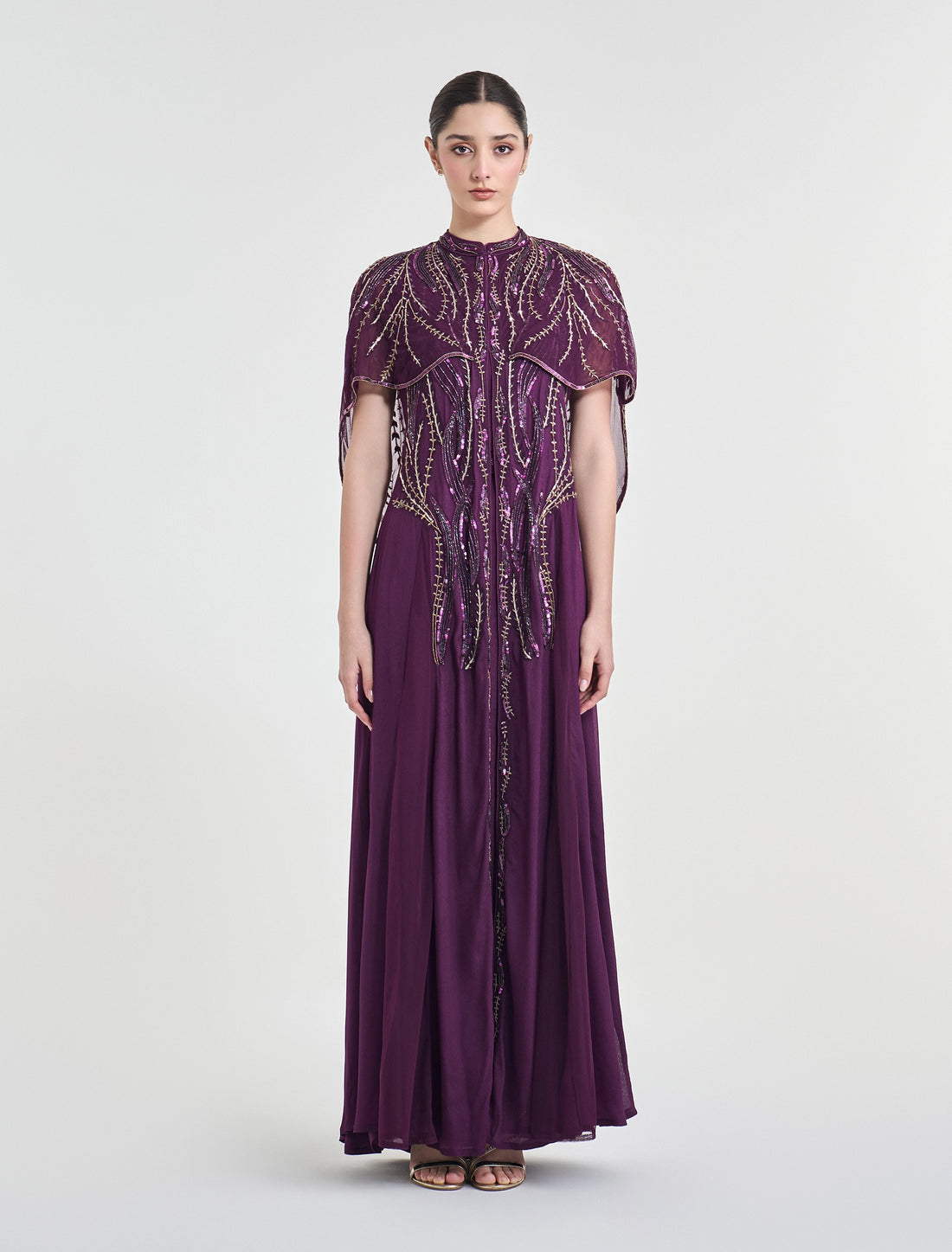 فستان بنفسجي غامق سهرة بكاب طويل مطرز