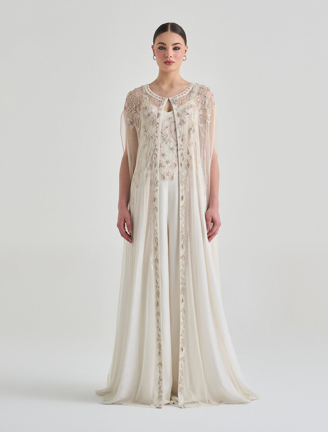 Evening Jumpsuit for Women with Gold Embroidery and Elegant Cape