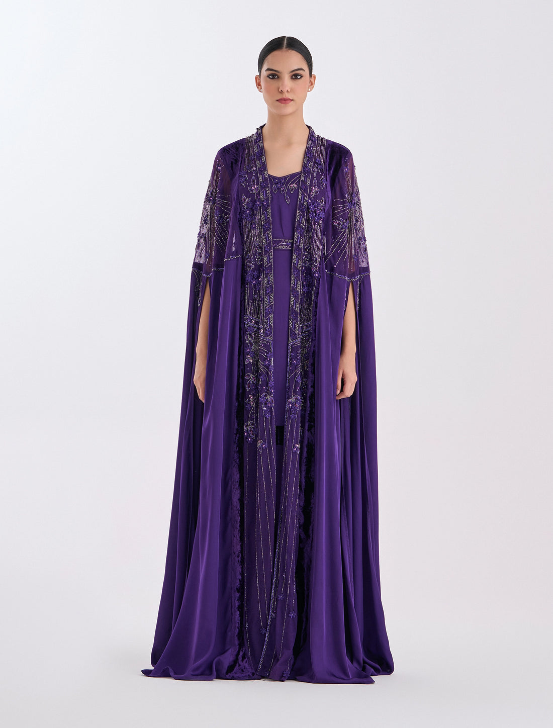 Dark Purple Dress for Evenings with Long Embroidered Cape