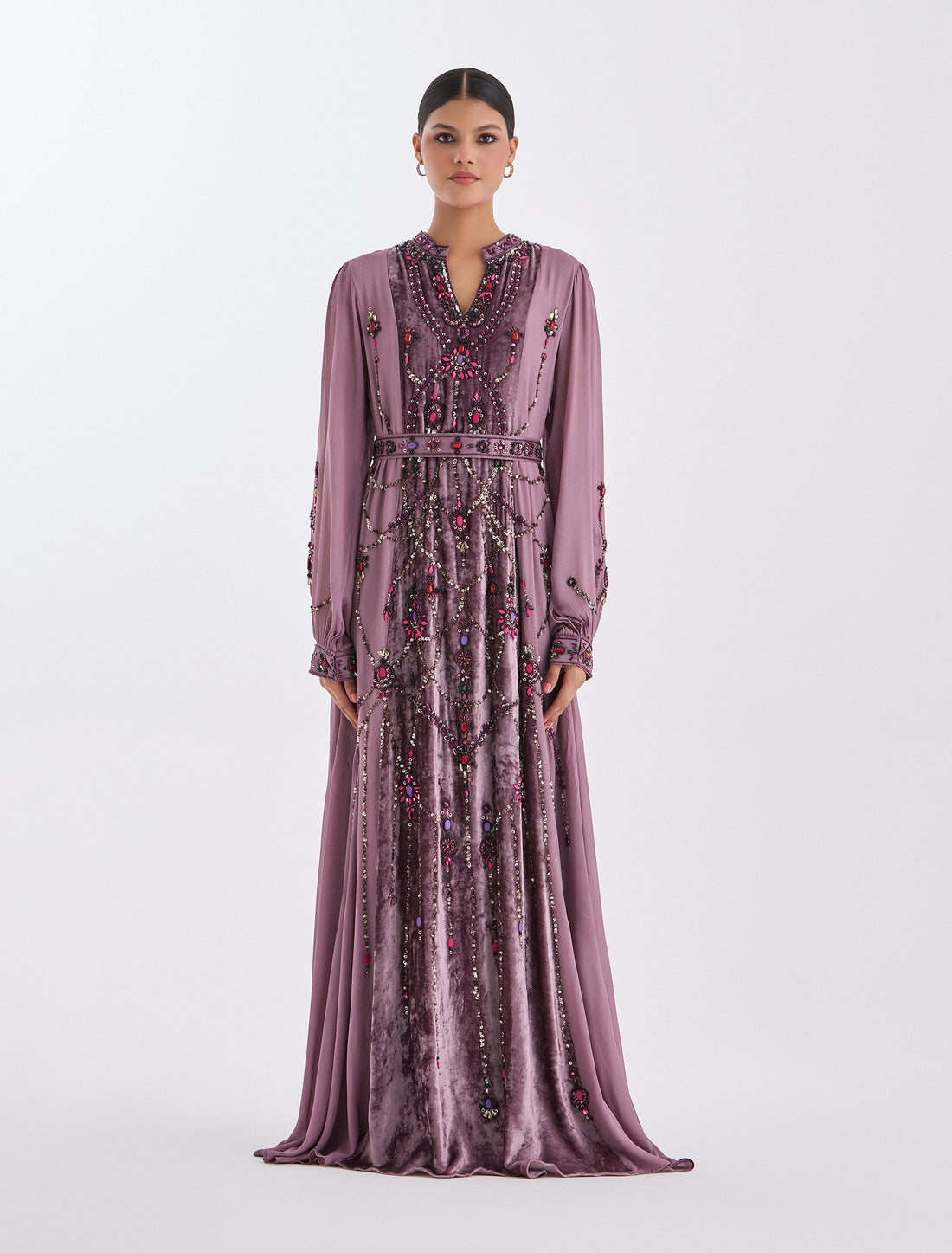 Hand-embroidered evening dress from Shalky brand Color: Mouve Length: 60 inches for all sizes. Material: Distinctive...