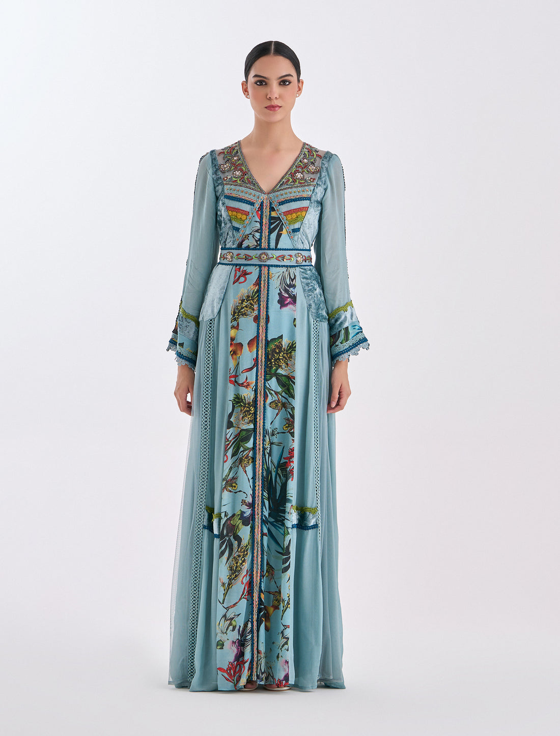 Hand-embroidered evening dress from Shalky brand Color: TurquoiseLength: 60 inches for all sizes.Distinctive embroidery on...