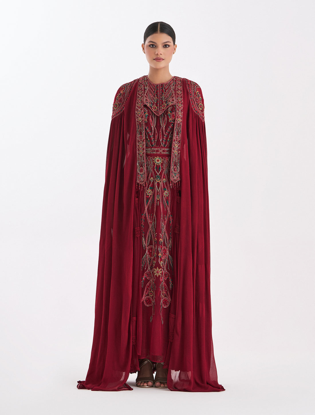 Dark Red Three-Piece Maxi Evening Set with Hand Embroidery