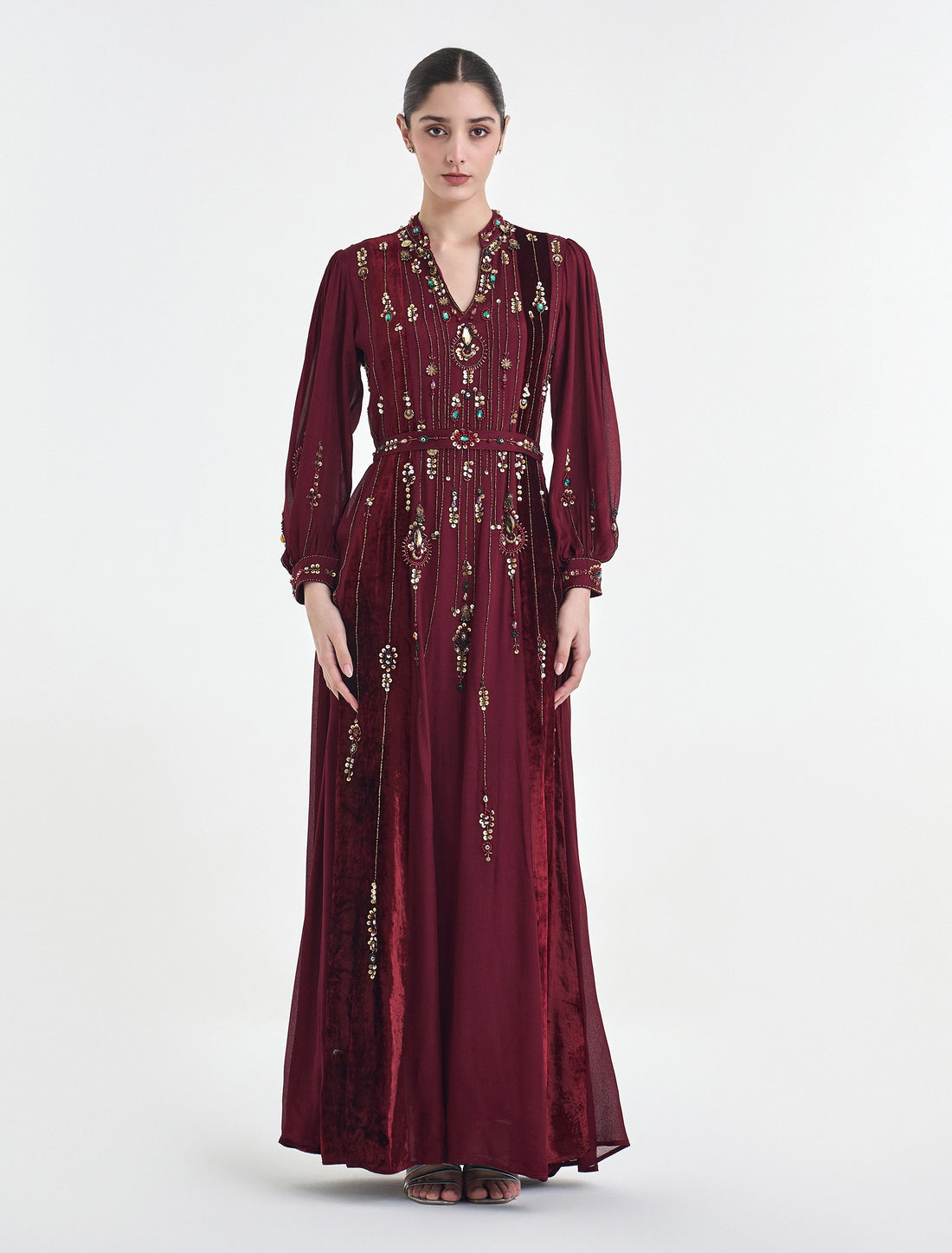 Embrace elegance in this long-sleeve dress with beaded embroidery and a royal-inspired olive green color....