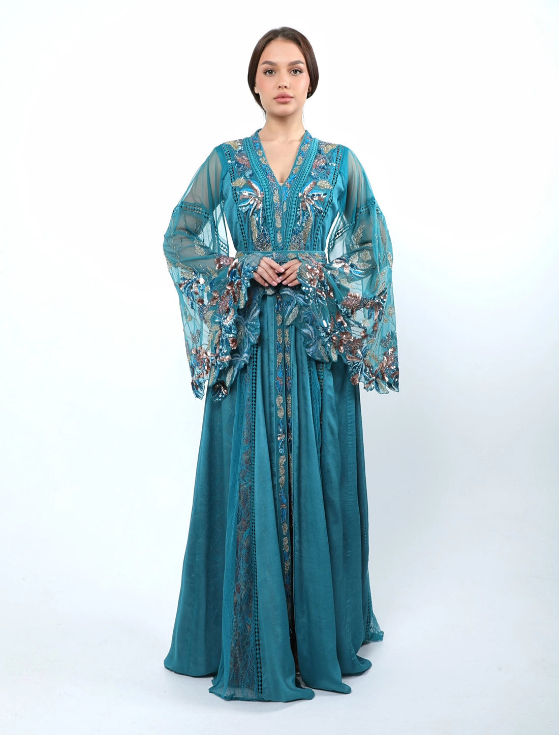 Turquoise Modest Evening Dress - Hand-Embroidered V-Neck Gown