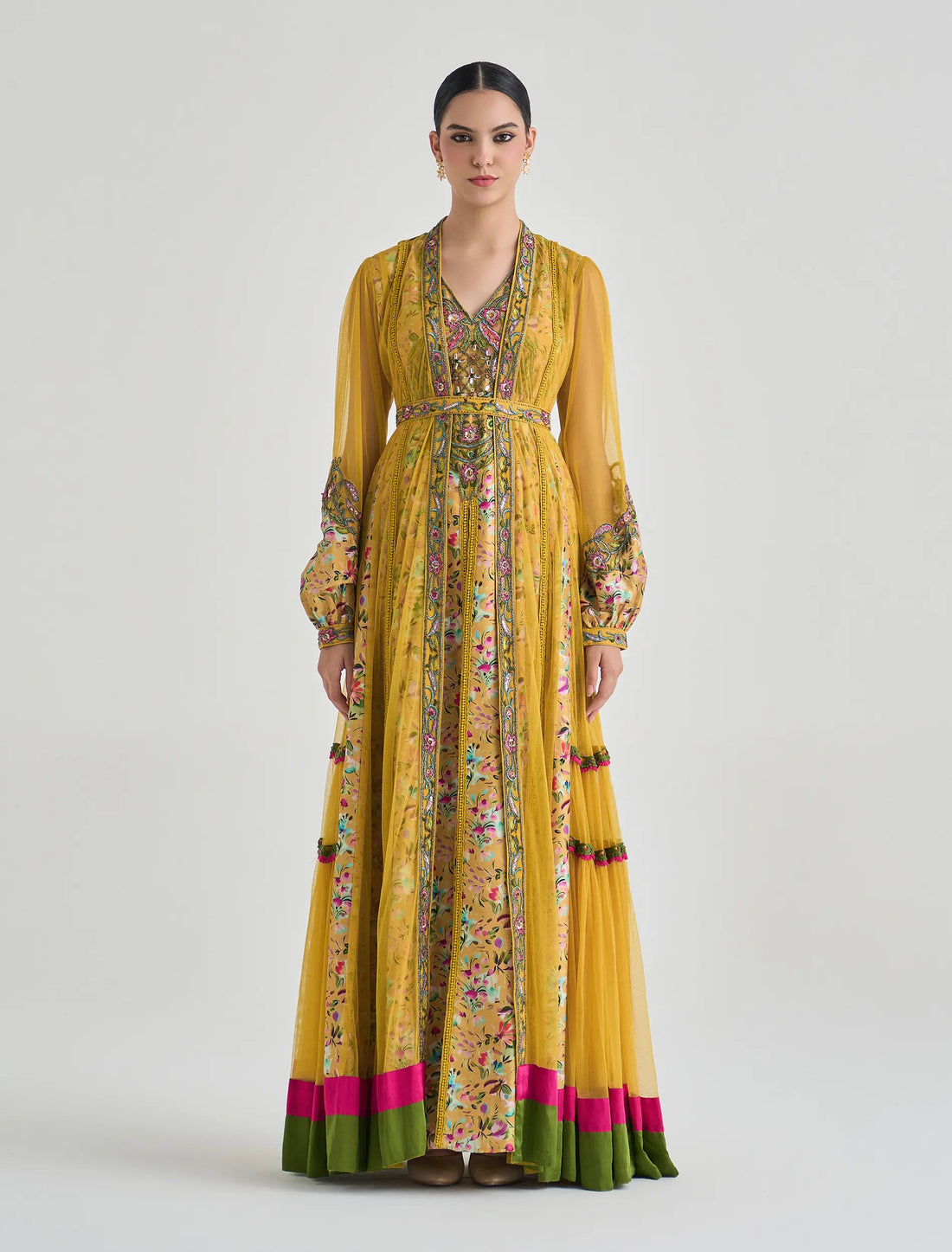 Hand-embroidered evening dress from Shalky brand Color: Pink & CuminLength: 60 inches for all sizes....