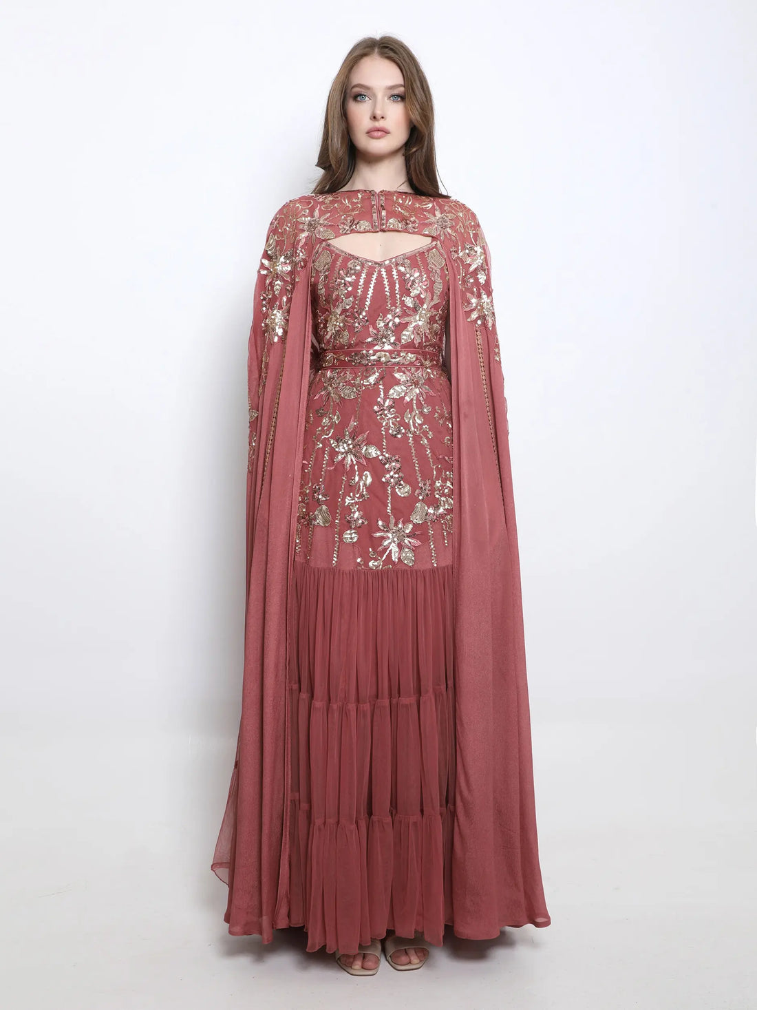 Dazzle everyone in this coral dress, featuring an intricately hand-embroidered cape with luxurious accents and...