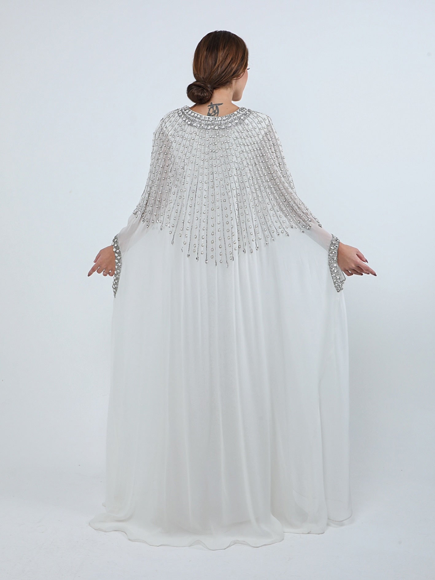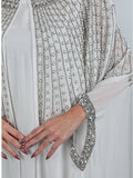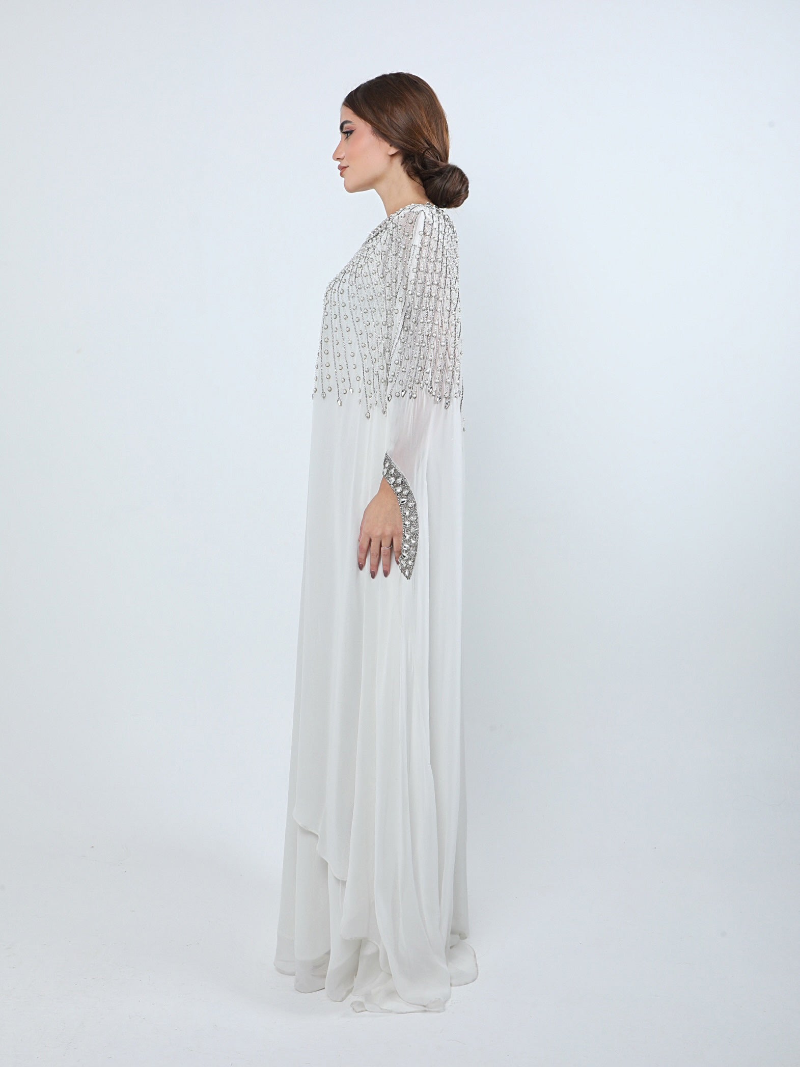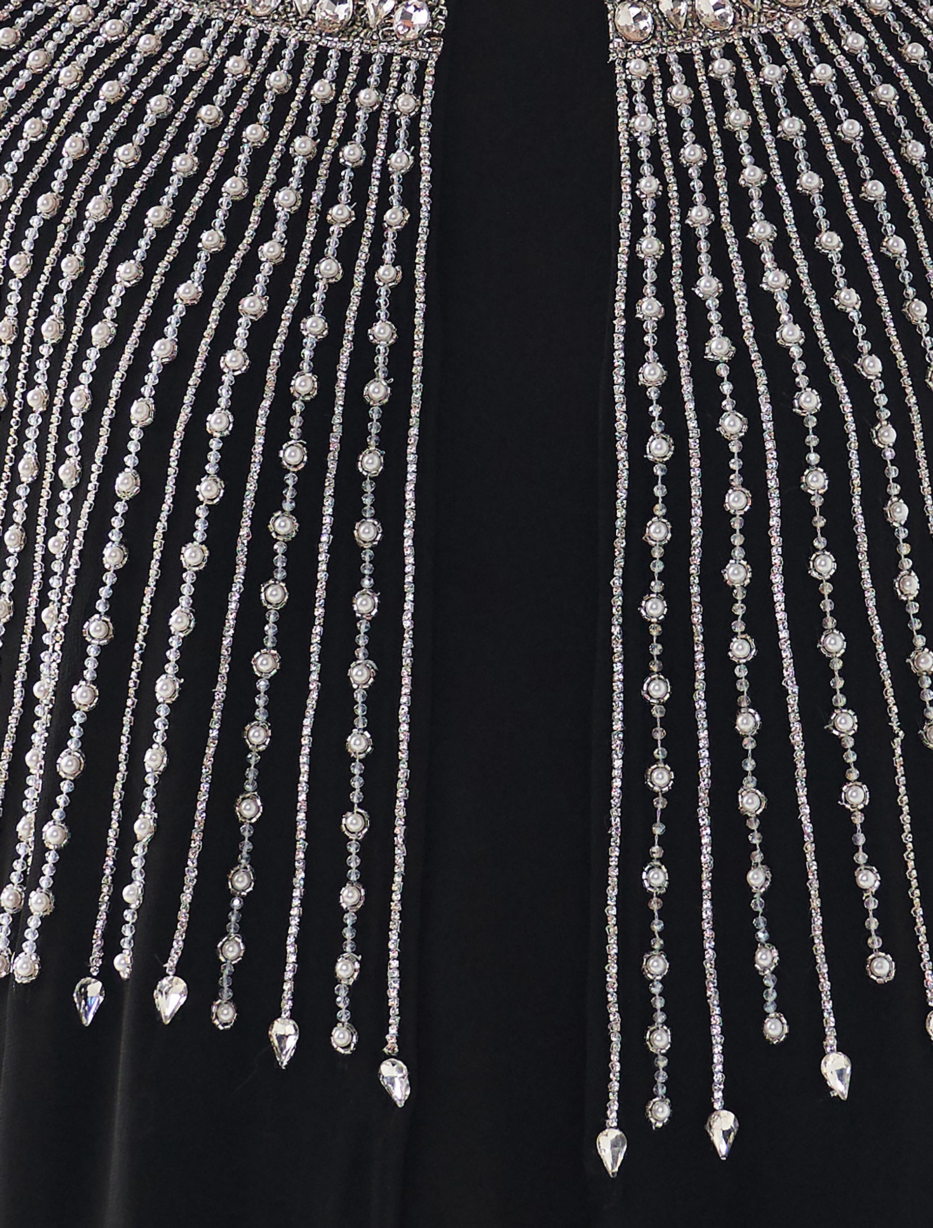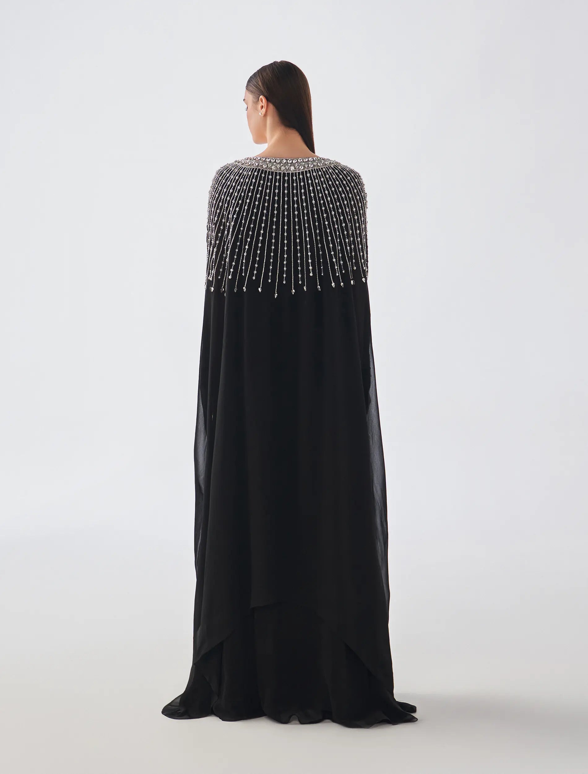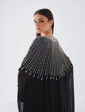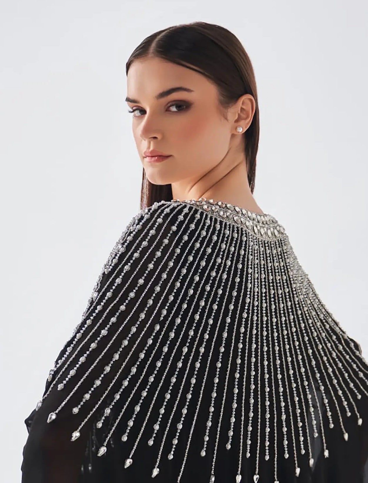 Dazzle in this black dress with tulle accents and artistic silver beaded hand embroidery, offering an eye-catching look at your events. The design of the black dress for women features a fluid, loose fit that falls smoothly on every body shape. This dress with cape showcases intricate hand embroidery, perfect for luxury events and evening parties, specially designed for those who seek subtle elegance and delicately crafted accents.