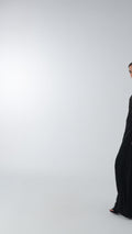 Dazzle with a refined look in this black dress with a short blazer, adorned with stylish hand embroidery for an elegant touch. This maxi dress with a 60-inch length features intricate shimmering embroidery and an embellished round neckline finished by a soft, flared lower silhouette, offering a royal look at your events. Wear this night dress with black beadwork to shine at your formal events and luxury weddings.