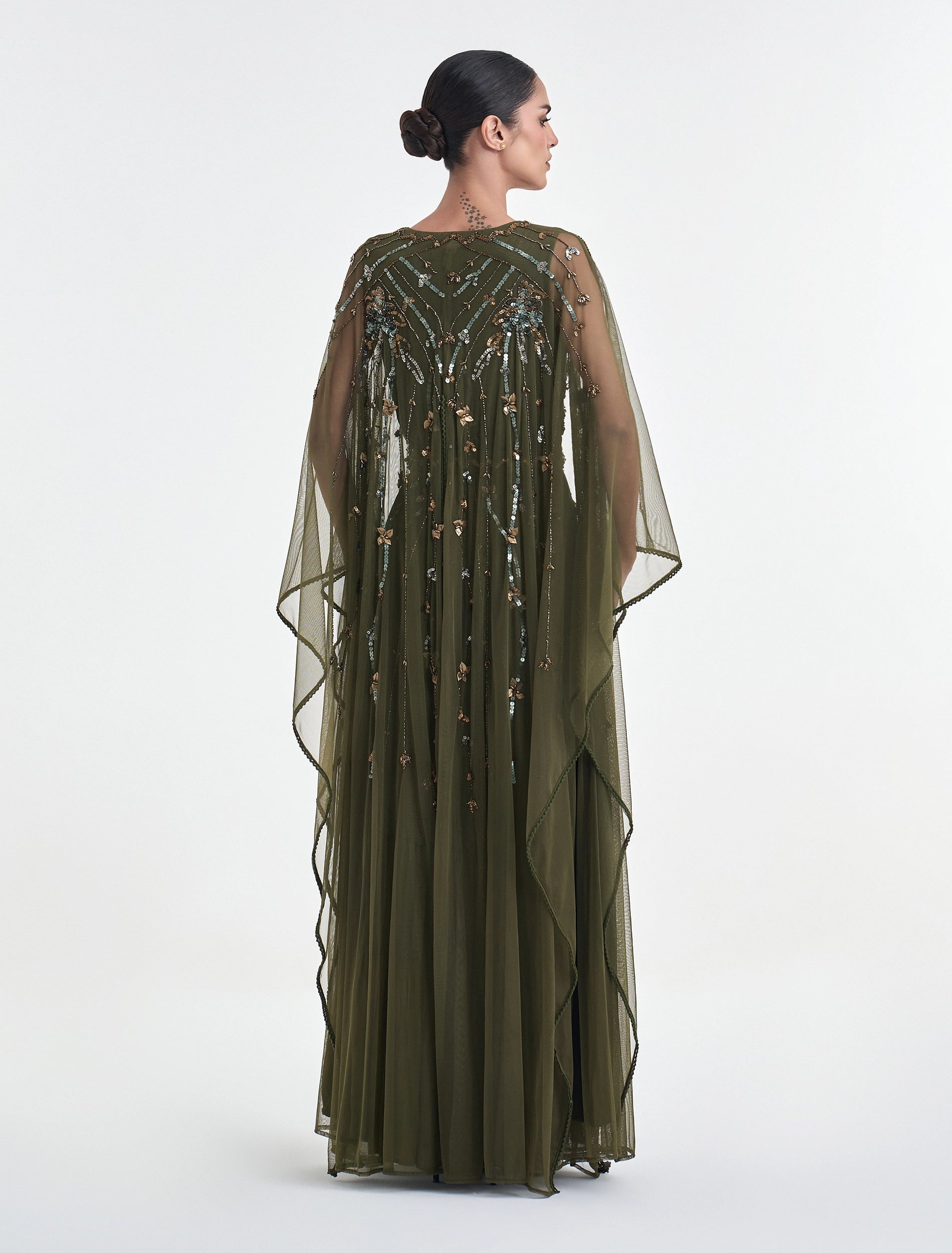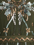 Embrace elegance in a dark olive-green dress that's full of intricate precise details. This elegant evening dress features hand-embroidered antique gold and bronze threads, gracefully extending along the bodice and waist, offering a perfect glow under lights.