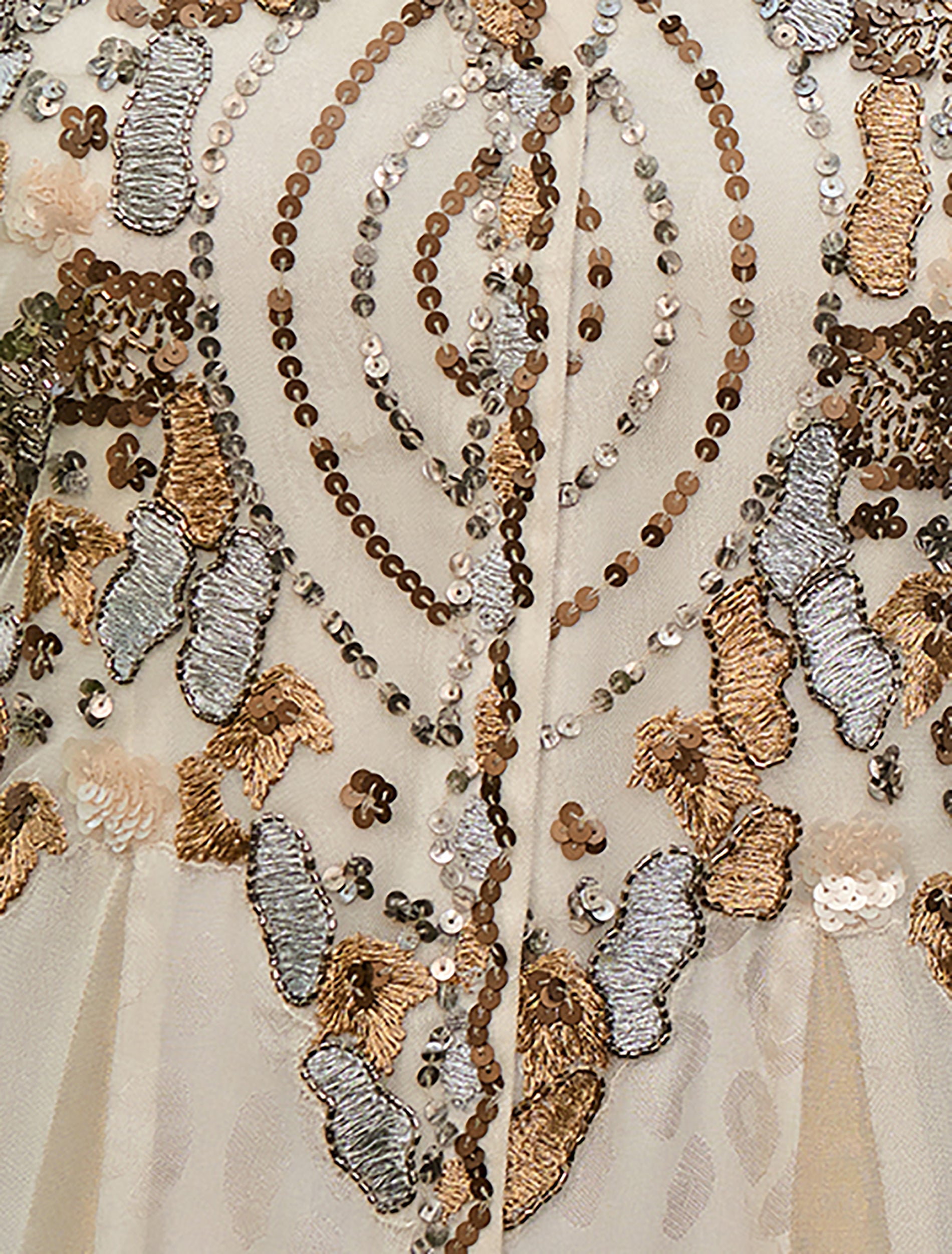 Sleeves: Long lace sleeves with hand embroidery in gold and silver