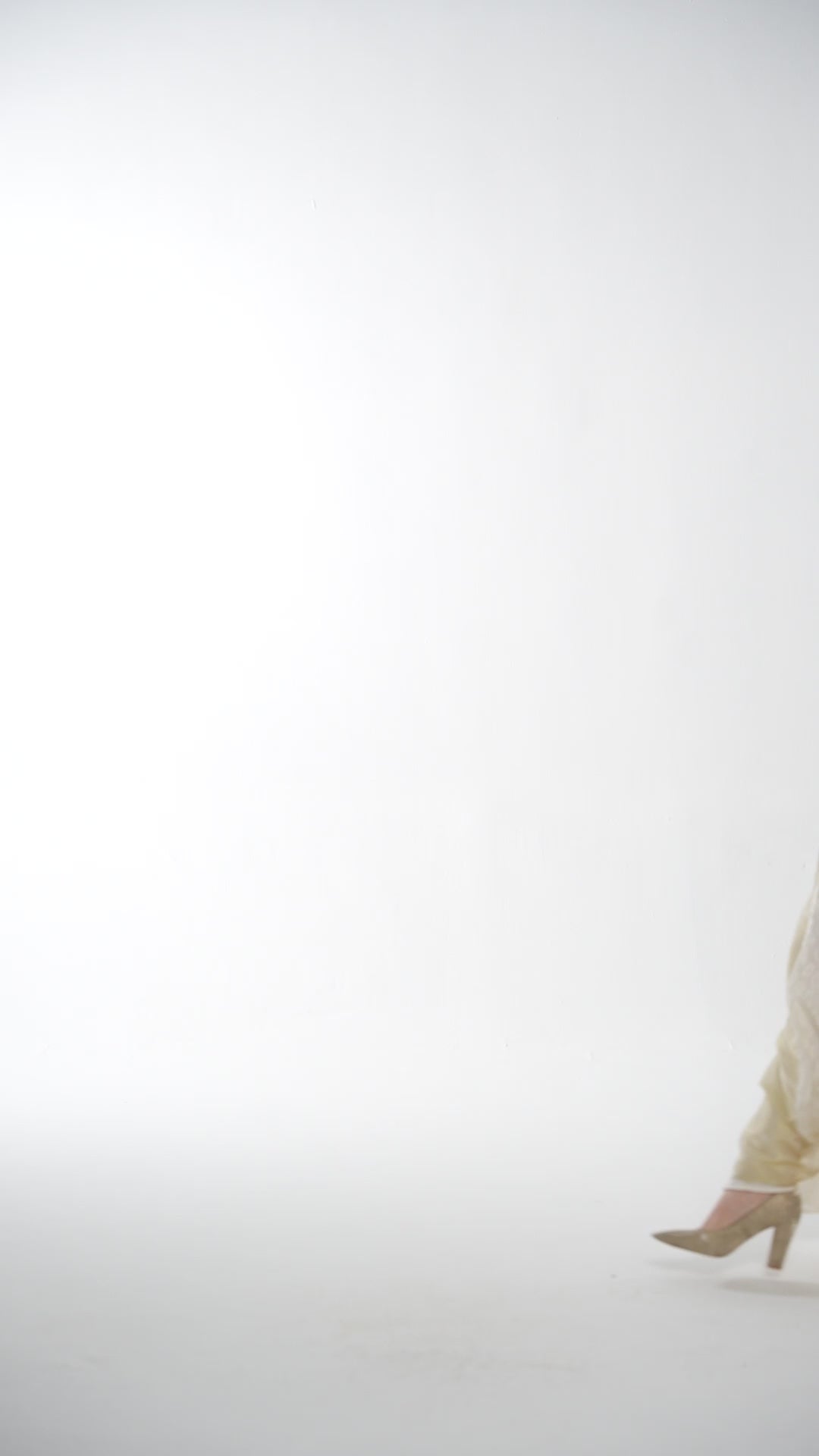 Crafted in an elegant ivory shade, the dress is made from premium jacquard and soft crepe, covered with a shimmering layer of organza that adds a radiant touch under the light.
