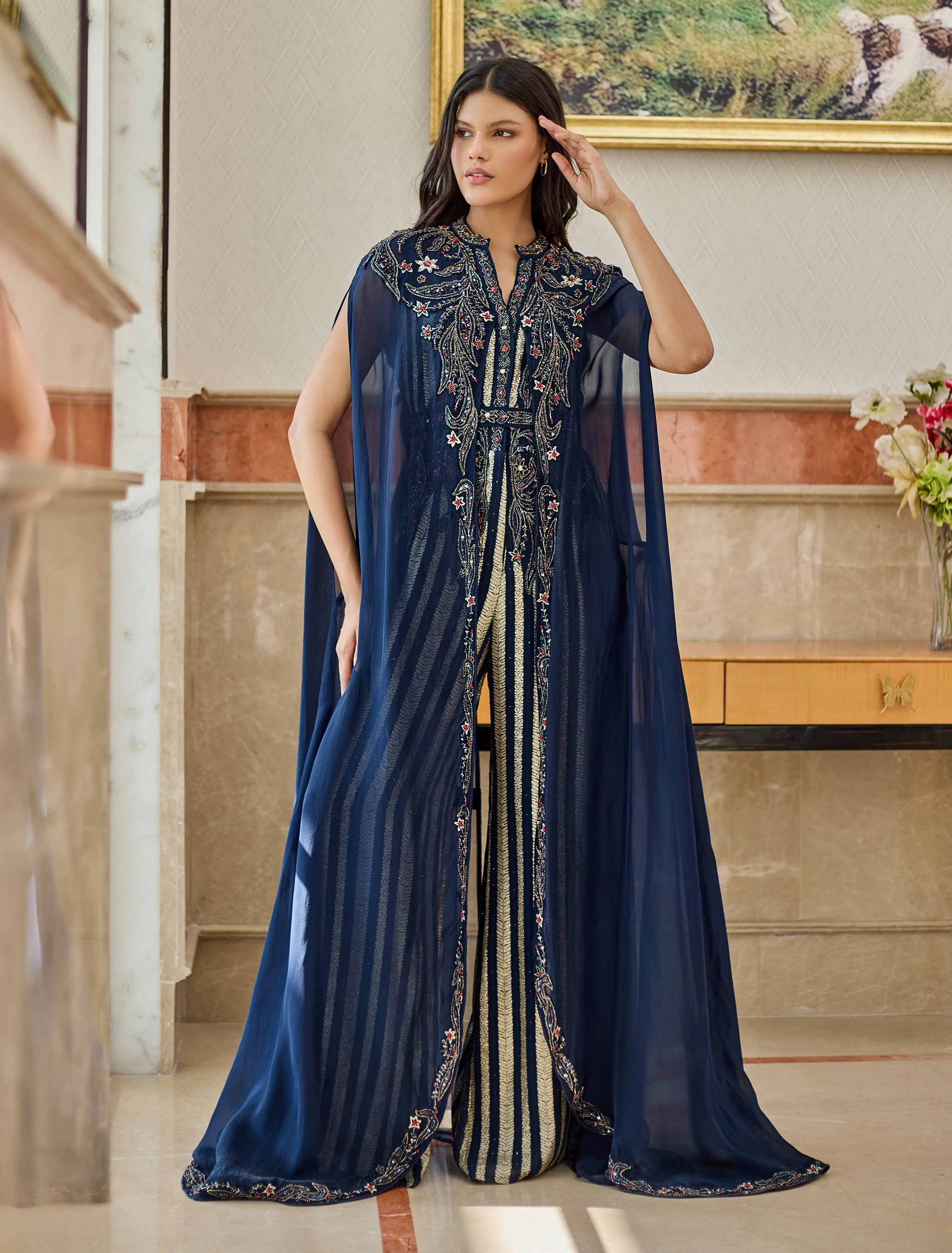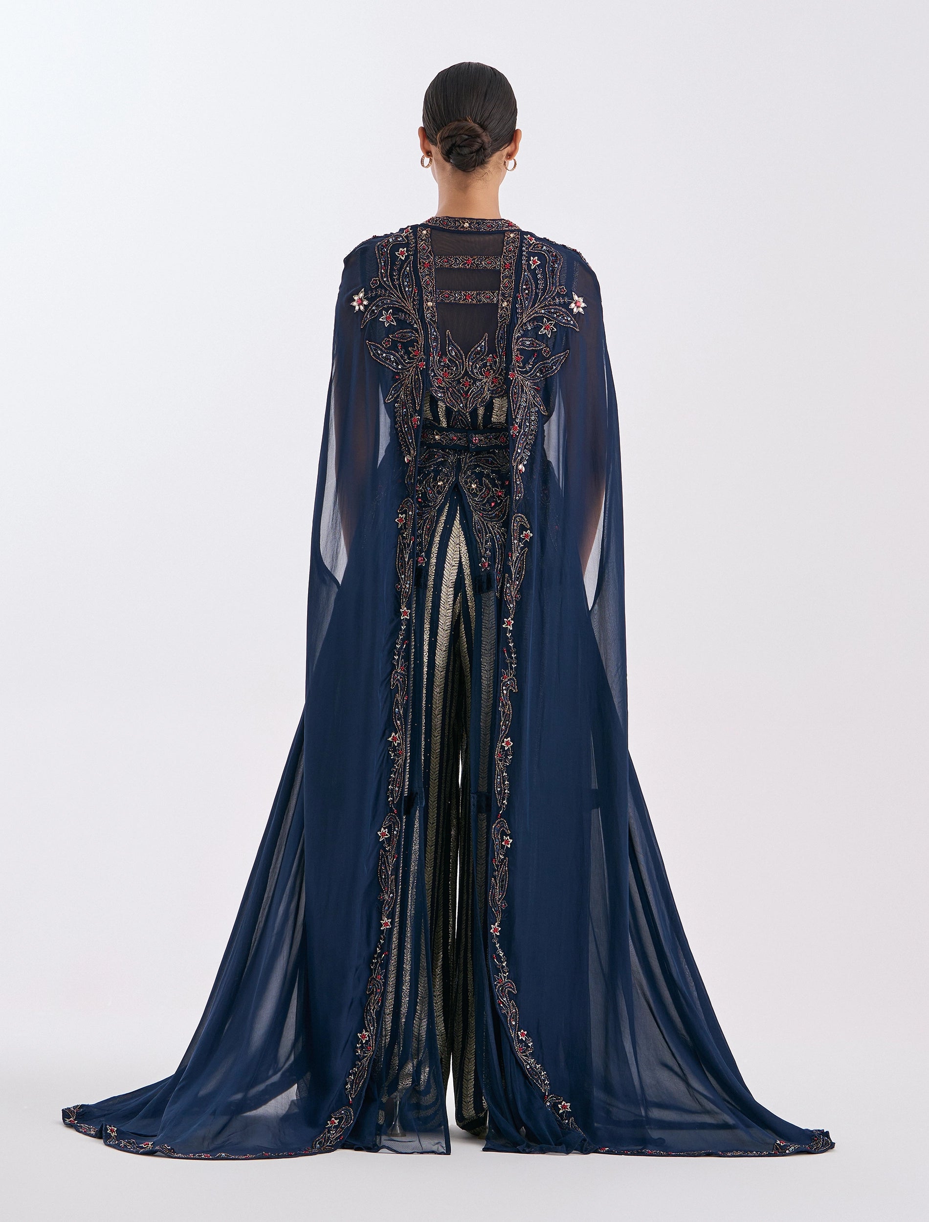 An evening jumpsuit for women with a long cape, blending elegance and luxury, featuring a two-piece set with an embroidered waist belt and gold metallic embellishments, the evening jumpsuit stands out with a touch of glow. The cape is designed with a flowy design featuring open shoulders and back, gracefully highlighting the body's curves.