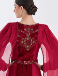 The fuchsia velvet evening dress features a flowing design that stands out with elegance and grace, ideal for parties and elegant evening events. This modest evening dress measures 60 inches in length. Shop this long-sleeve evening dress with a tulle cape today, perfect for women who seek trendy elegance and modest style paired with a luxurious, balanced look. Stand out with a confident and captivating look now!