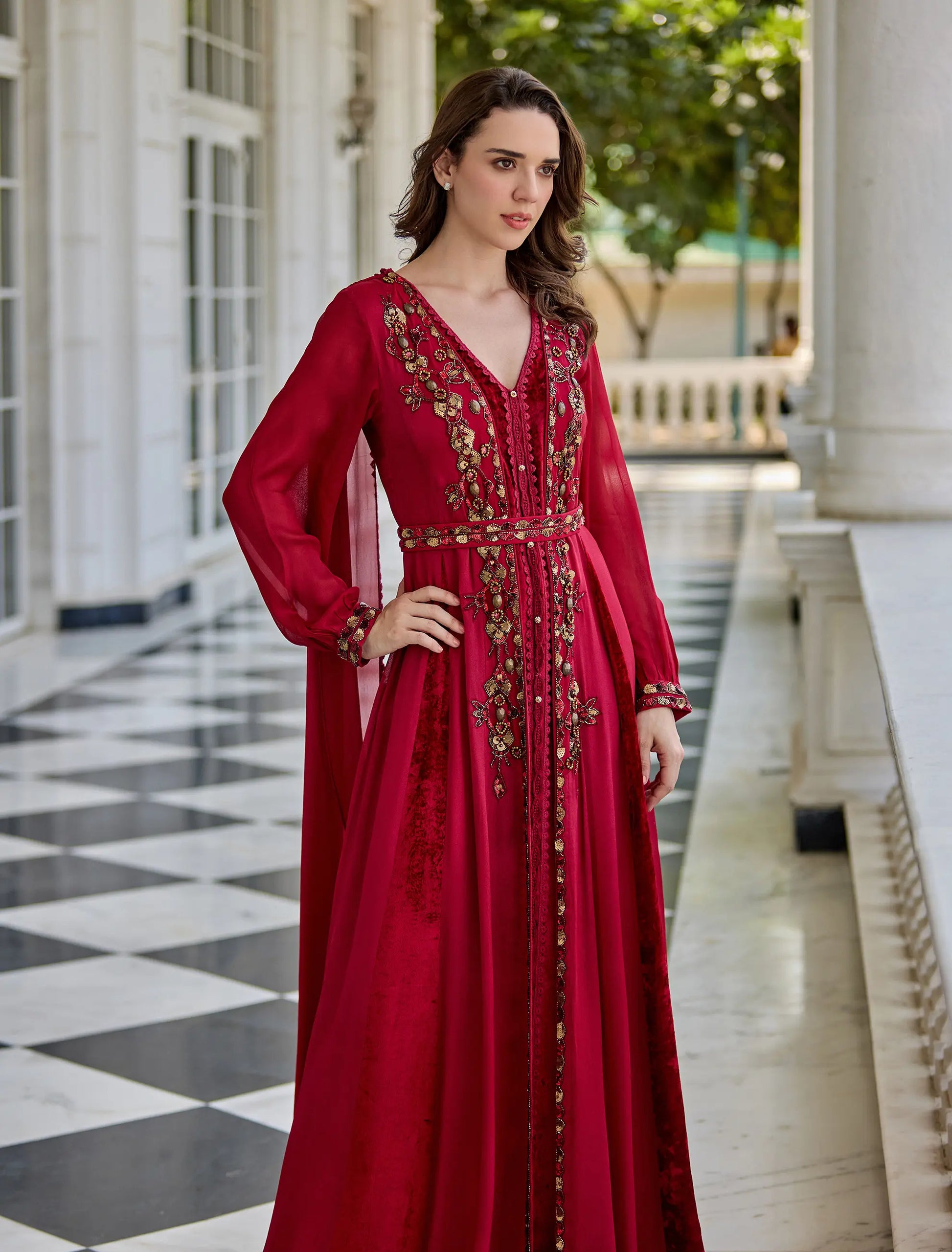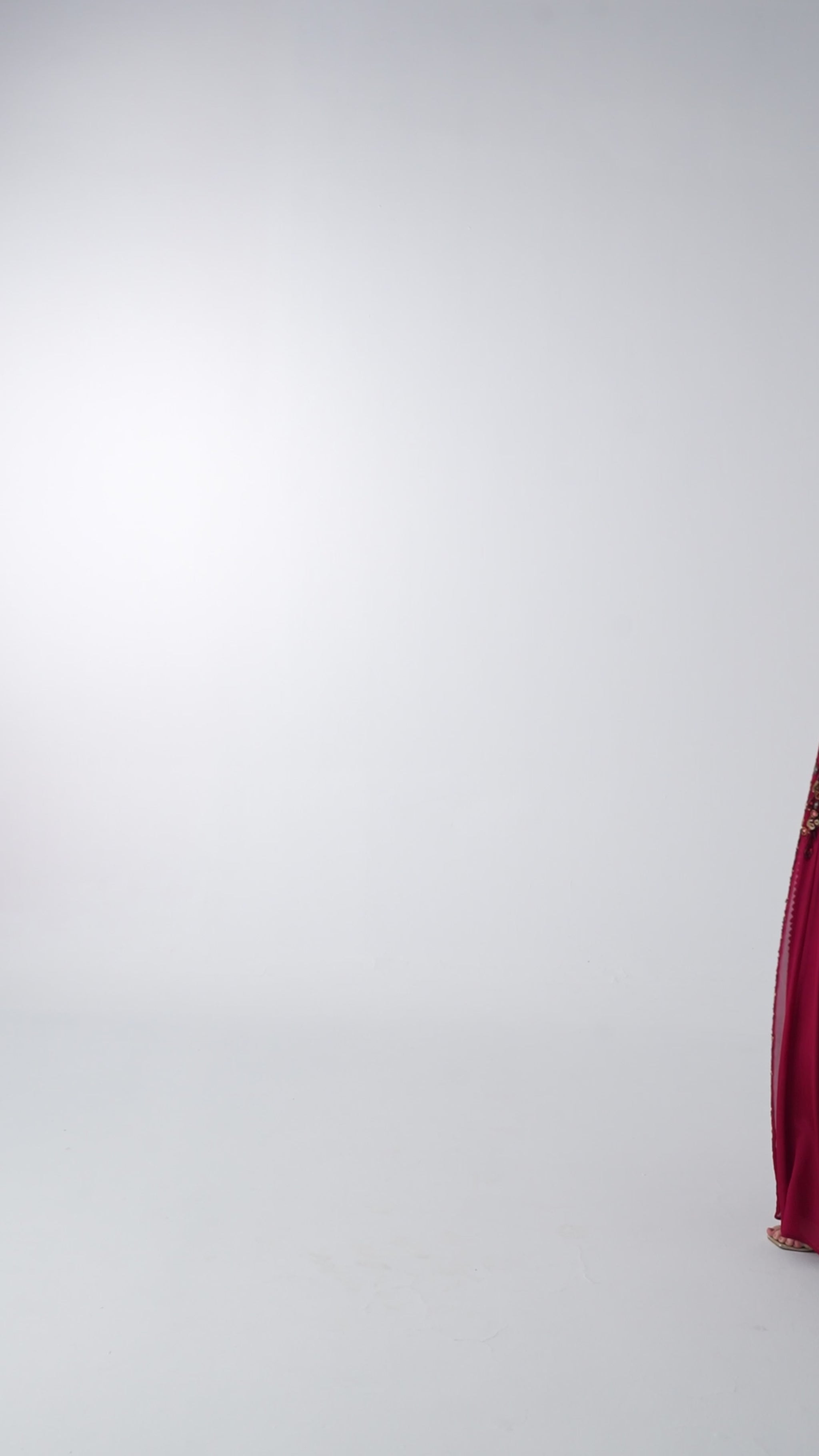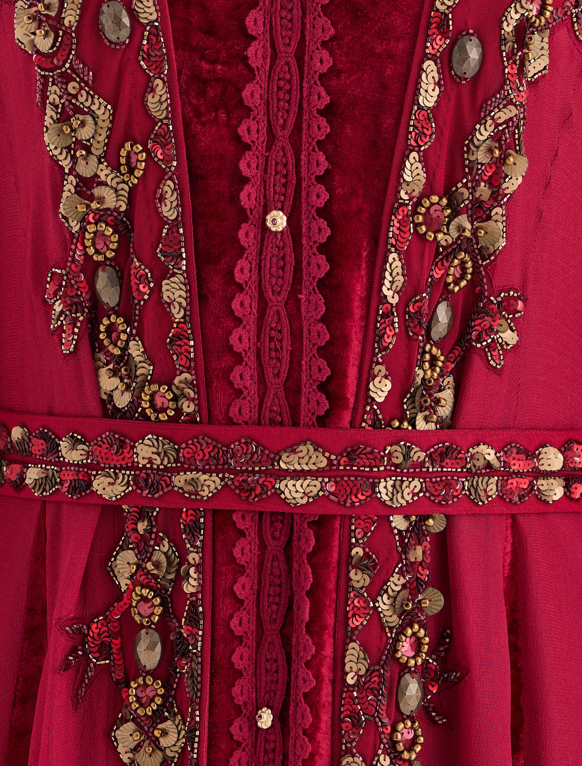 - Sleeves: Long sleeves with embroidered cuffs, finished by long flowing cape sleeves with soft ends, complement the modest evening dress