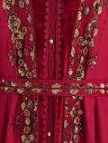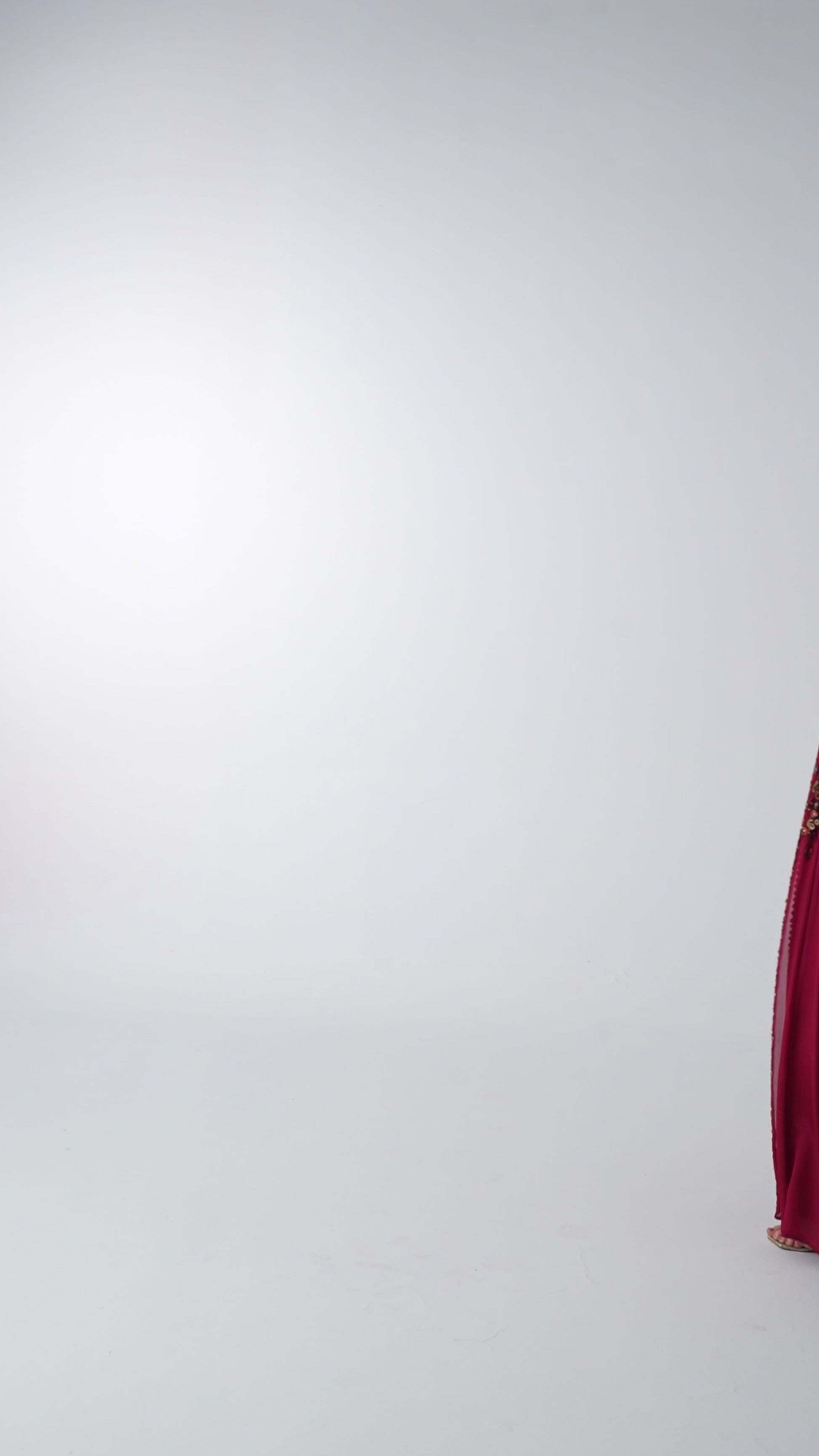 Shine in this fuchsia velvet evening dress from Shalky's luxury evening dress collection, featuring intricate hand embroidery in metallic and vibrant fuchsia.