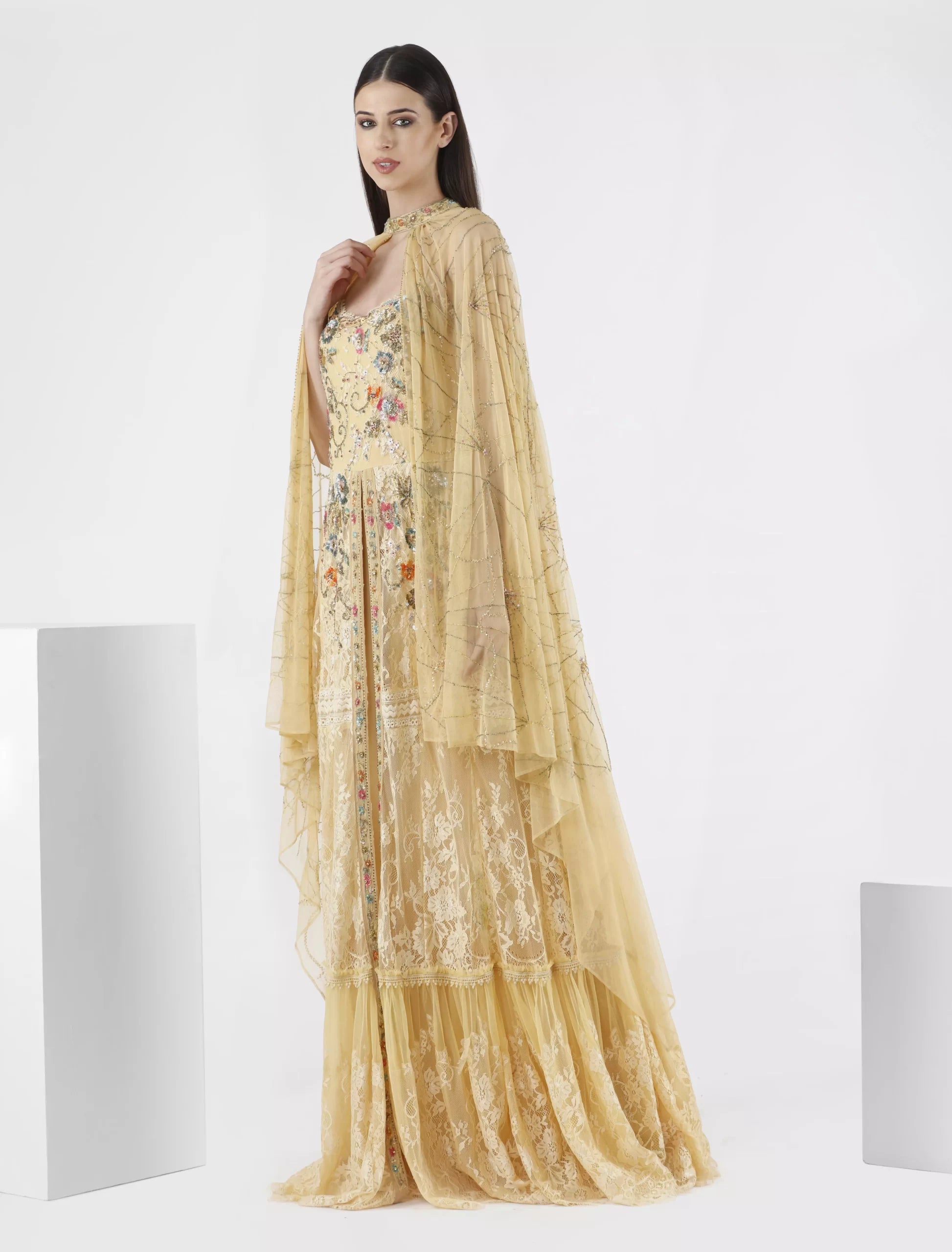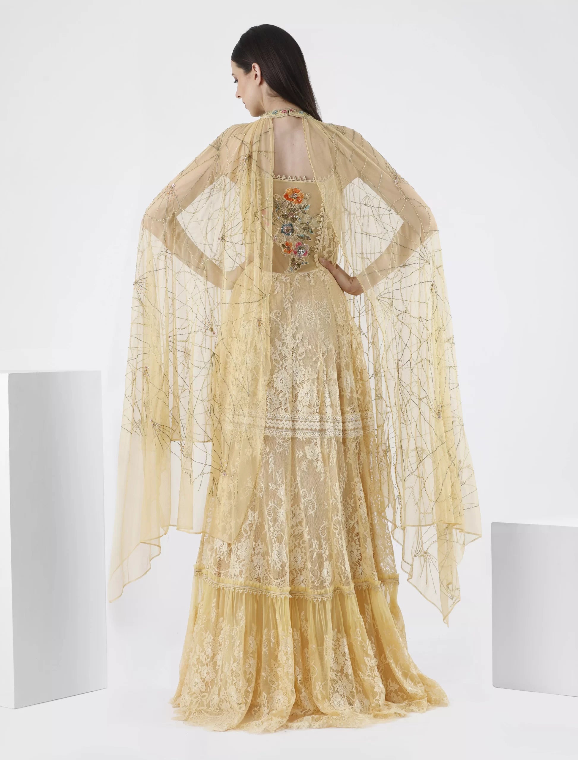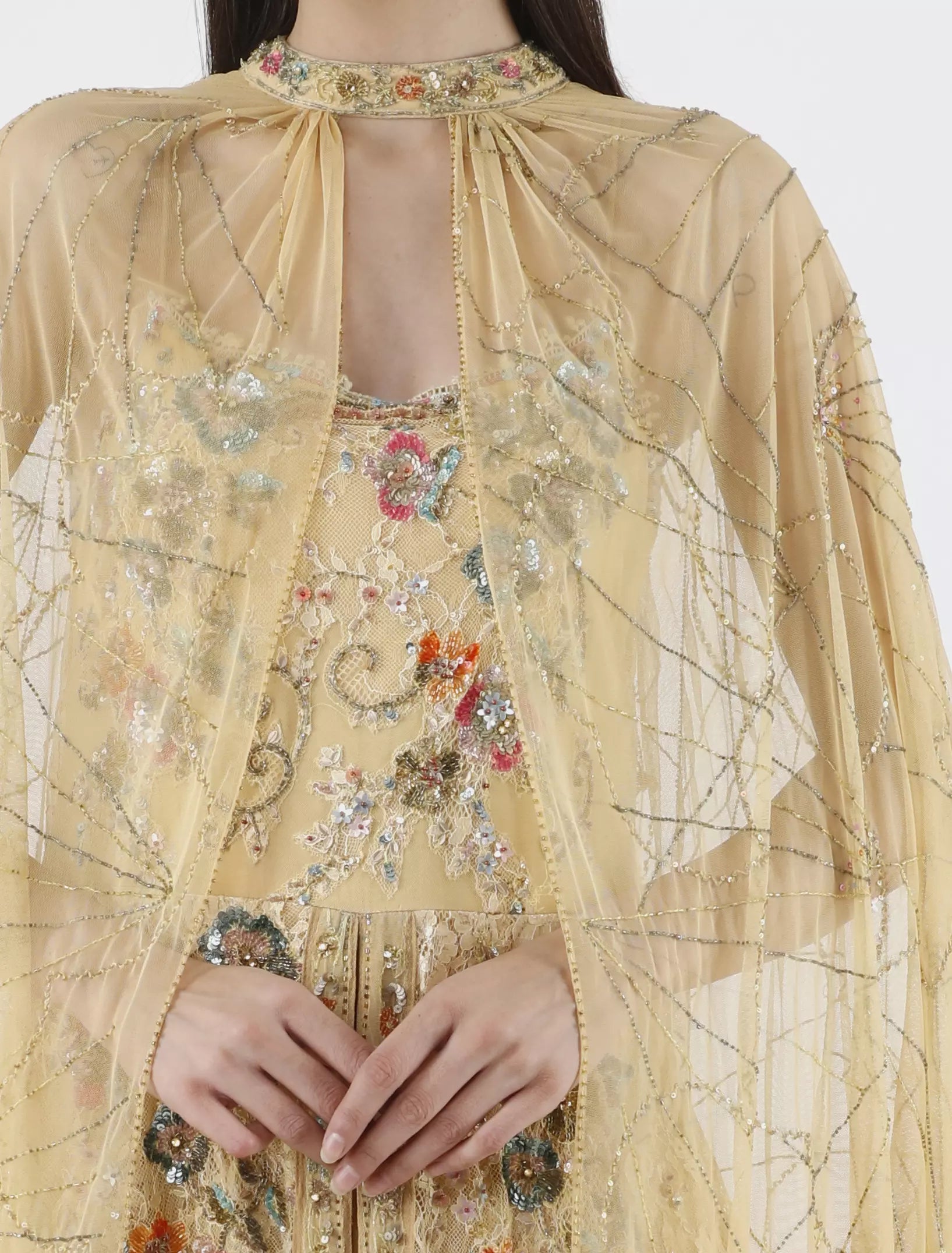 - Sleeves: Wide, sheer shawl that covers the shoulders and arms