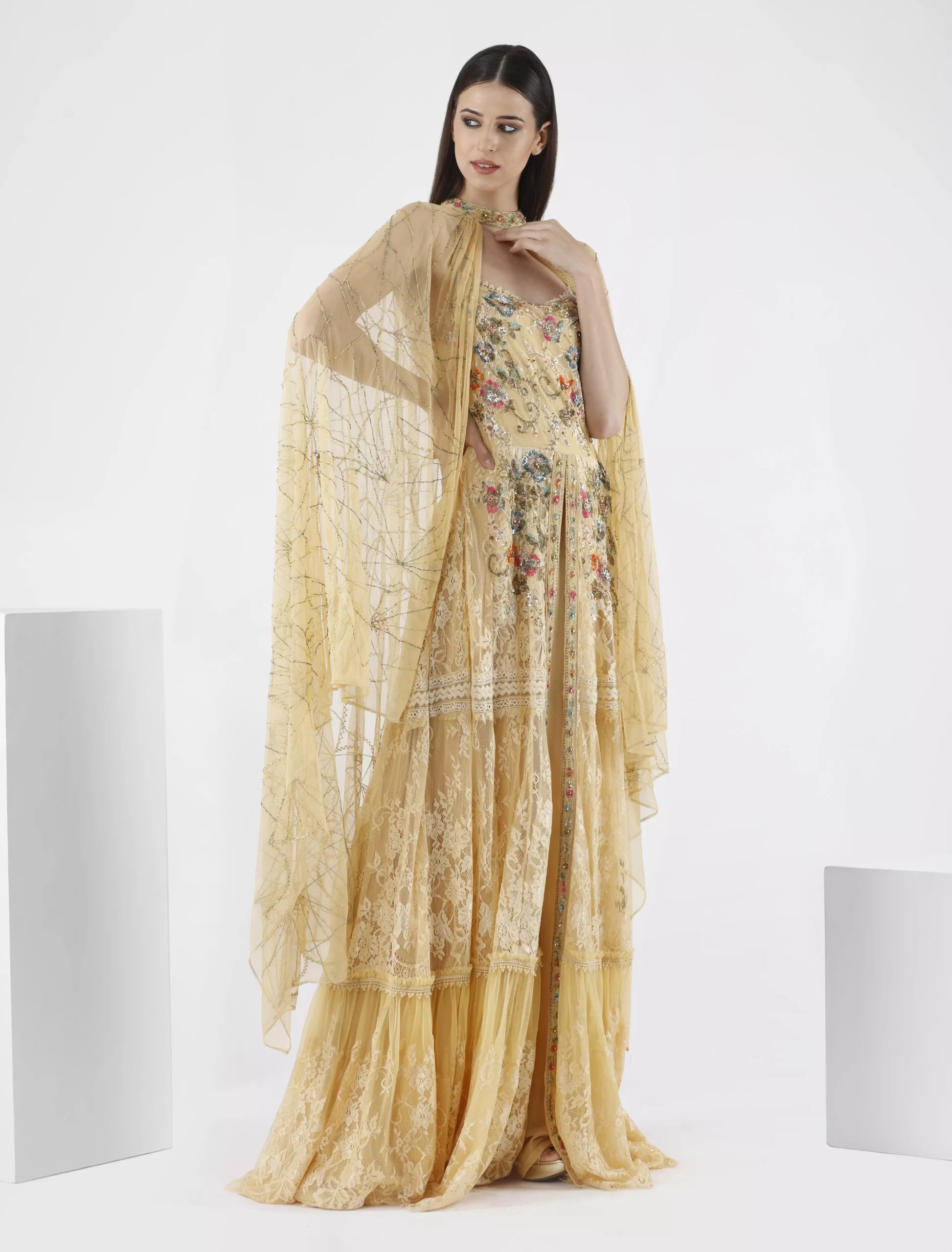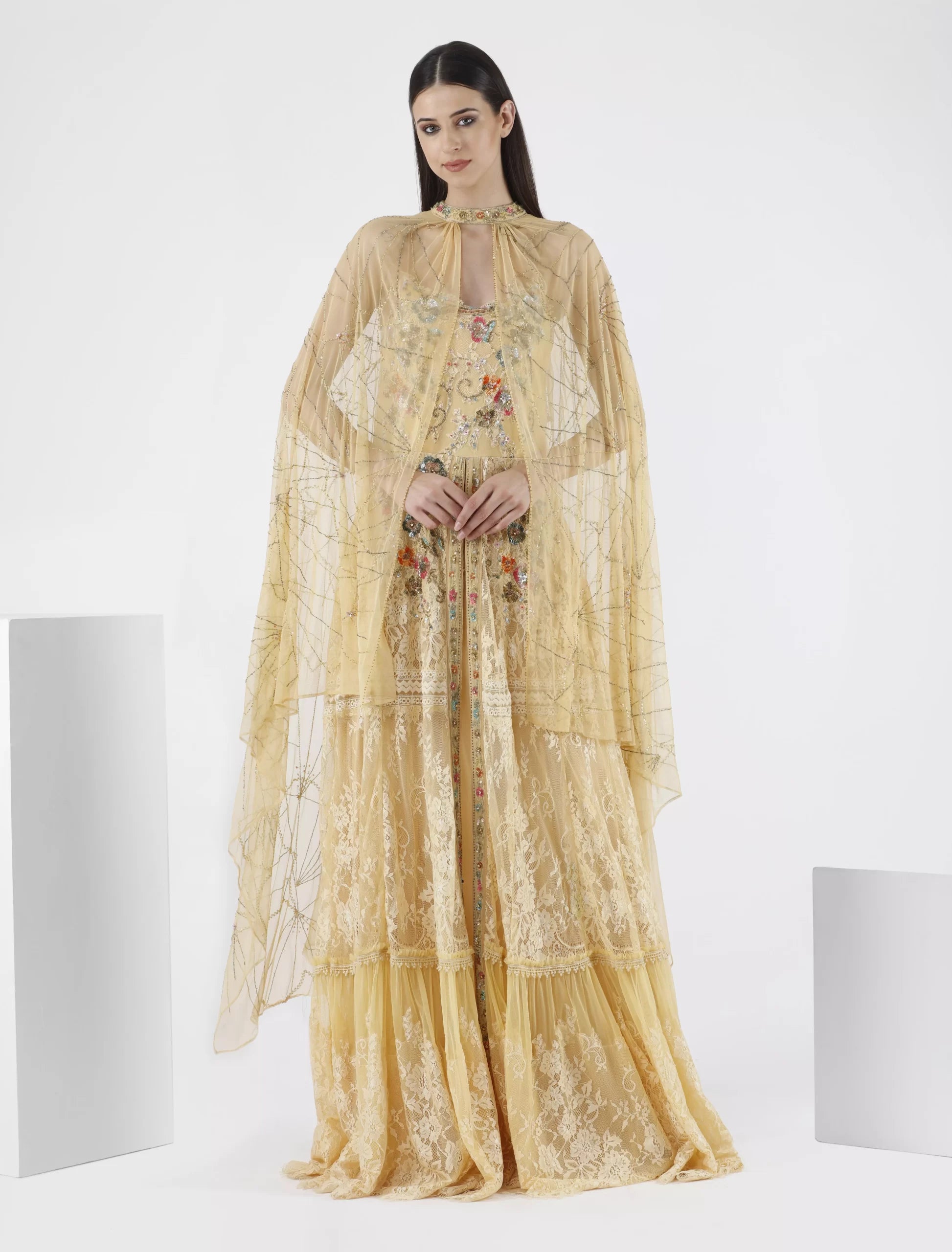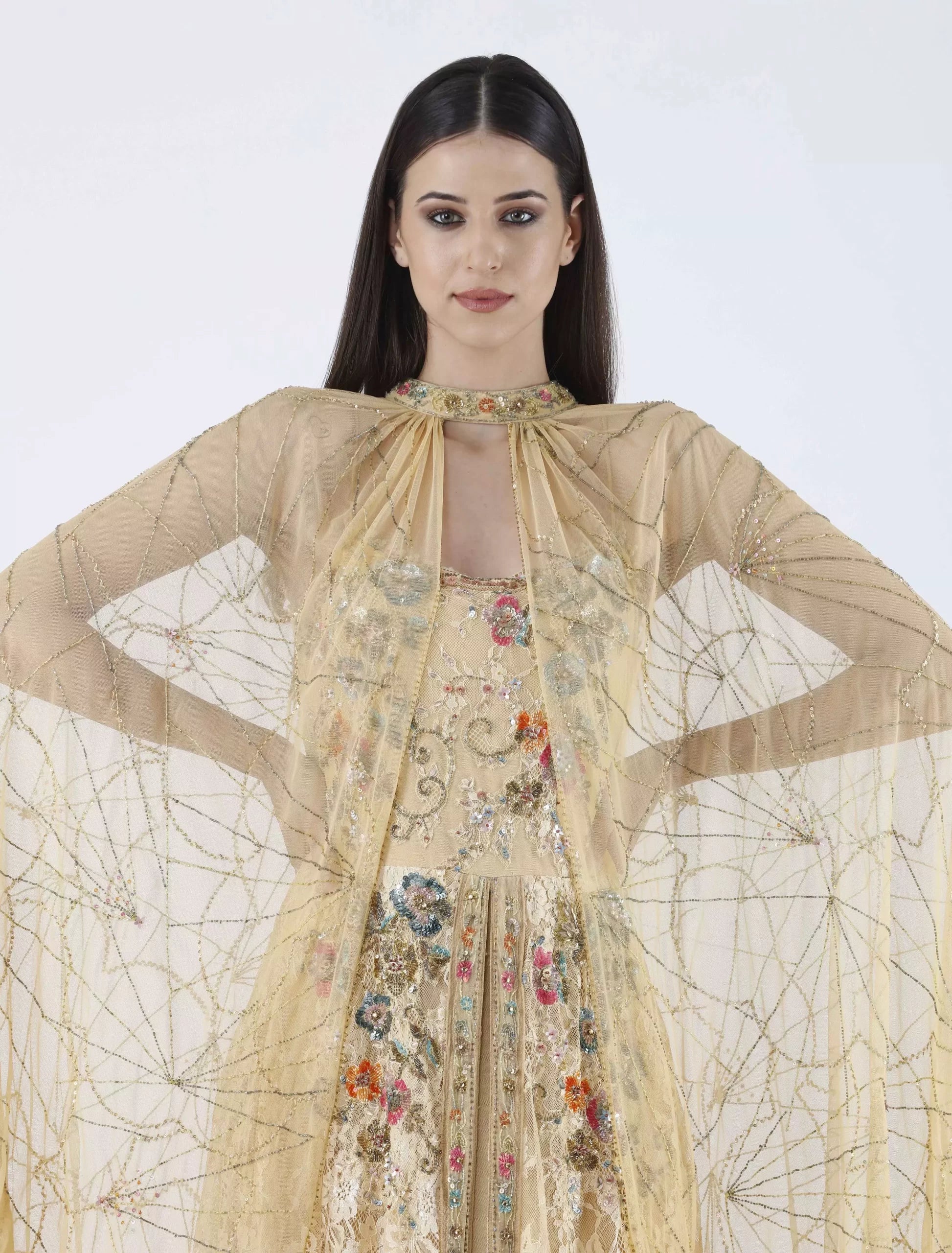 Shalky "Gala" Chiffon Evening Dress combines luxury and femininity in an exceptional design perfect for elegant events. The dress features a closed neckline with a front slit, and its wide, sheer shawl sleeves elegantly cover the shoulders. The dress is 60 inches long and made of layered lace, decorated with vibrant floral embroidery in bright colors and gold embellishments that extend from the bodice to the lower part.
