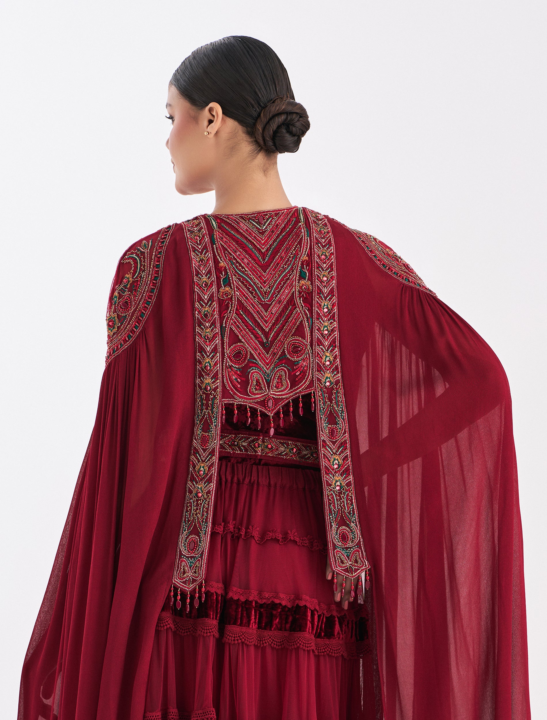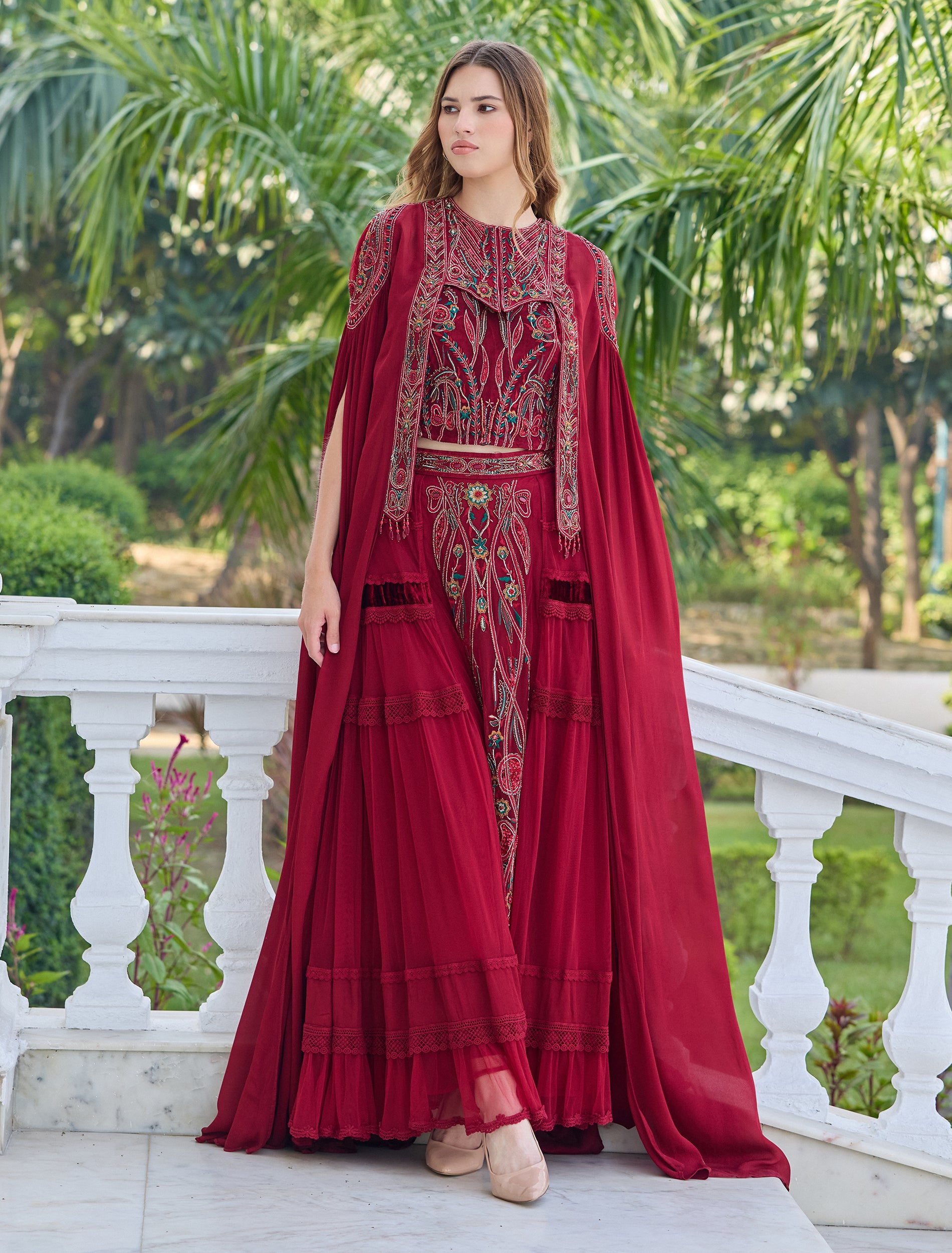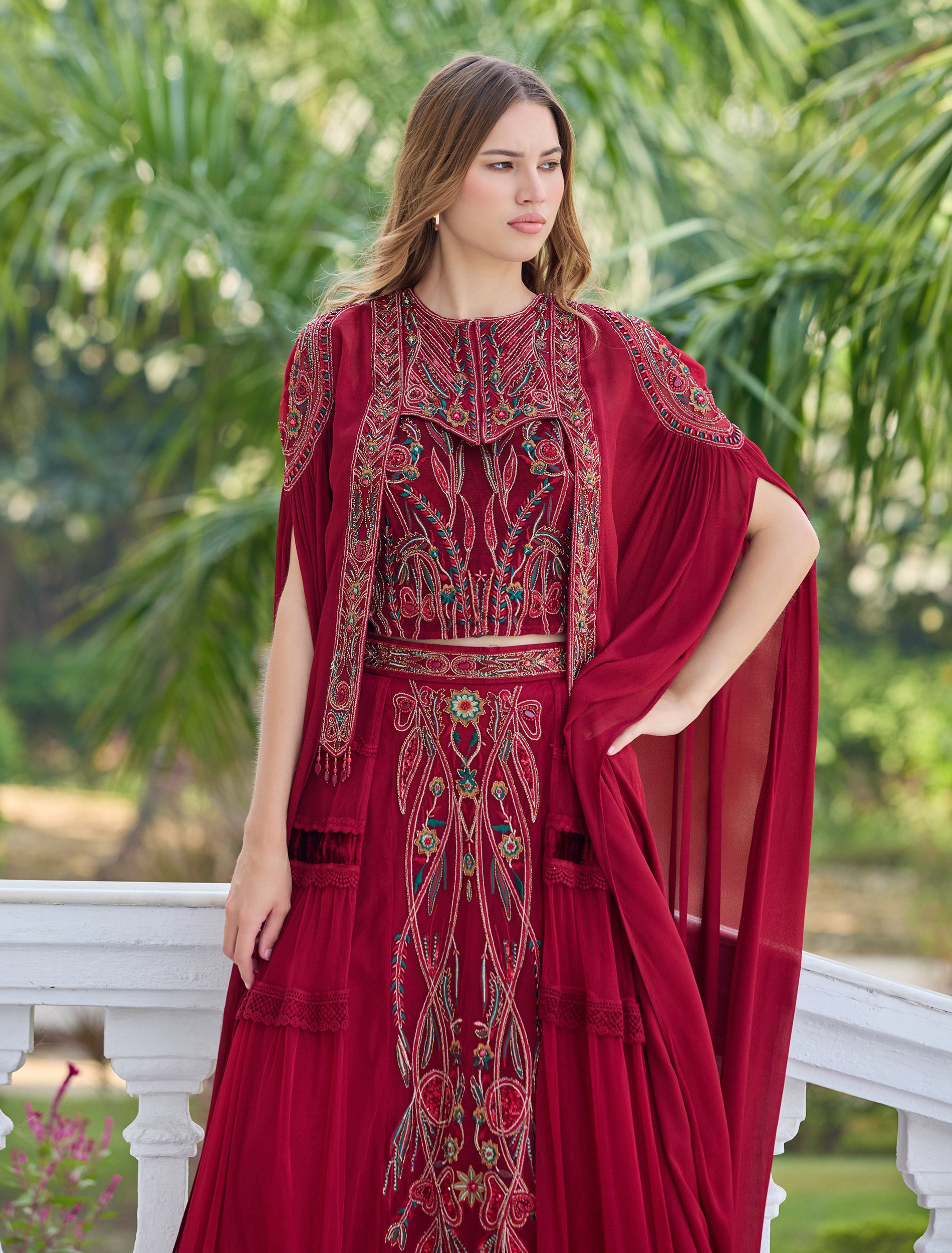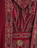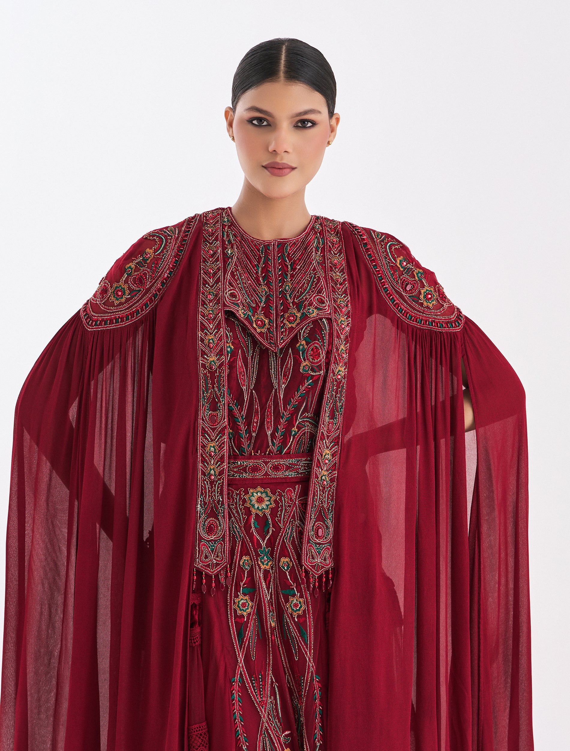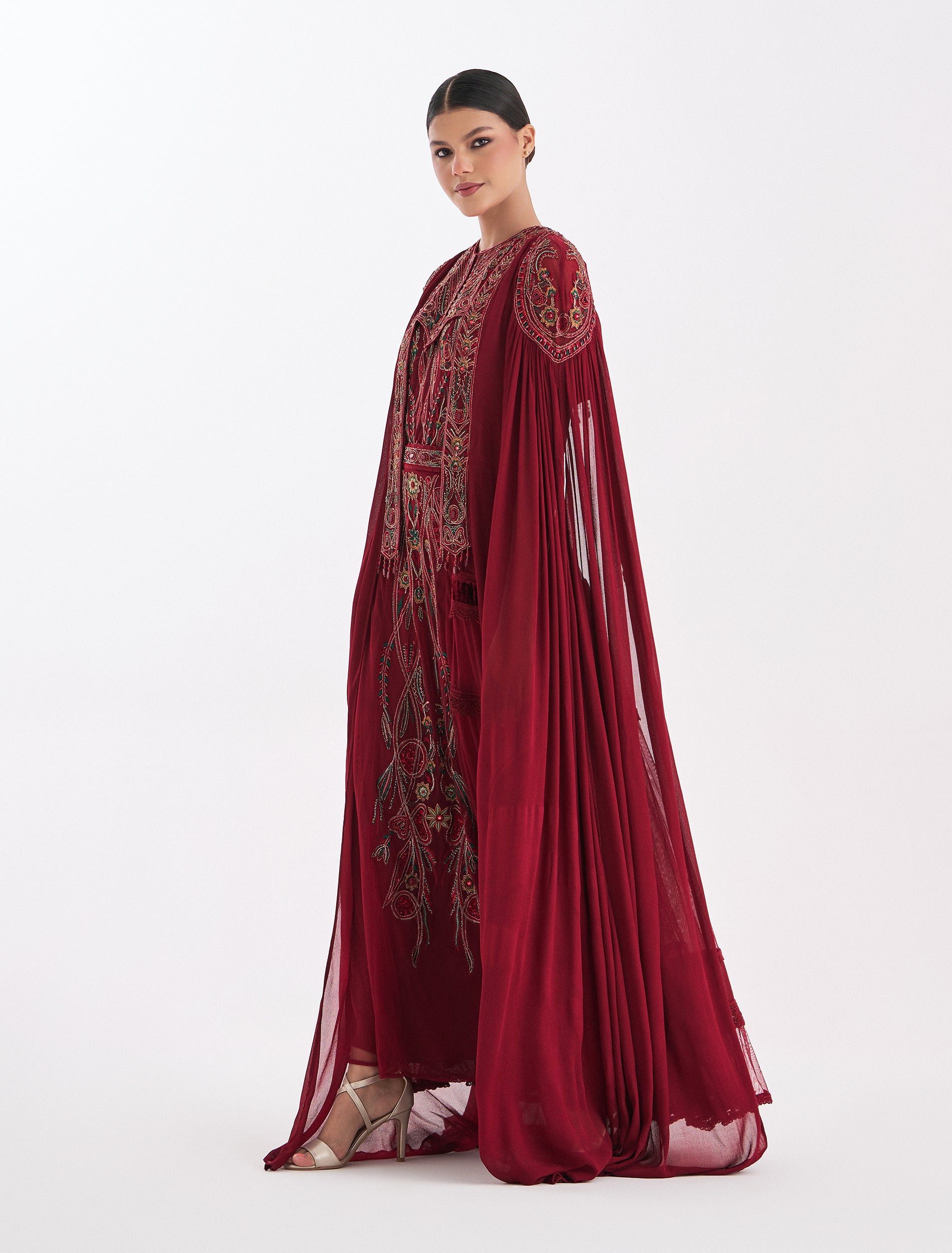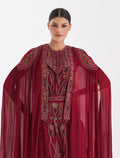 A three-piece evening set featuring a hand-embroidered maxi dress, complemented by a matching inner piece and a light overlay. The front embroidery adds a refined touch, while the Round-neck design enhances feminine elegance — perfect for special occasions and events.