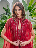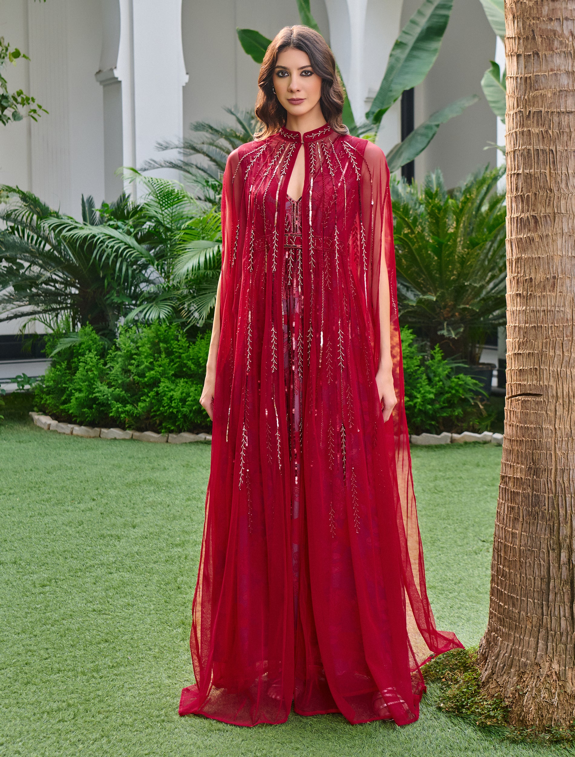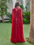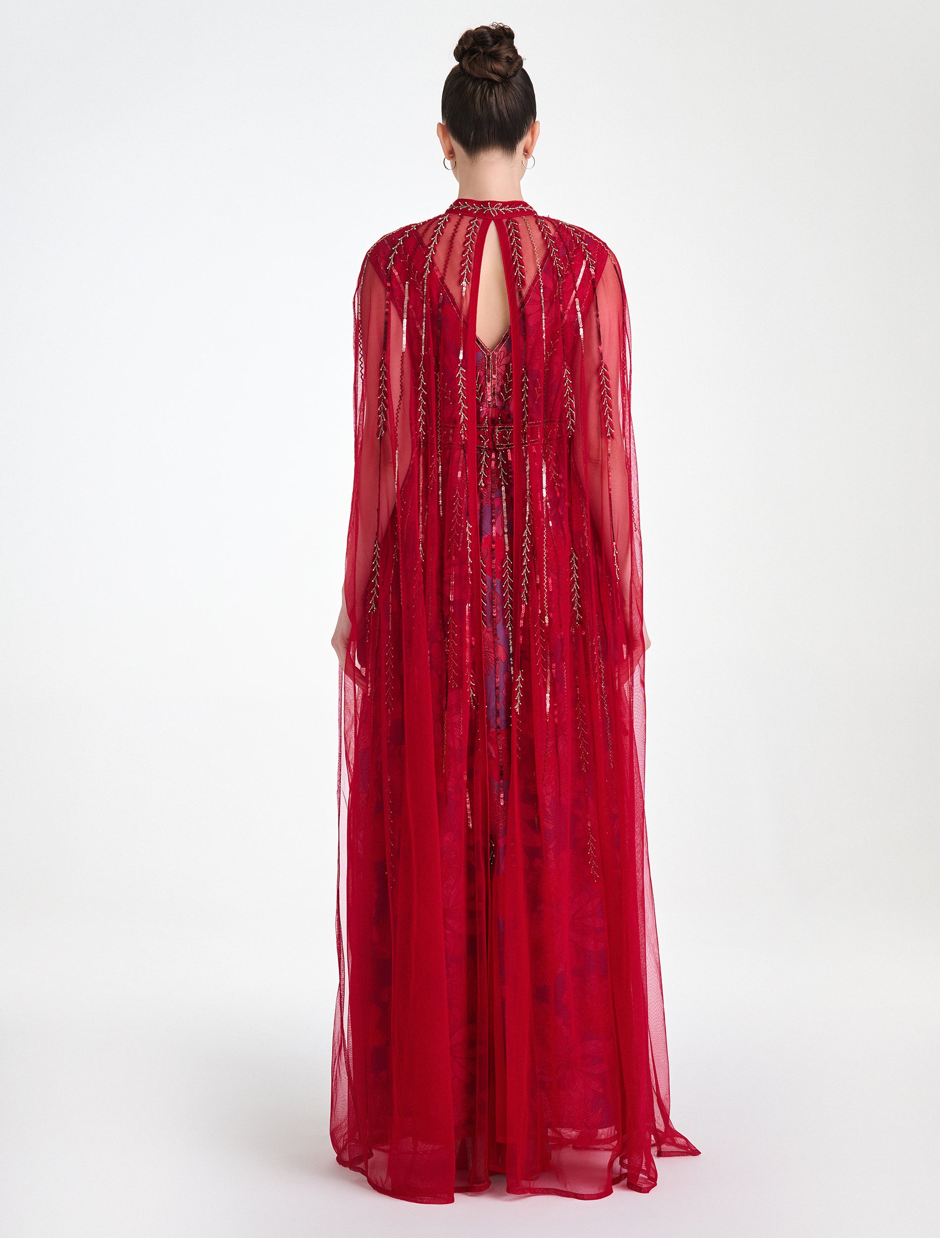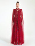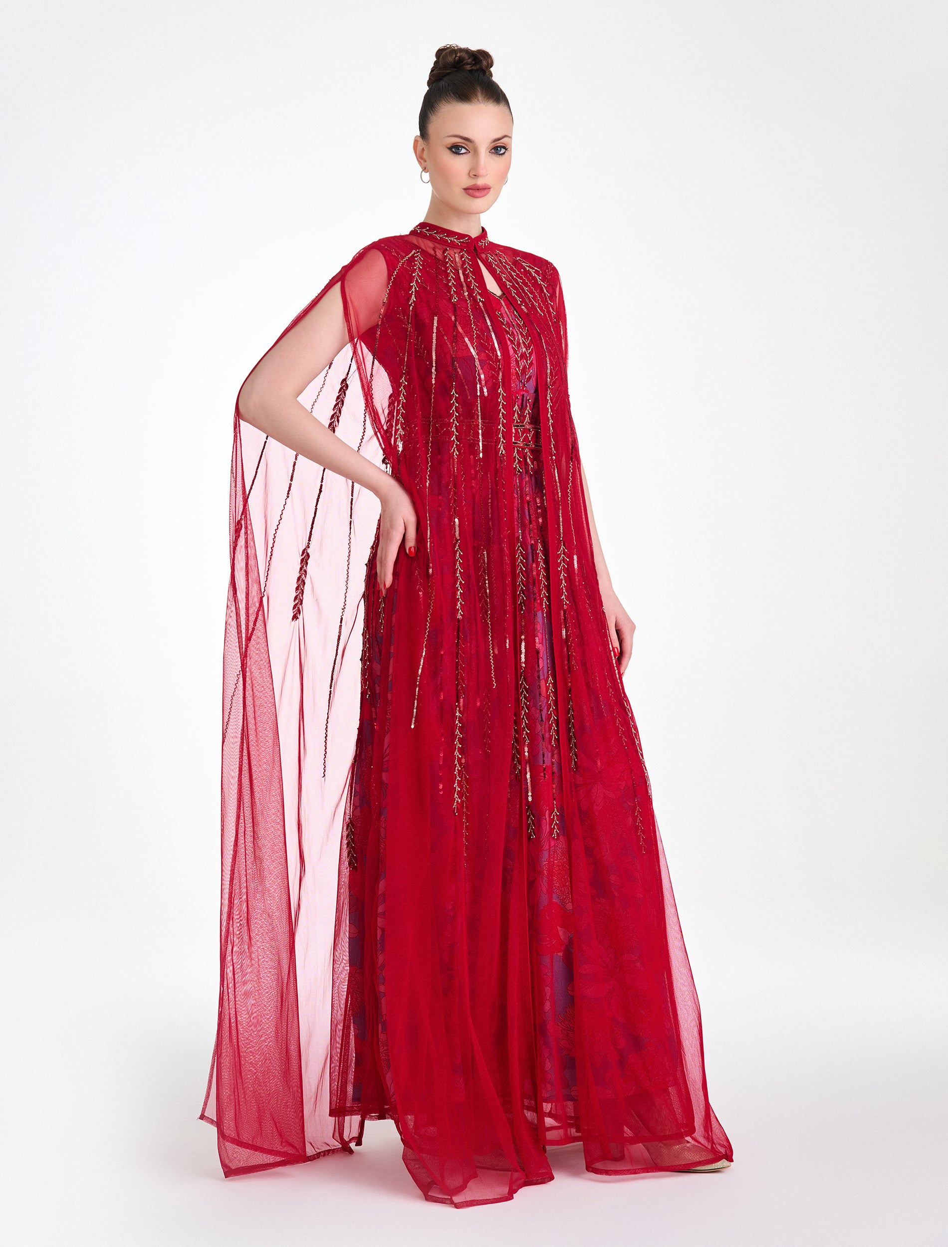 Hand-Embroidered Fuchsia Evening Dress with a Long Cape