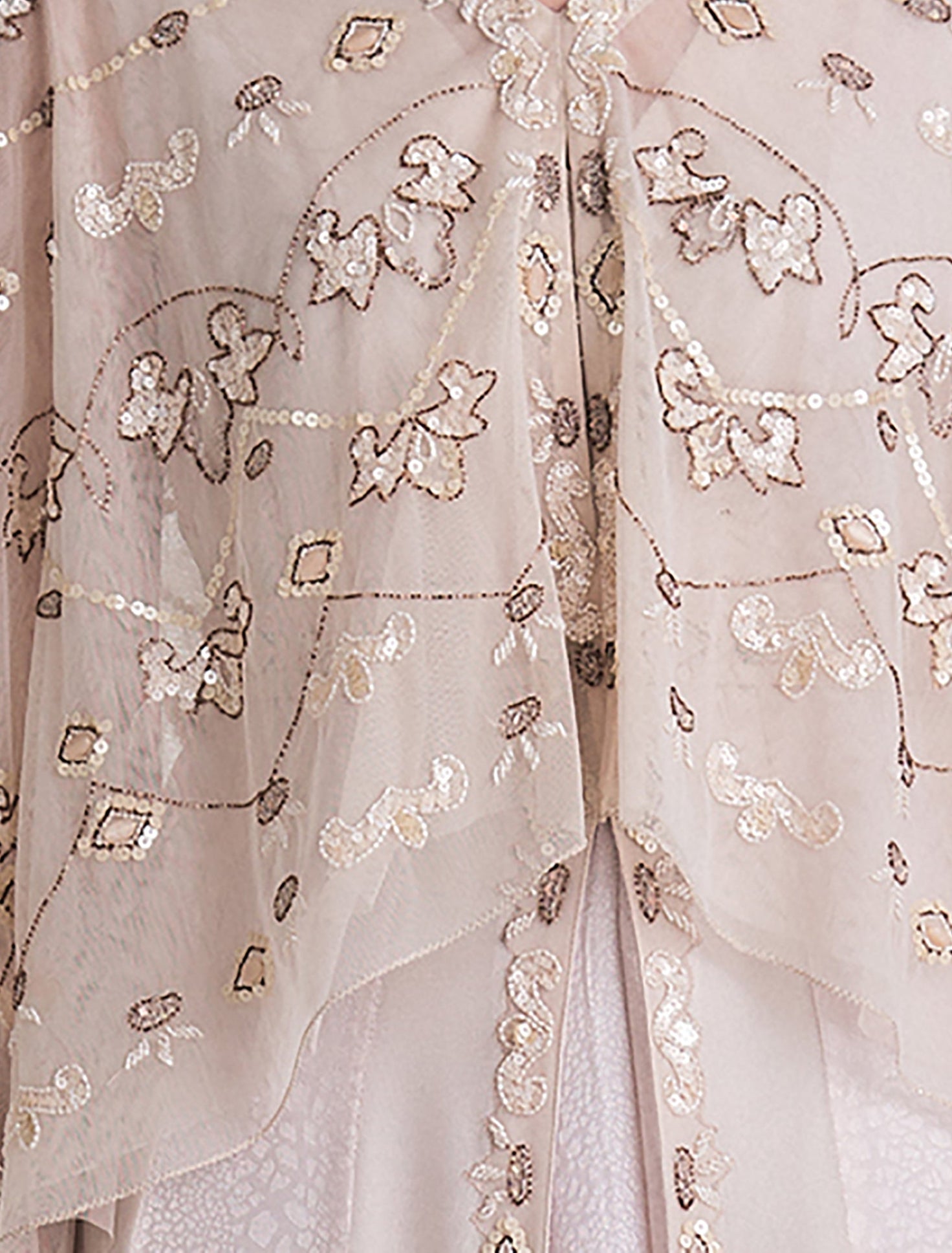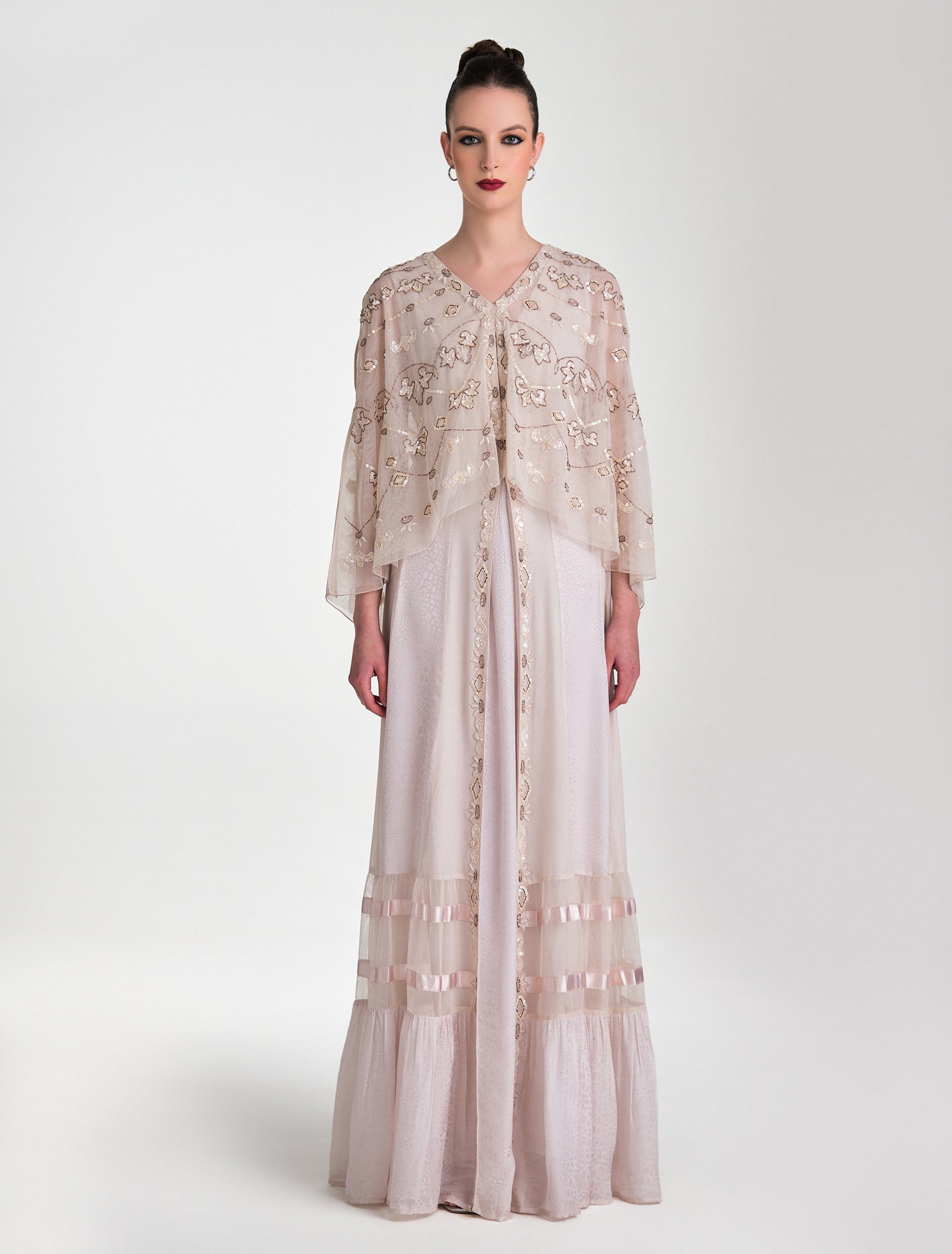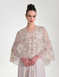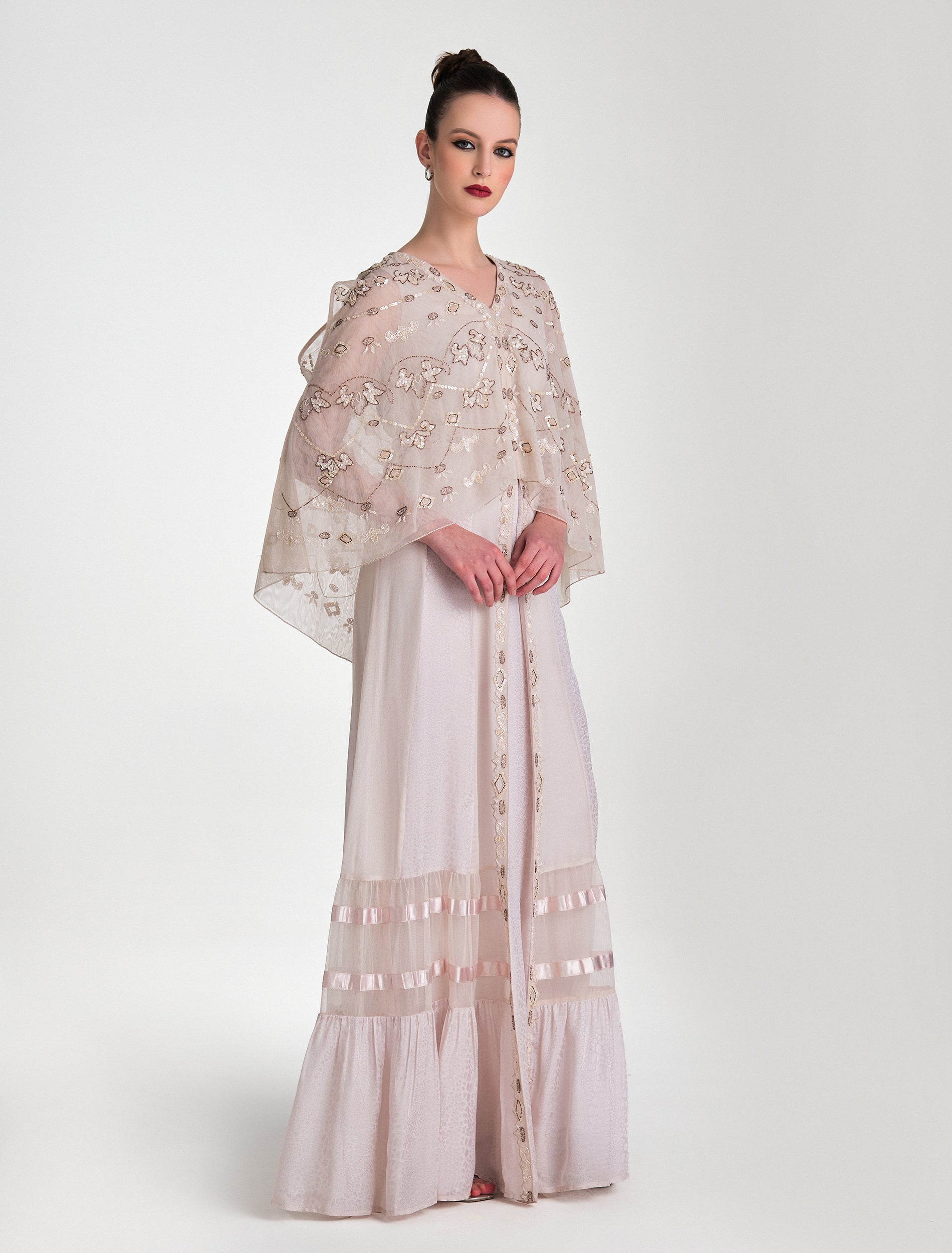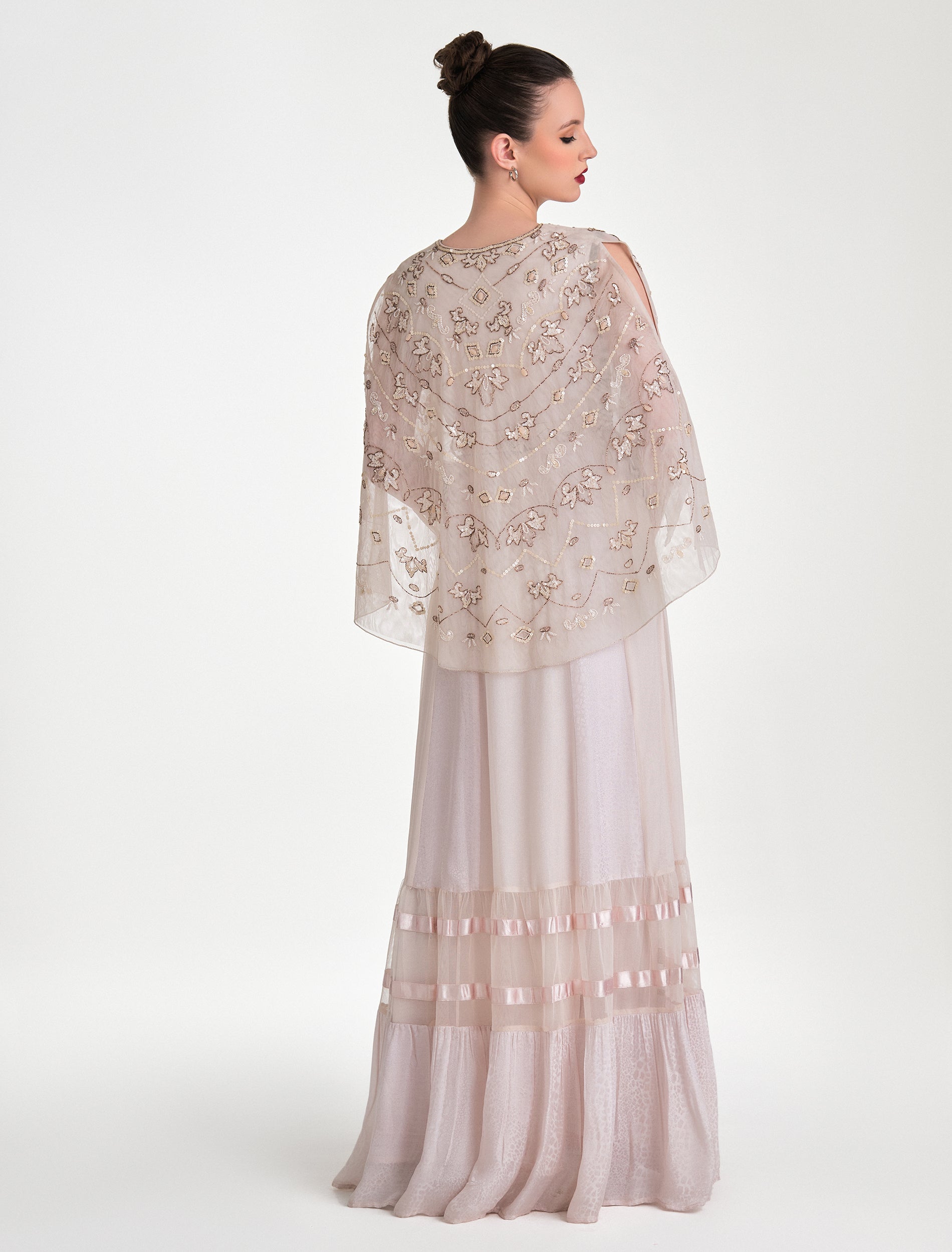 - Bodice Design: Loose cut with a short, open chiffon cape reveals the shoulders