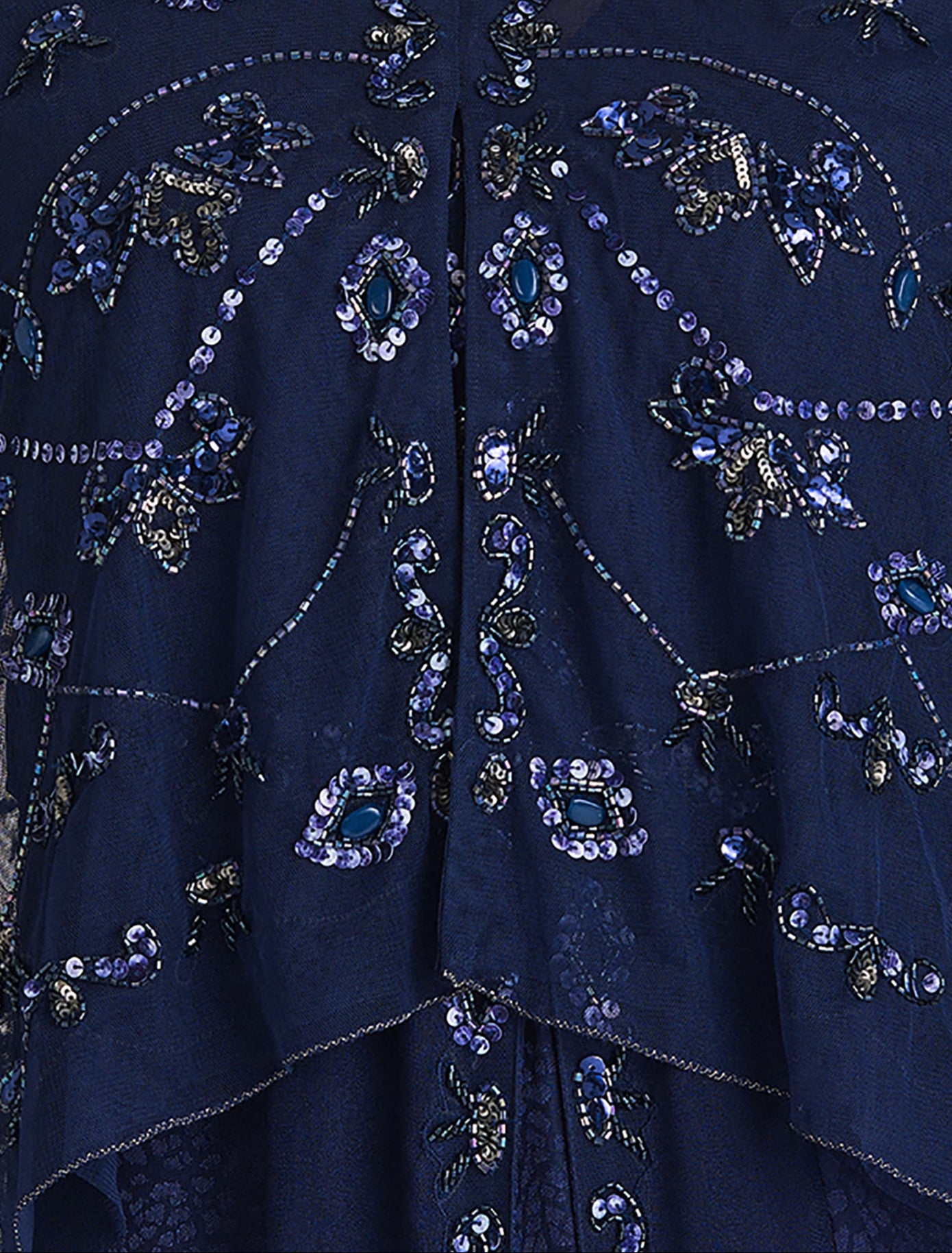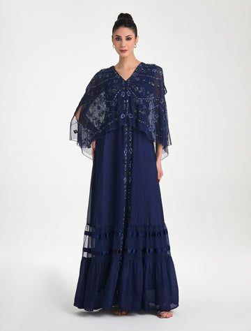 Stand out in this navy evening dress with elegant details and a flowing cape, designed with a flowing cut from top and bottom with no waist belt. This luxurious navy-blue evening gown measures 60 inches in length, offering a royal look, featuring a hand-embroidered deep V-neckline with blue and off-white beads on the bodice, while the lower skirt is embellished with cascading lace tiers featuring embossed patterns, detailed with dark satin ribbons and a soft, built-in shimmer. Embrace elegance in Shalky’s navy evening gown, perfect for special occasions, weddings, and parties.