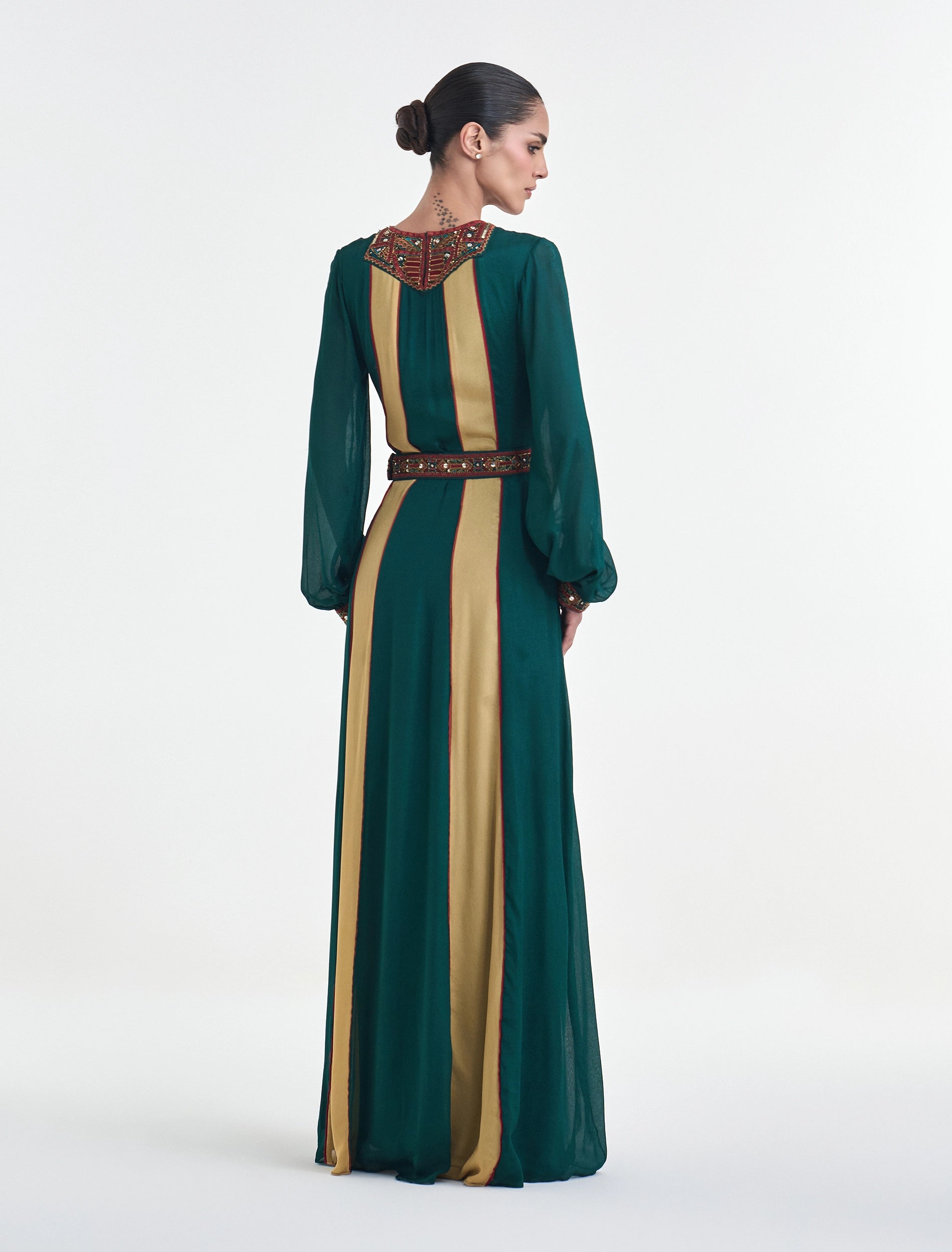 Stand out in a dark green dress with yellow accents and closed, long sleeves, reflecting modern Arabian luxury, harmonizing sleek, flowing textiles with finely detailed traditional craftsmanship. This elegant evening dress is enriched with vibrant geometric detailing that complements the embroidered belt, gracefully defining the waist with a feminine style.