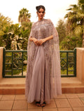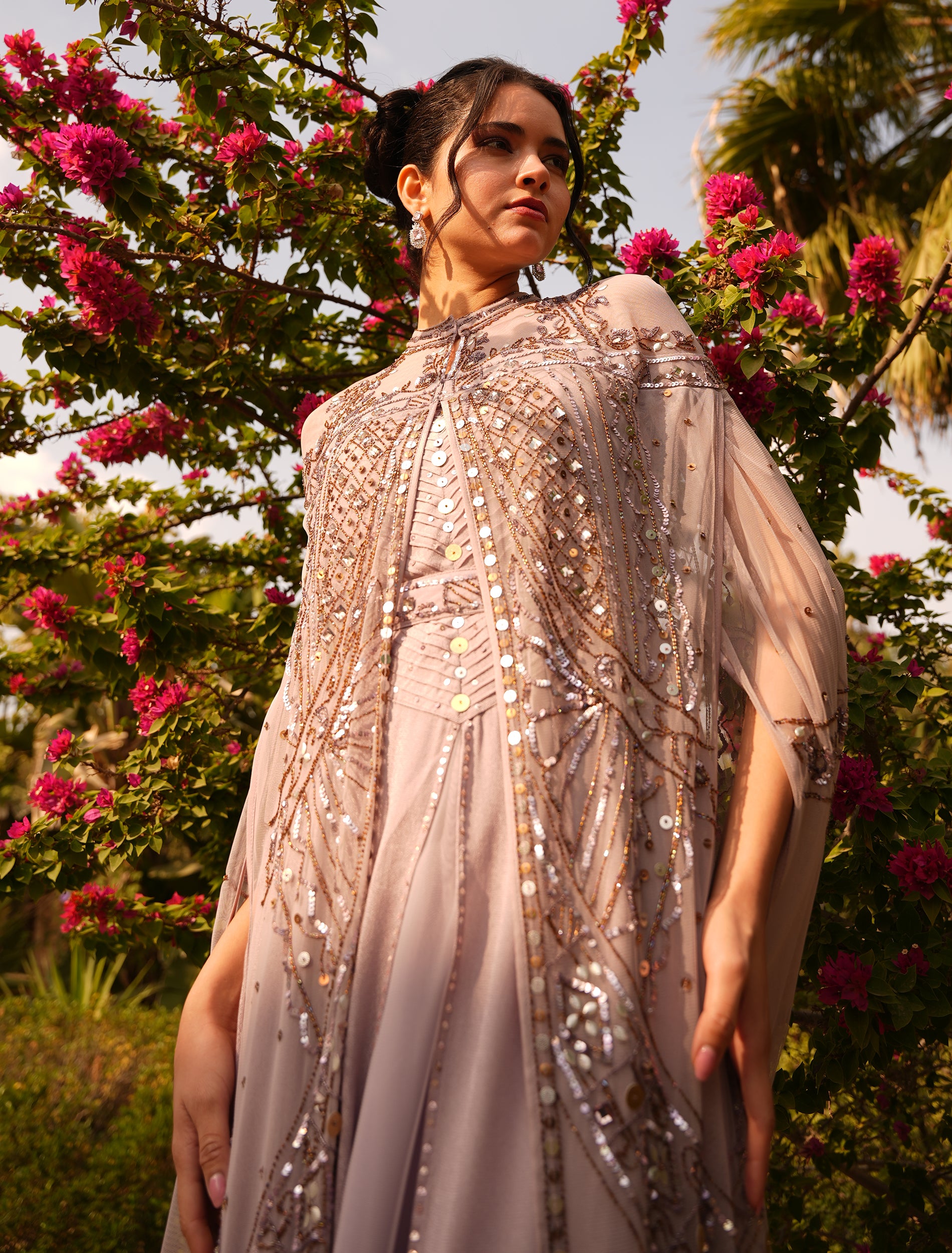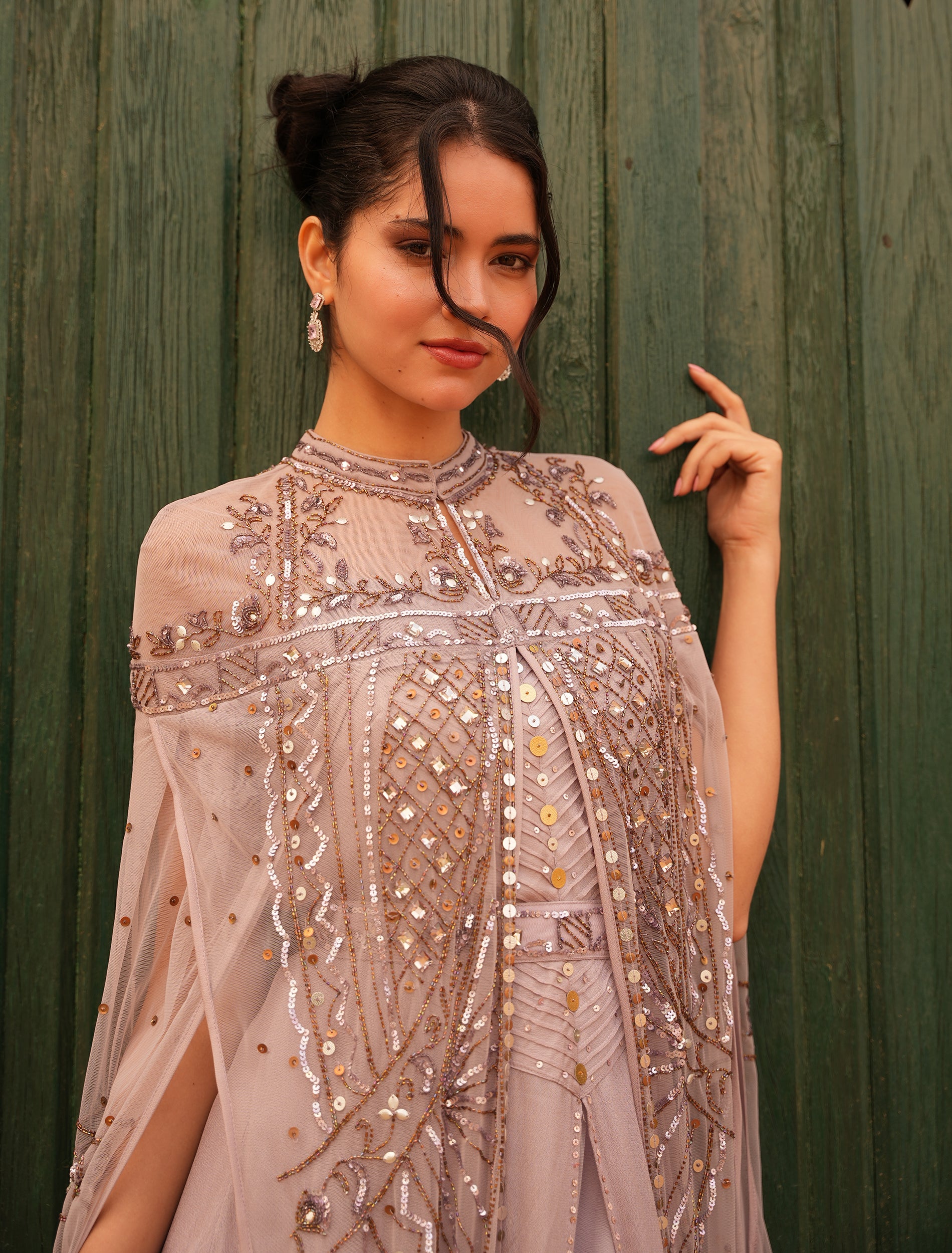 Indulge in a lavender dress for evenings, designed with a shimmering modest silhouette that reflects the elegant details. It features a striking beaded geometric-patterned hand-embroidered high neck. Embrace elegance with a perfect evening look at evening parties, engagements, and high-end events.
