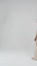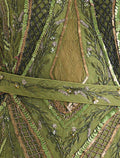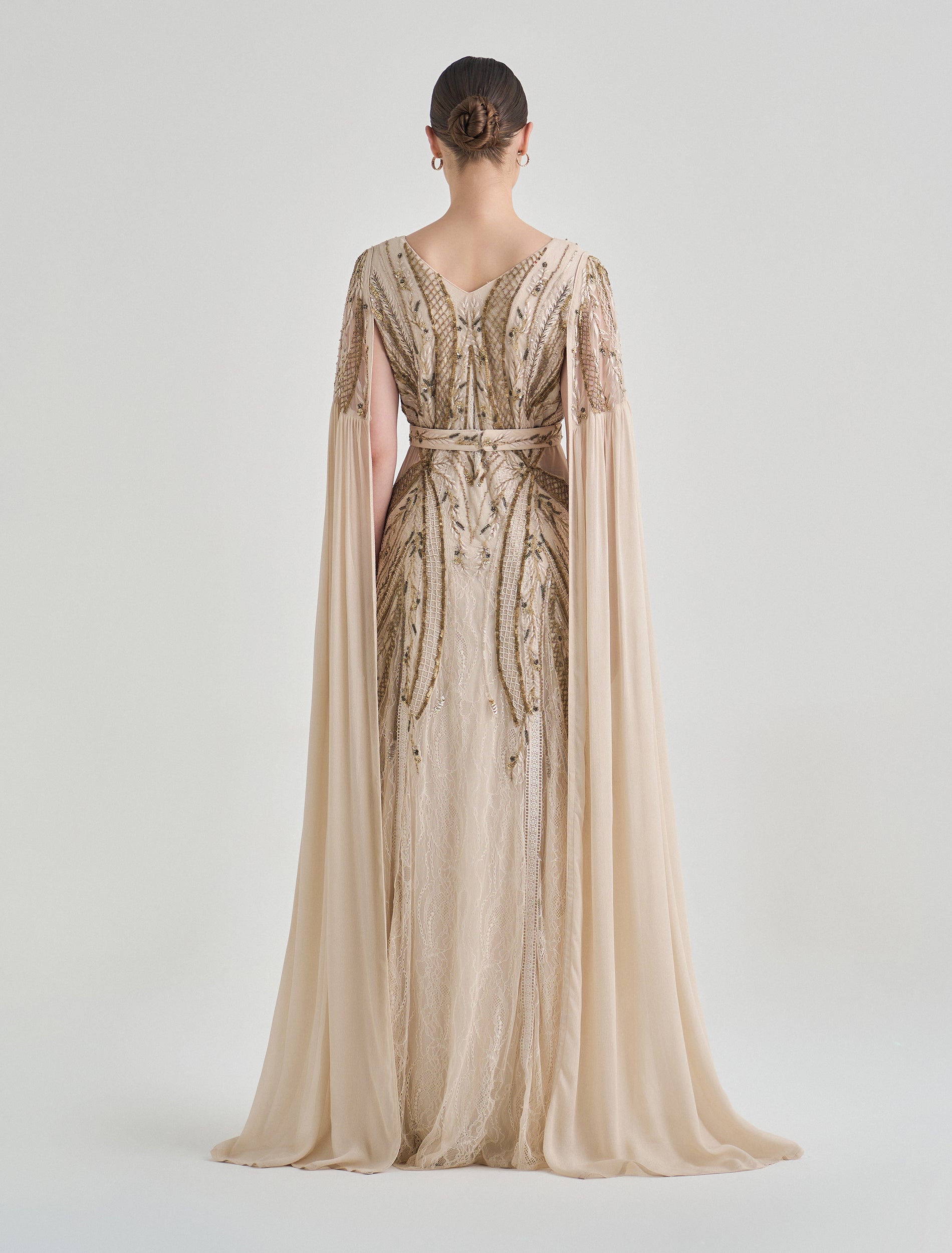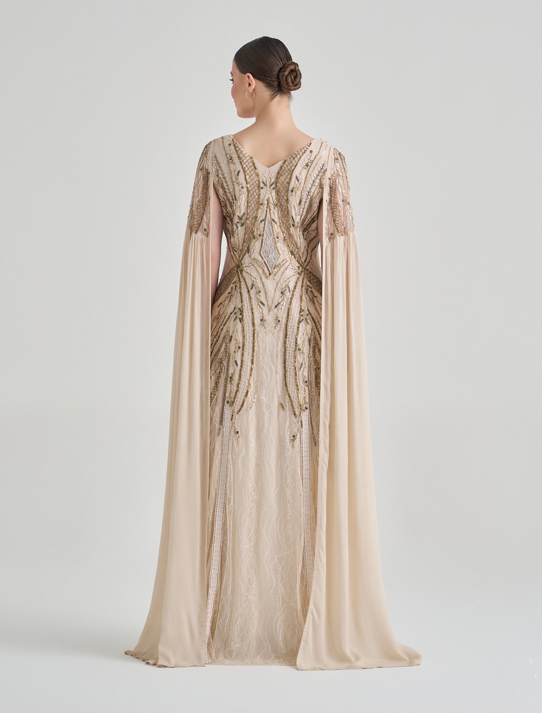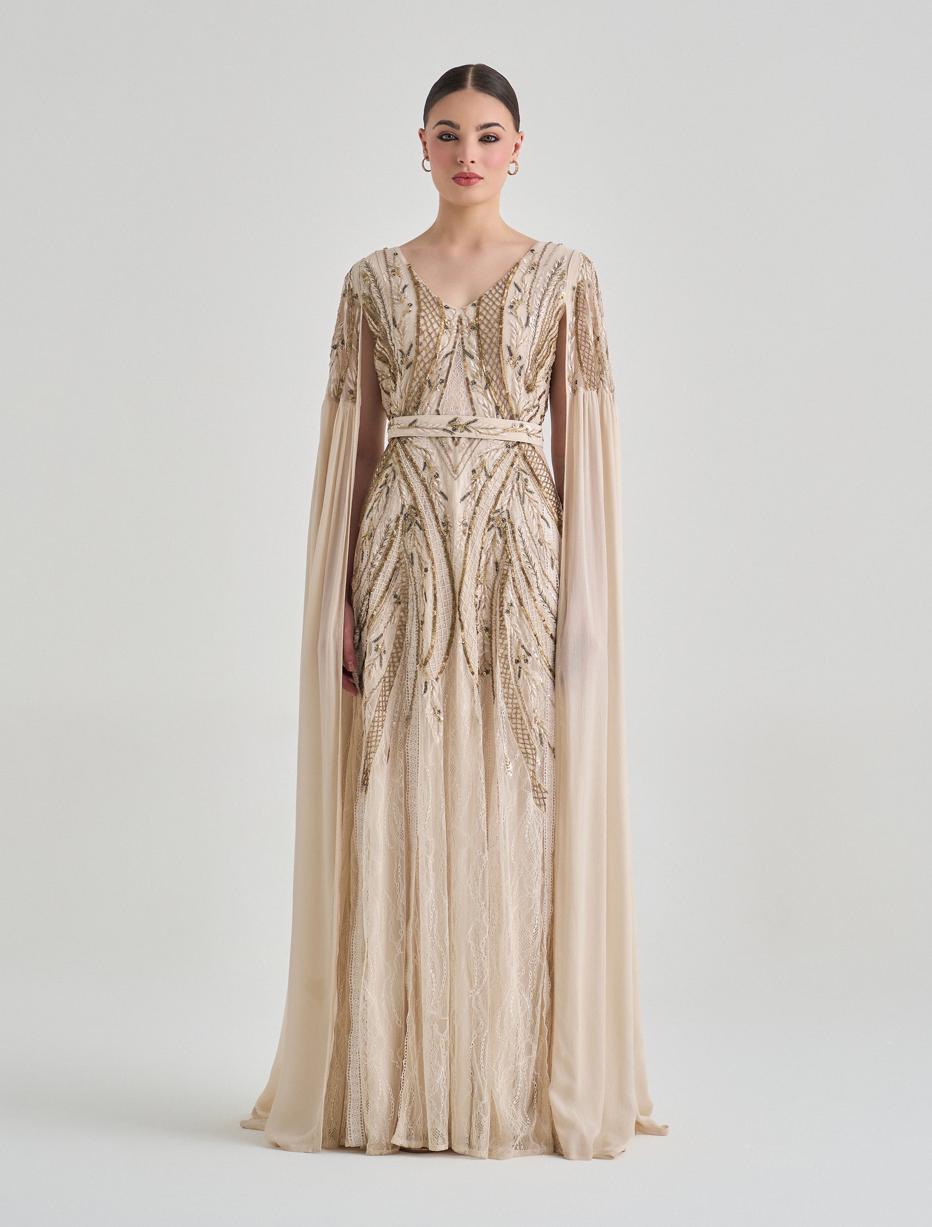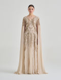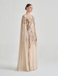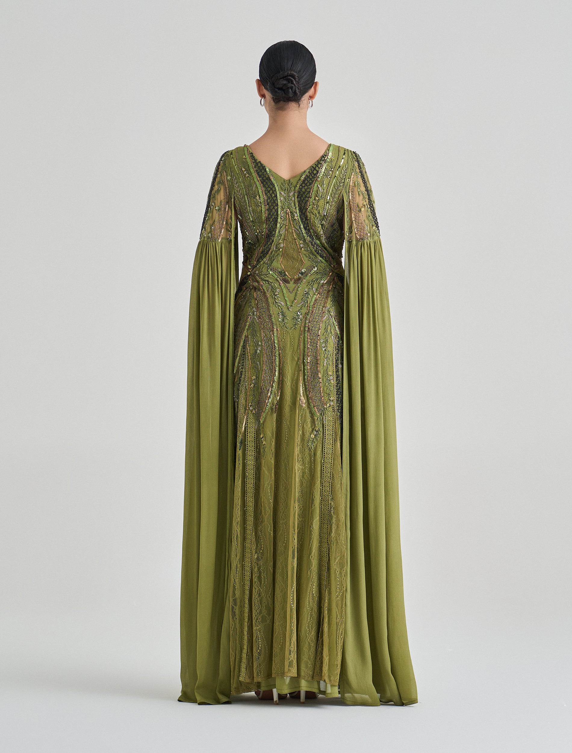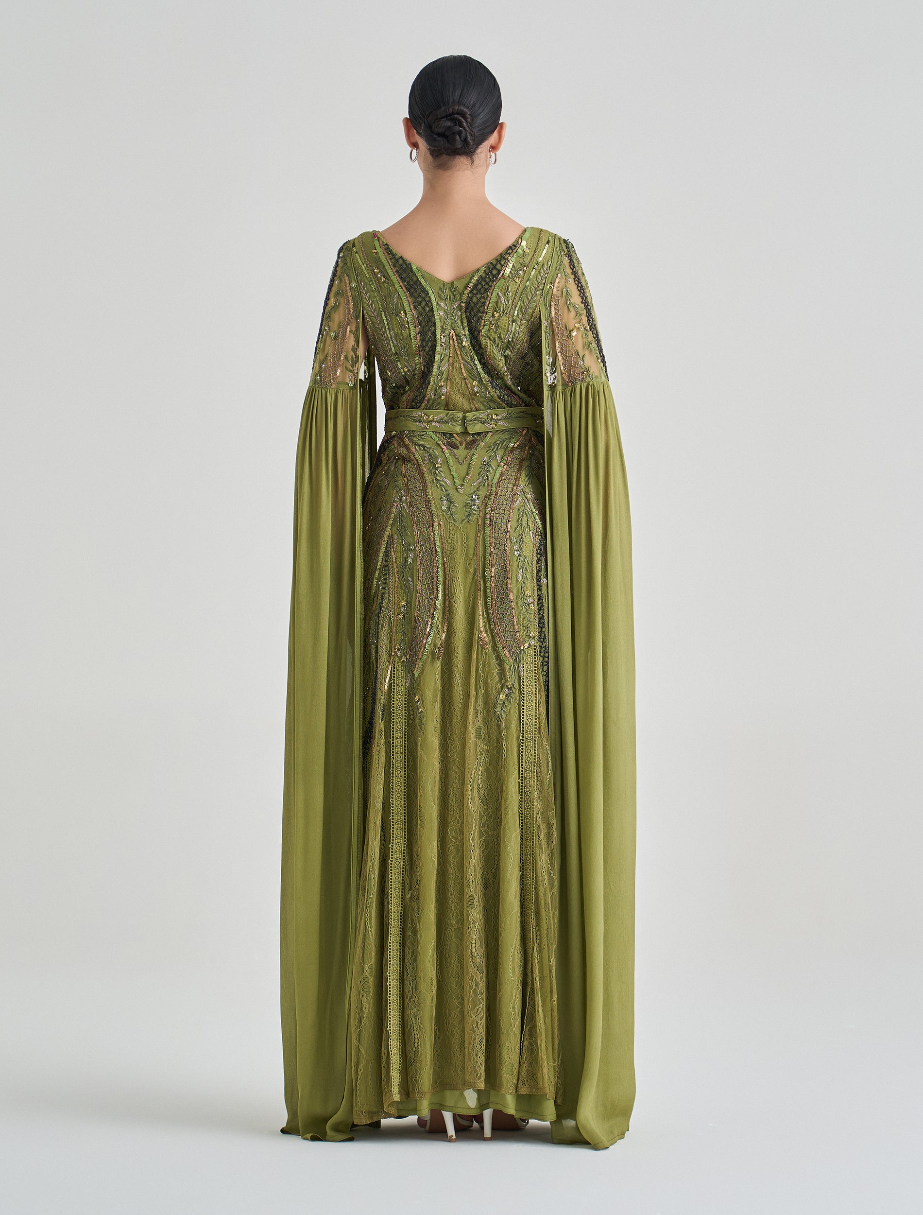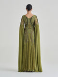 Embrace elegance in this long-sleeve dress with beaded embroidery and a royal-inspired olive green color. This olive green evening dress features intricate hand embroidery in shades of gold and green that reflects luxury and sophistication. Designed with a V-neckline and long flowing cape sleeves, creating a graceful flow for this party dress.