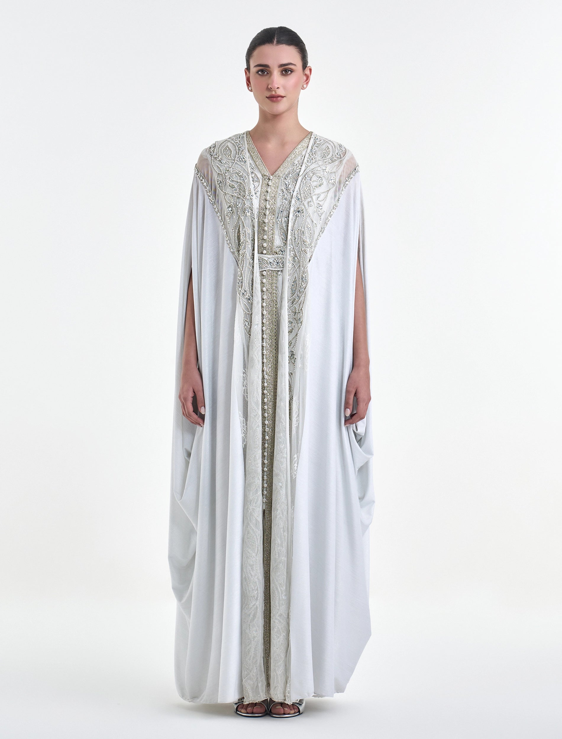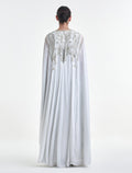 Long white dress for soirées, featuring an embroidered cape with beads and refined embroidery in soft colors. This white maxi dress is designed with long, wide cape sleeves adorned with intricate details, adding a refined touch.