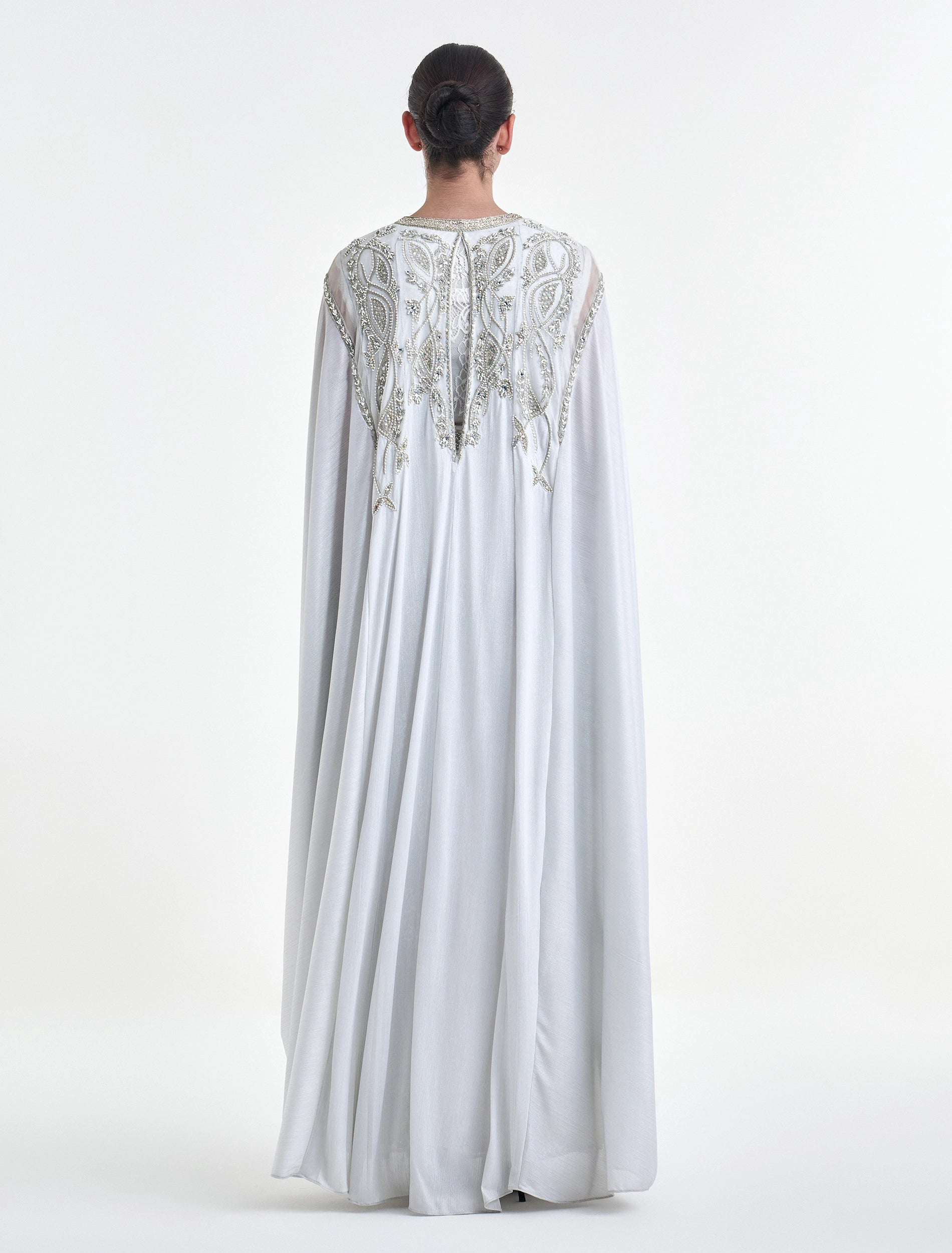 - Sleeves: Long, embroidered cape sleeves