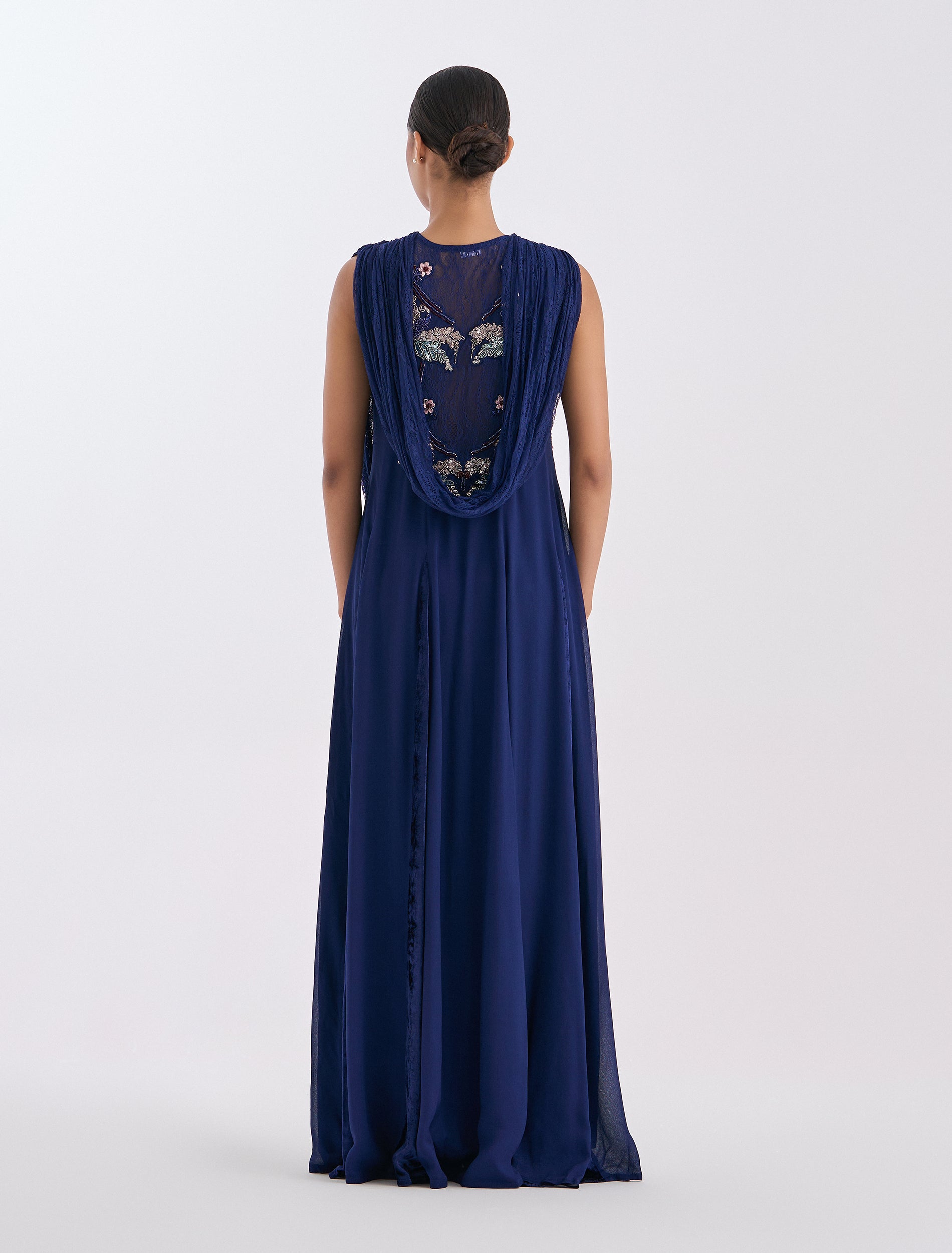 - Design: Draped with a flowing length, soft pleats, and intricate side embroidery