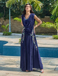 Stand out in this navy evening with a draped waist from Shalky. This long off shoulder dress is made from premium velvet and crepe, measuring 60 inches in length for a graceful flow. Embrace elegance in every movement with this navy lace dress with a perfect design that gracefully accentuates your figure.