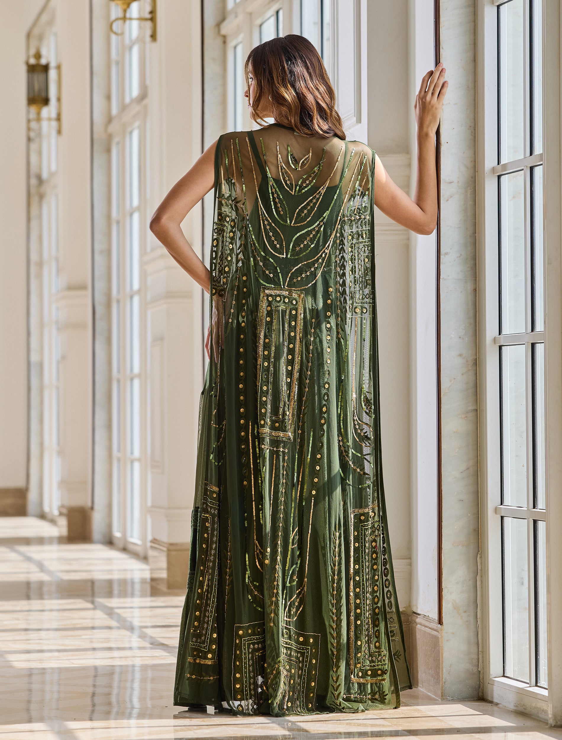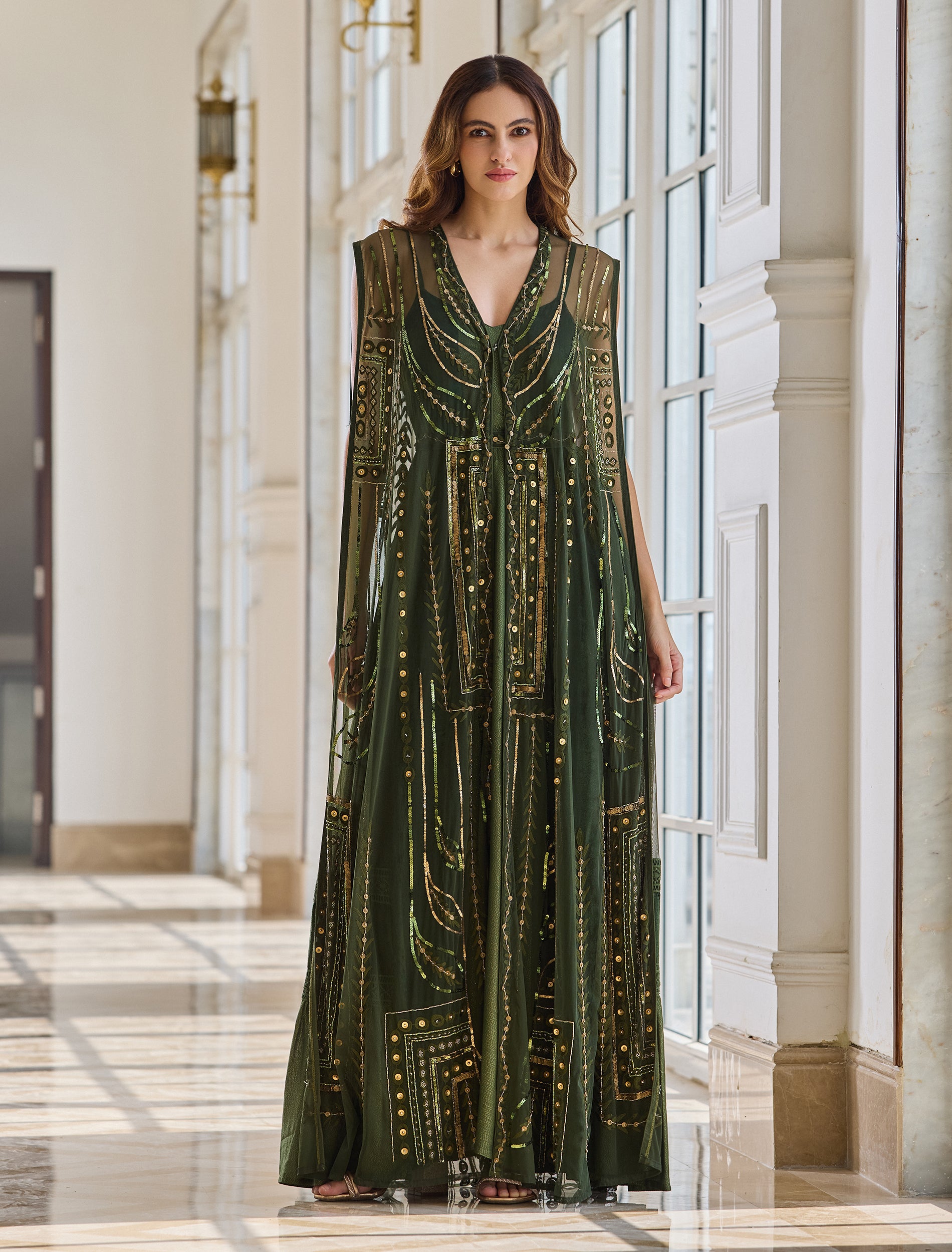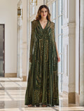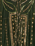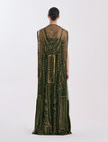 Stand out in Shalky's olive-green sleeveless evening dress. This long off-shoulder evening dress features a flowing two-piece set: an inner dress of velvet and georgette with an embroidered tulle cape accented with elegant gold beads and shimmering embroidery, offering an elegant, eye-catching look.