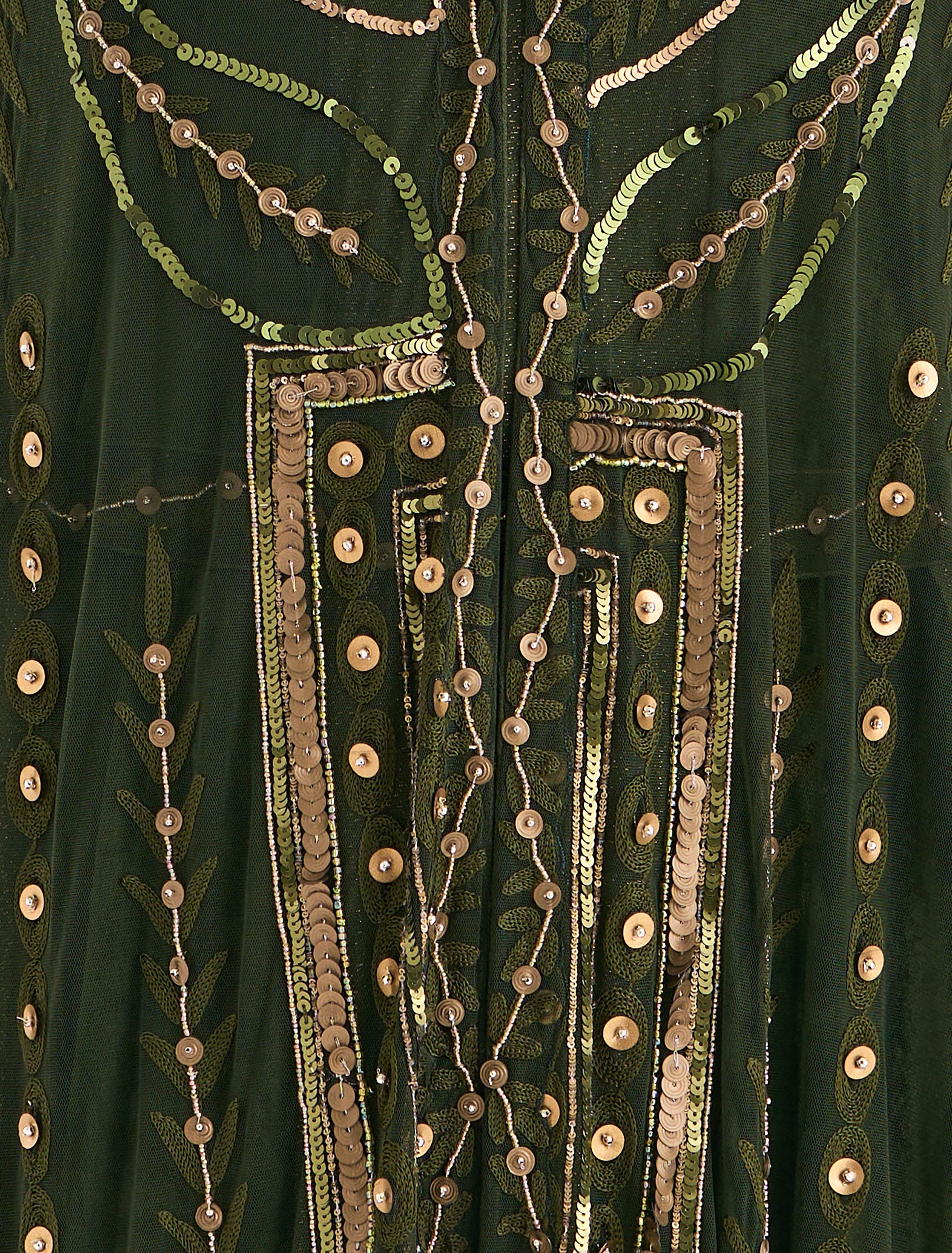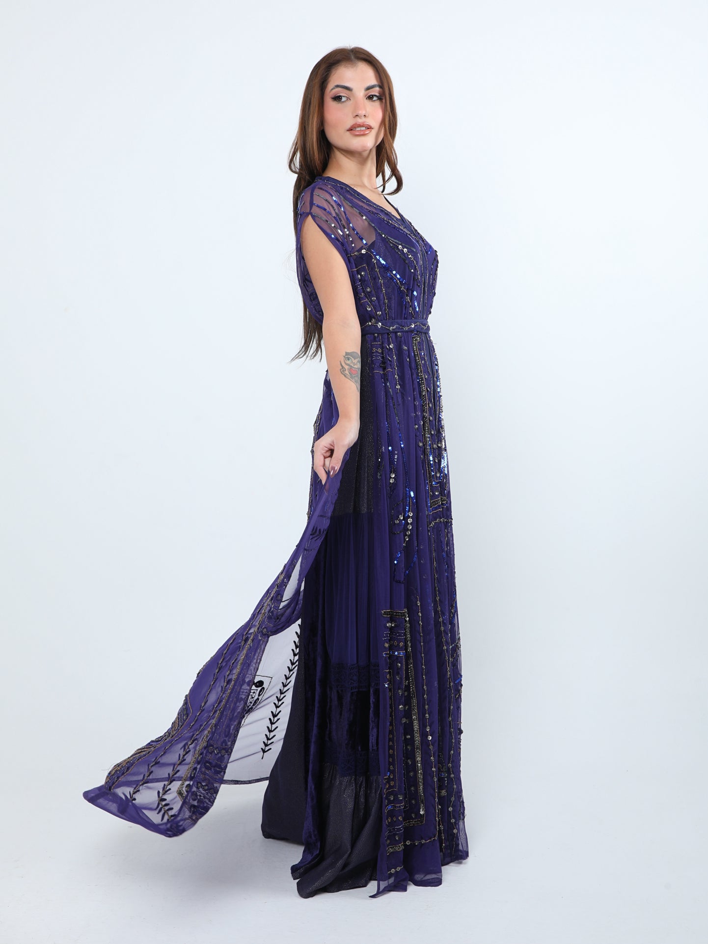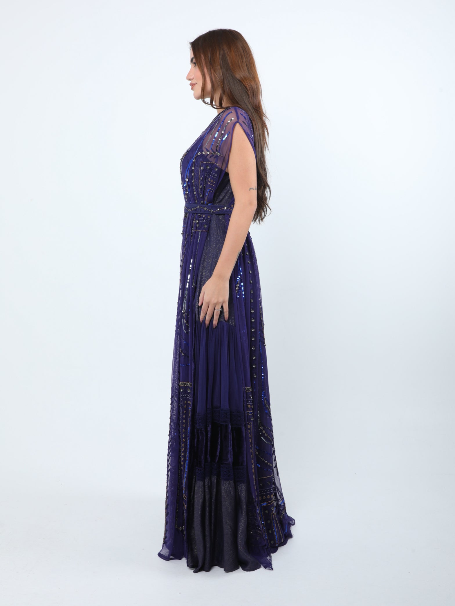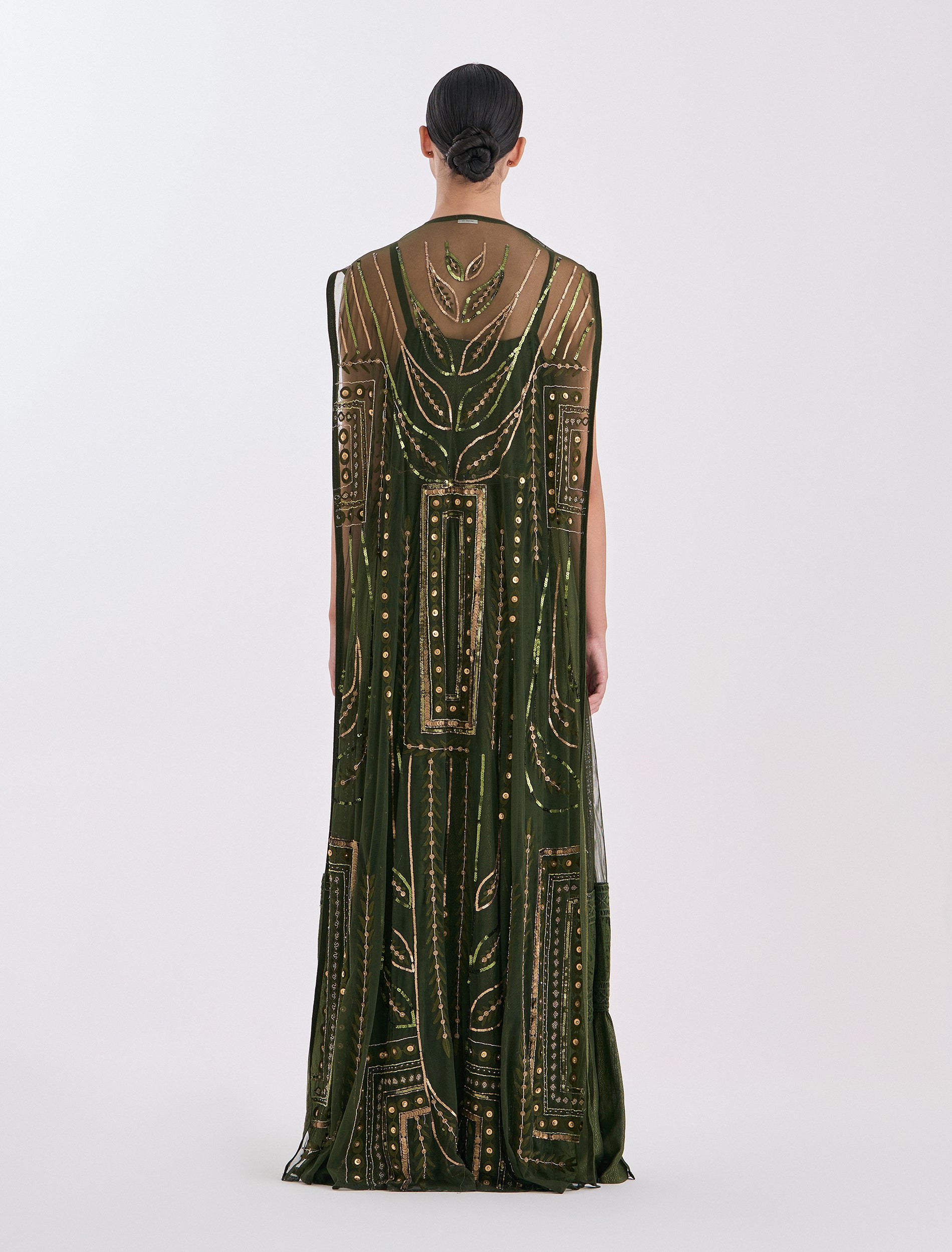 - Embroidery: Hand-Embroidered evening dress with elegant gold beaded geometric motifs