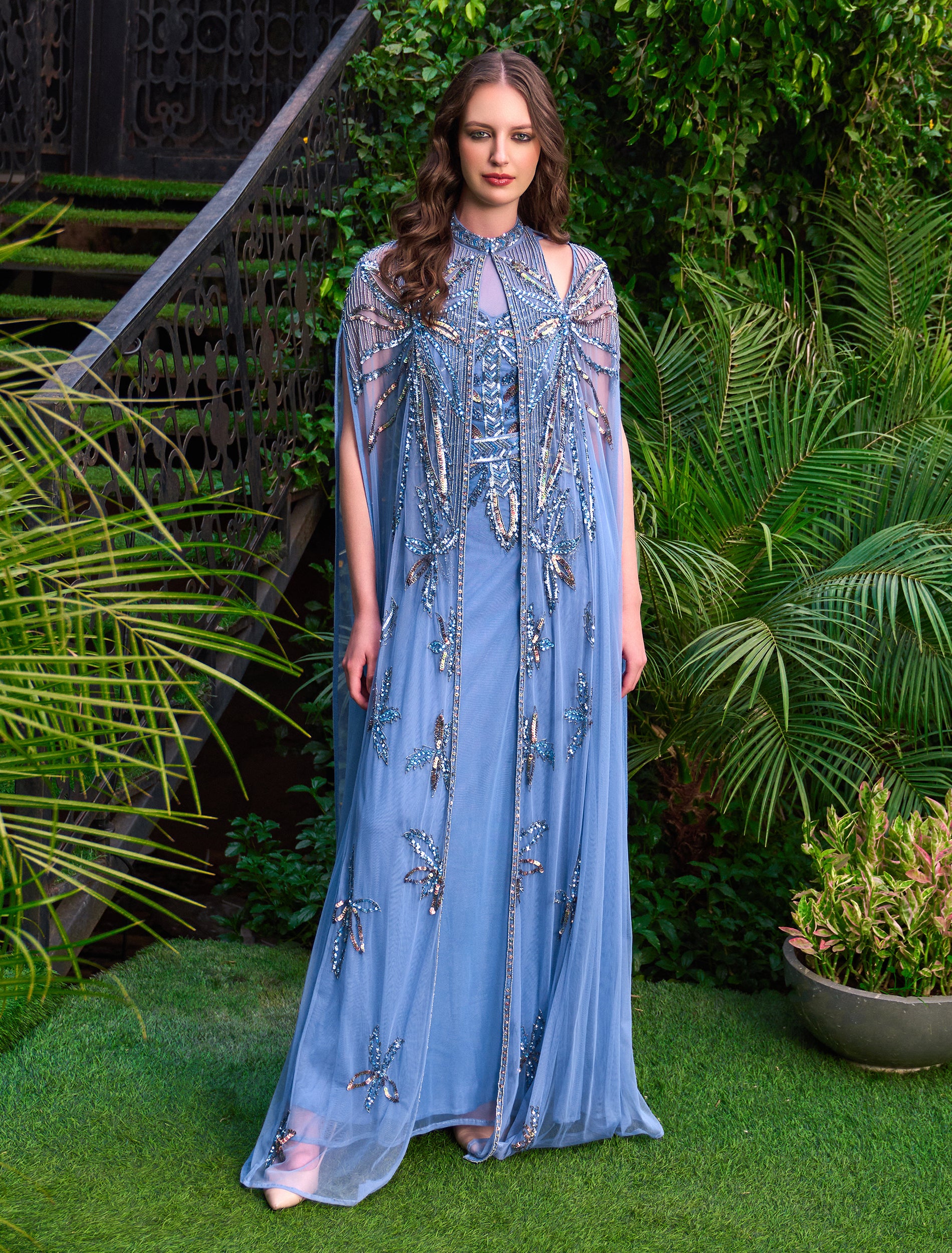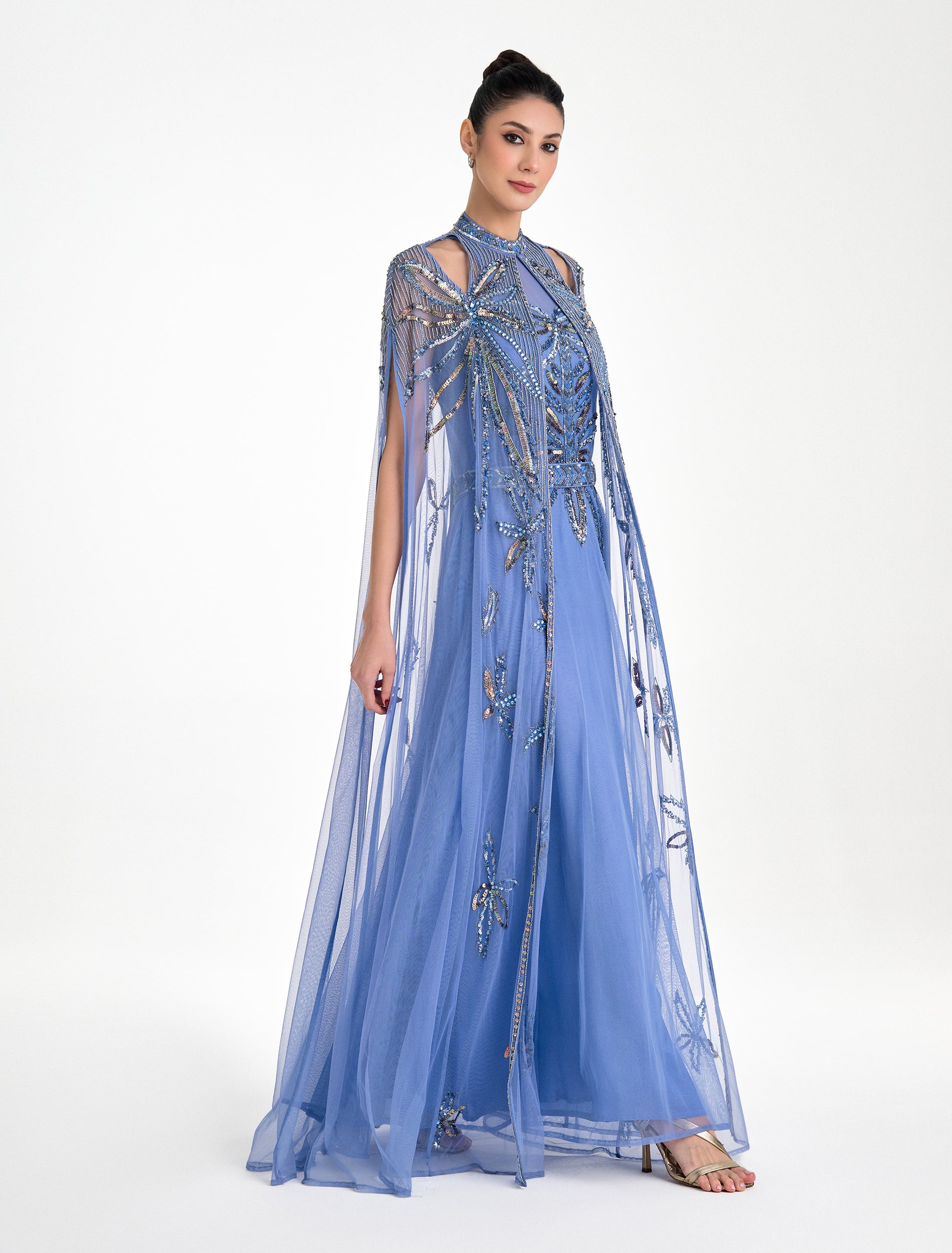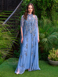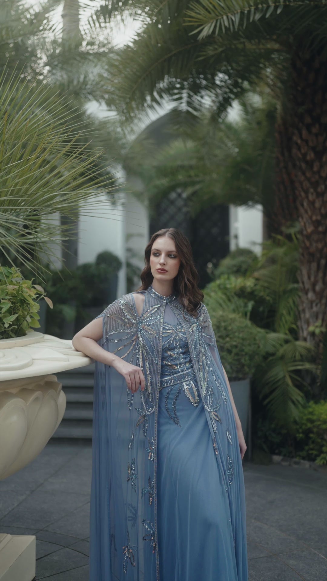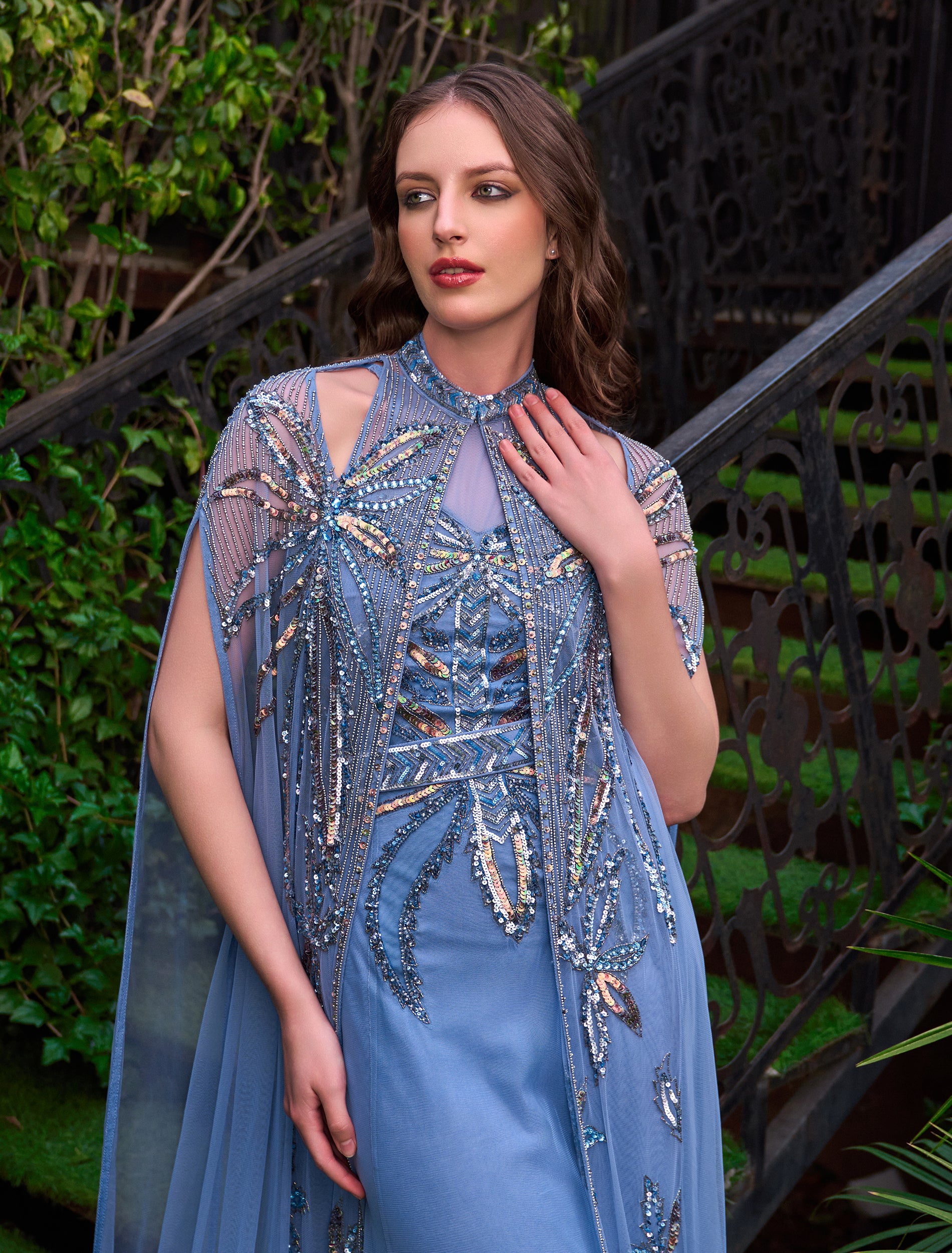 Embrace elegance in this Tiffany blue evening dress, featuring its dreamy sky-blue shade and exquisite hand-embroidery from Shalky’s signature craftsmanship. The sky evening dress is designed with a long royal cape, ideal for luxury occasions, weddings, and formal soirees. It features a modest closed neckline and premium fabrics that blend comfort and elegance. Order this modest sky blue dress for timeless elegance and a stunning look.
