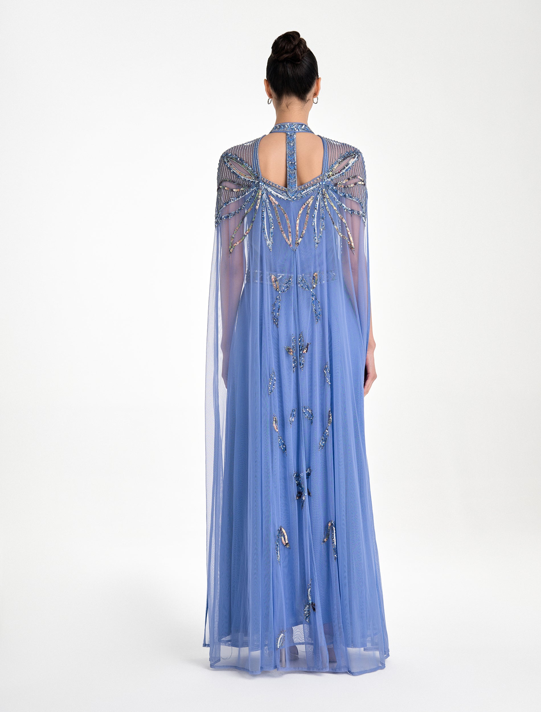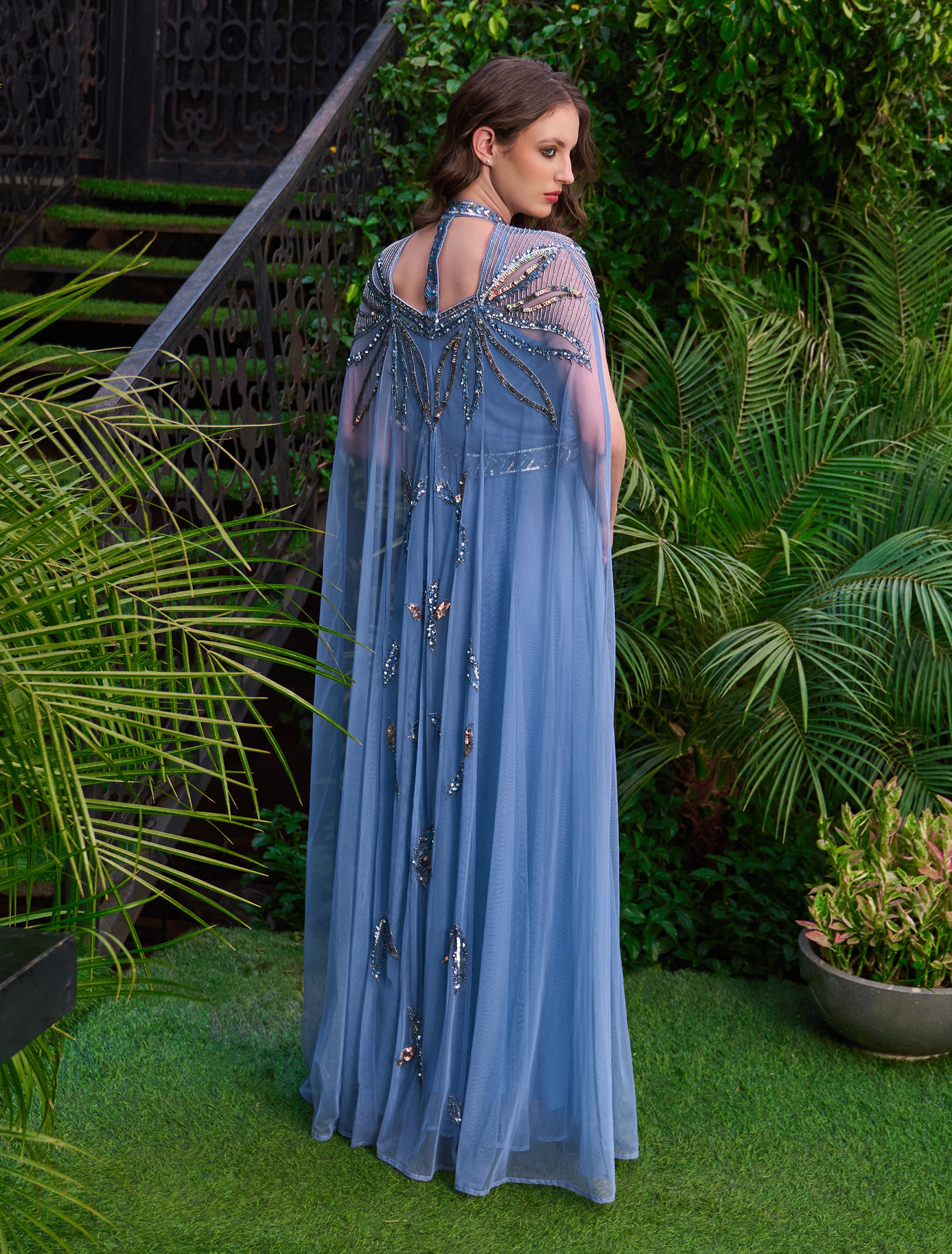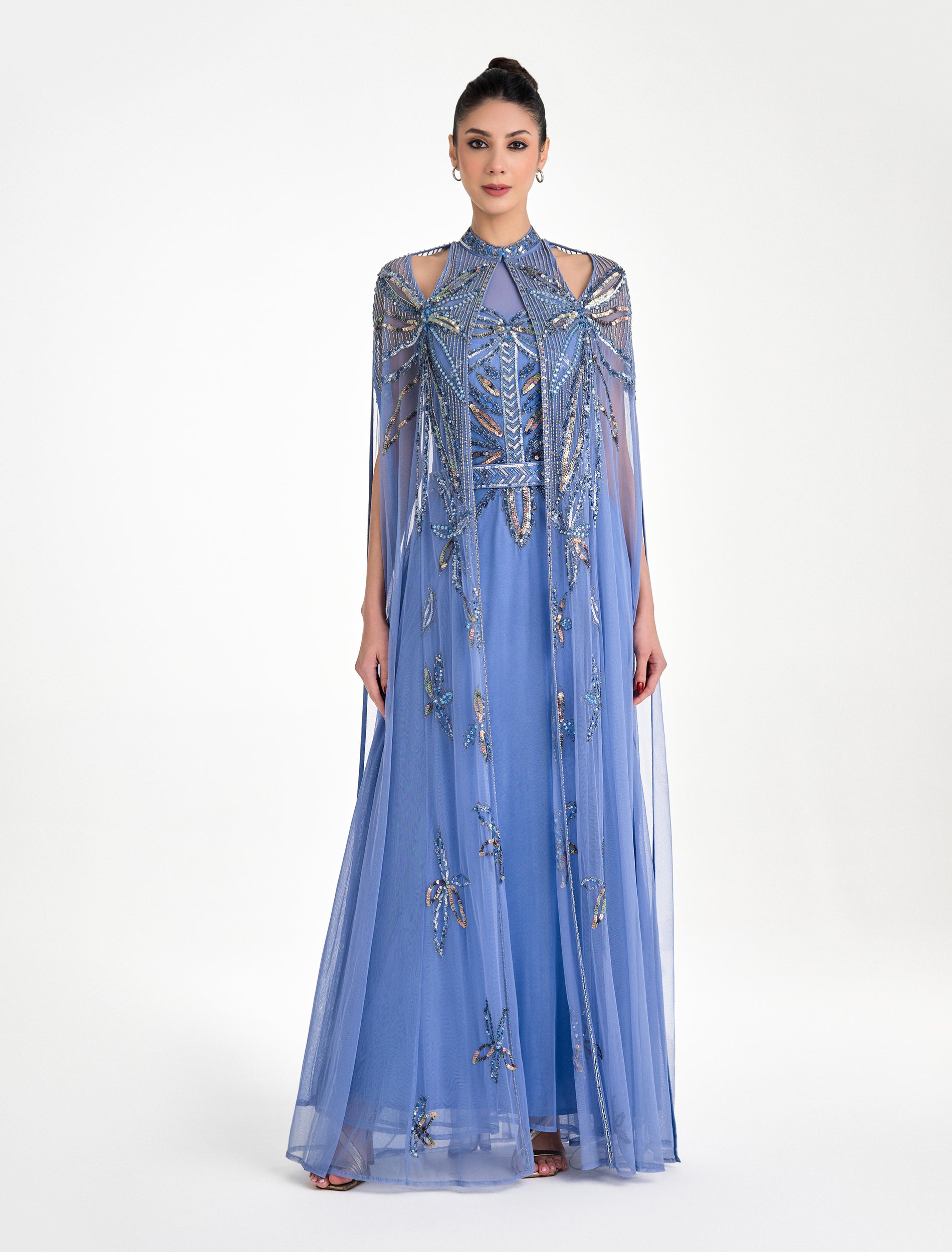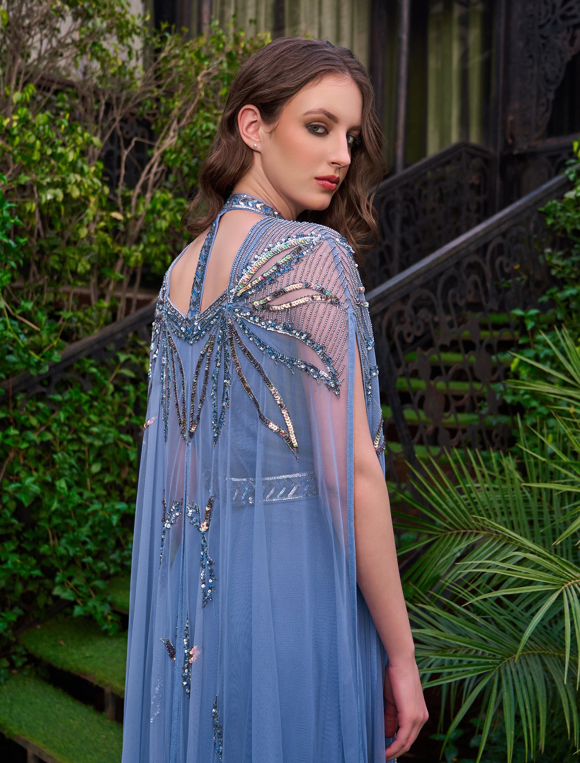 Embrace elegance in this Tiffany blue evening dress, featuring its dreamy sky-blue shade and exquisite hand-embroidery from Shalky’s signature craftsmanship. The sky evening dress is designed with a long royal cape, ideal for luxury occasions, weddings, and formal soirees. It features a modest closed neckline and premium fabrics that blend comfort and elegance. Order this modest sky blue dress for timeless elegance and a stunning look.