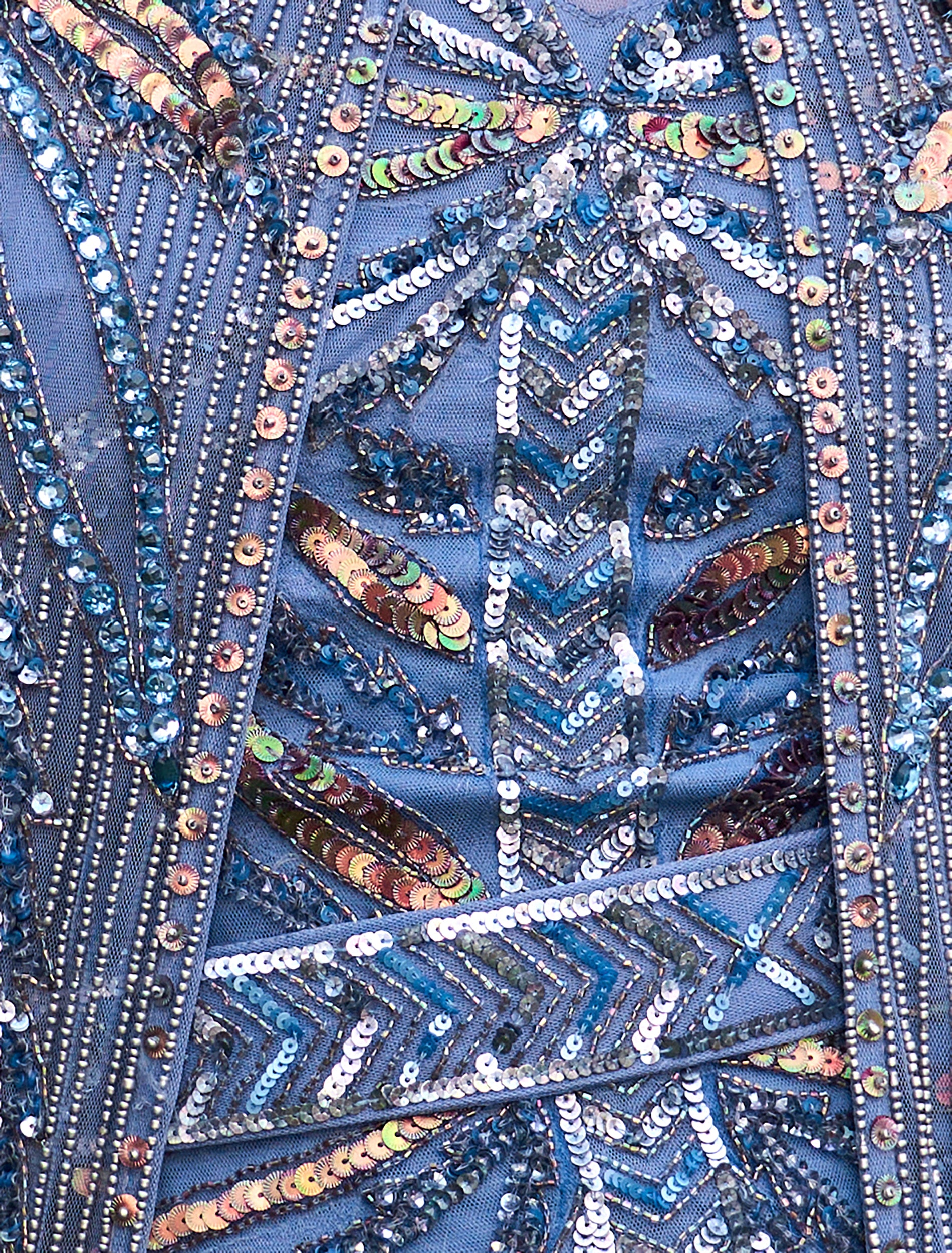 - Embroidery: Hand-embroidered with silver, indigo, and gold sequins, crystal, and gem-studded botanical embroidery to enhance the Tiffany evening dress