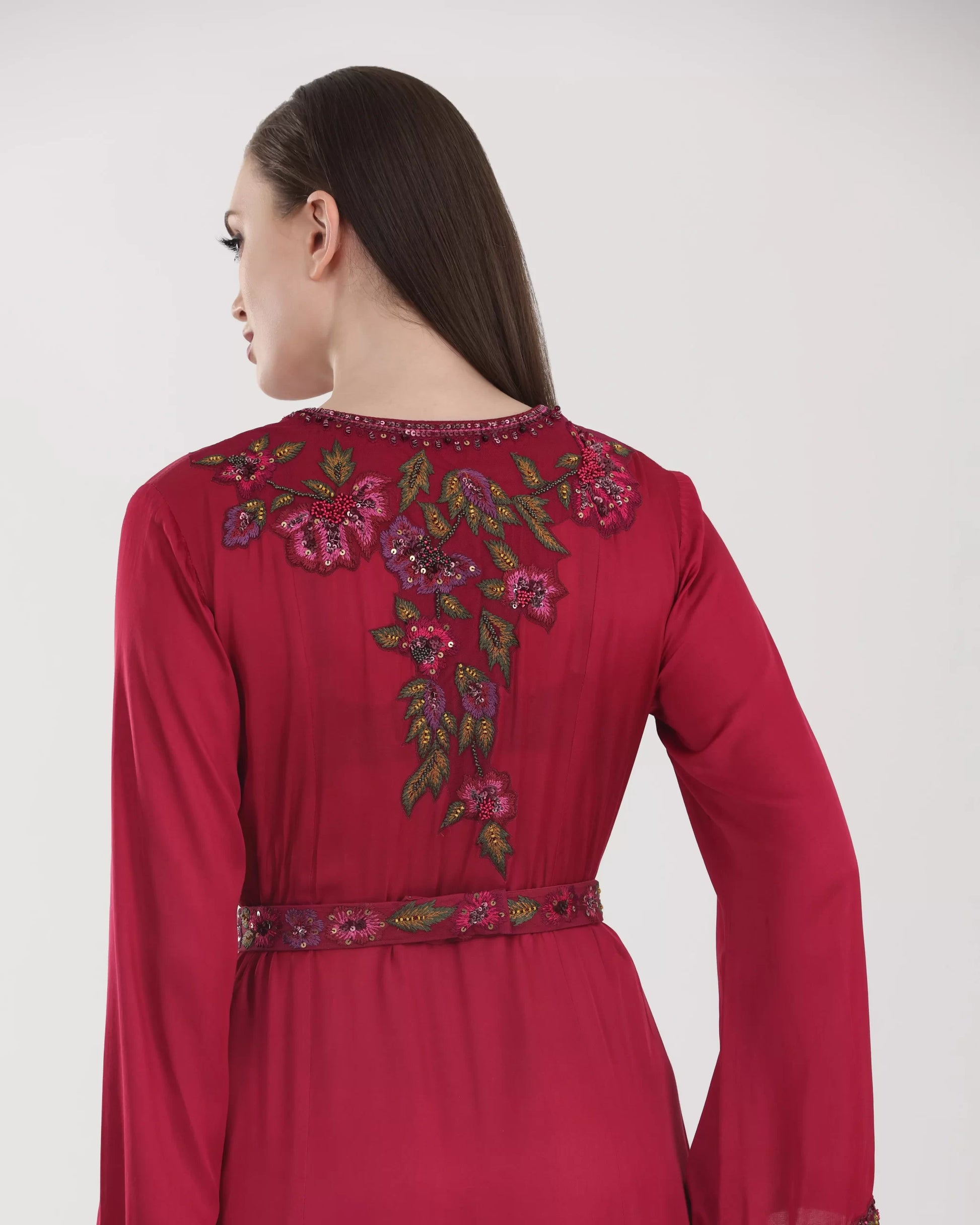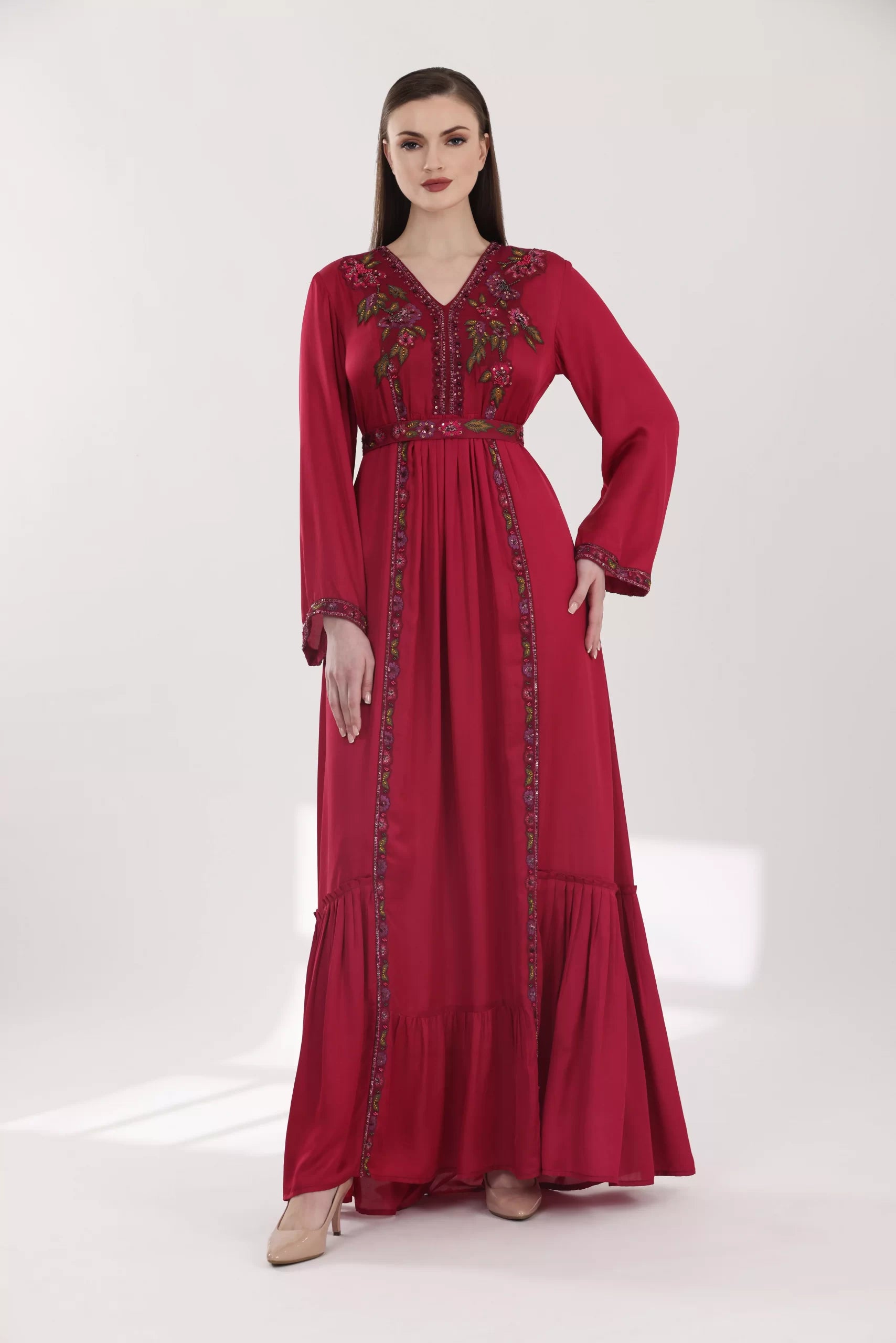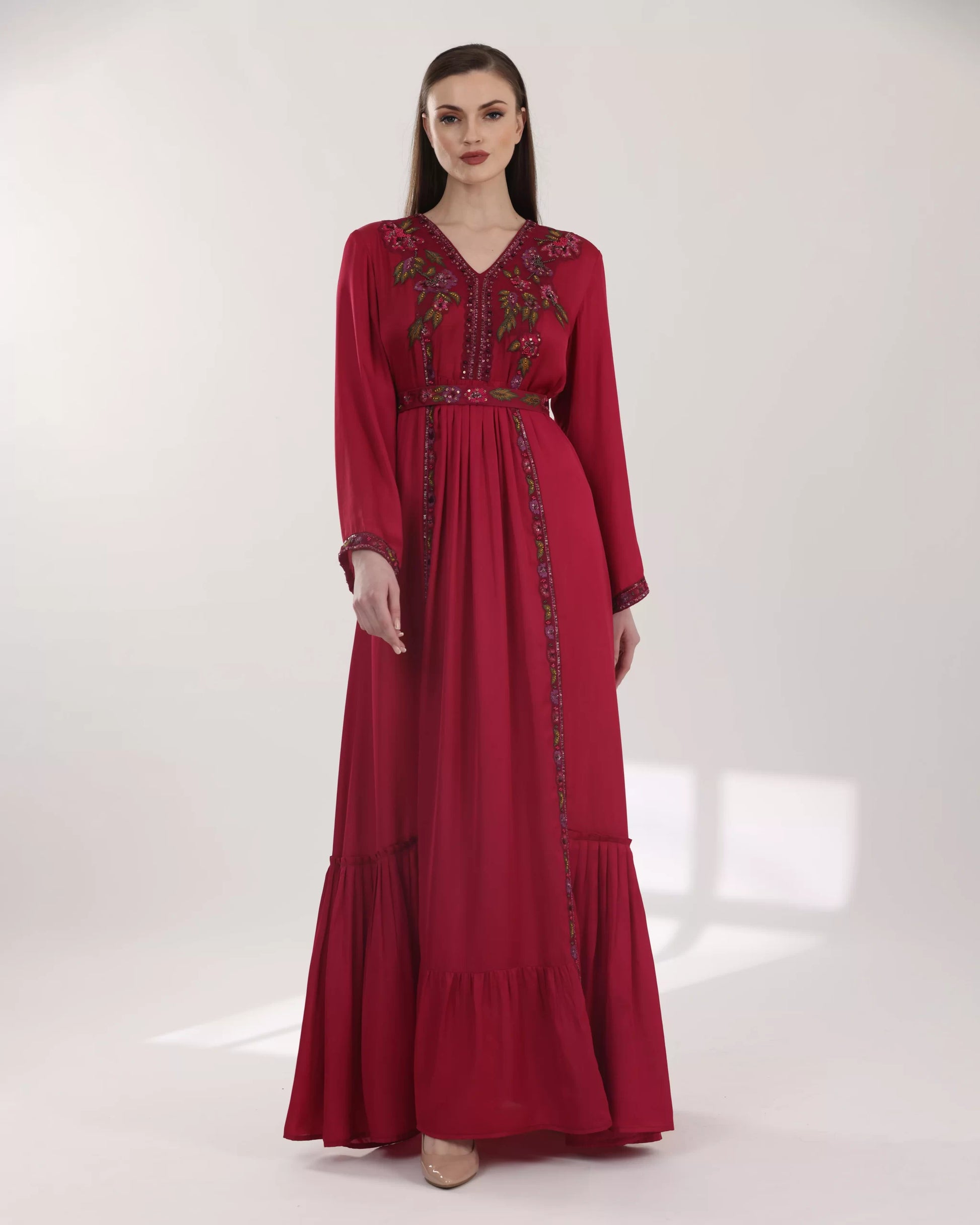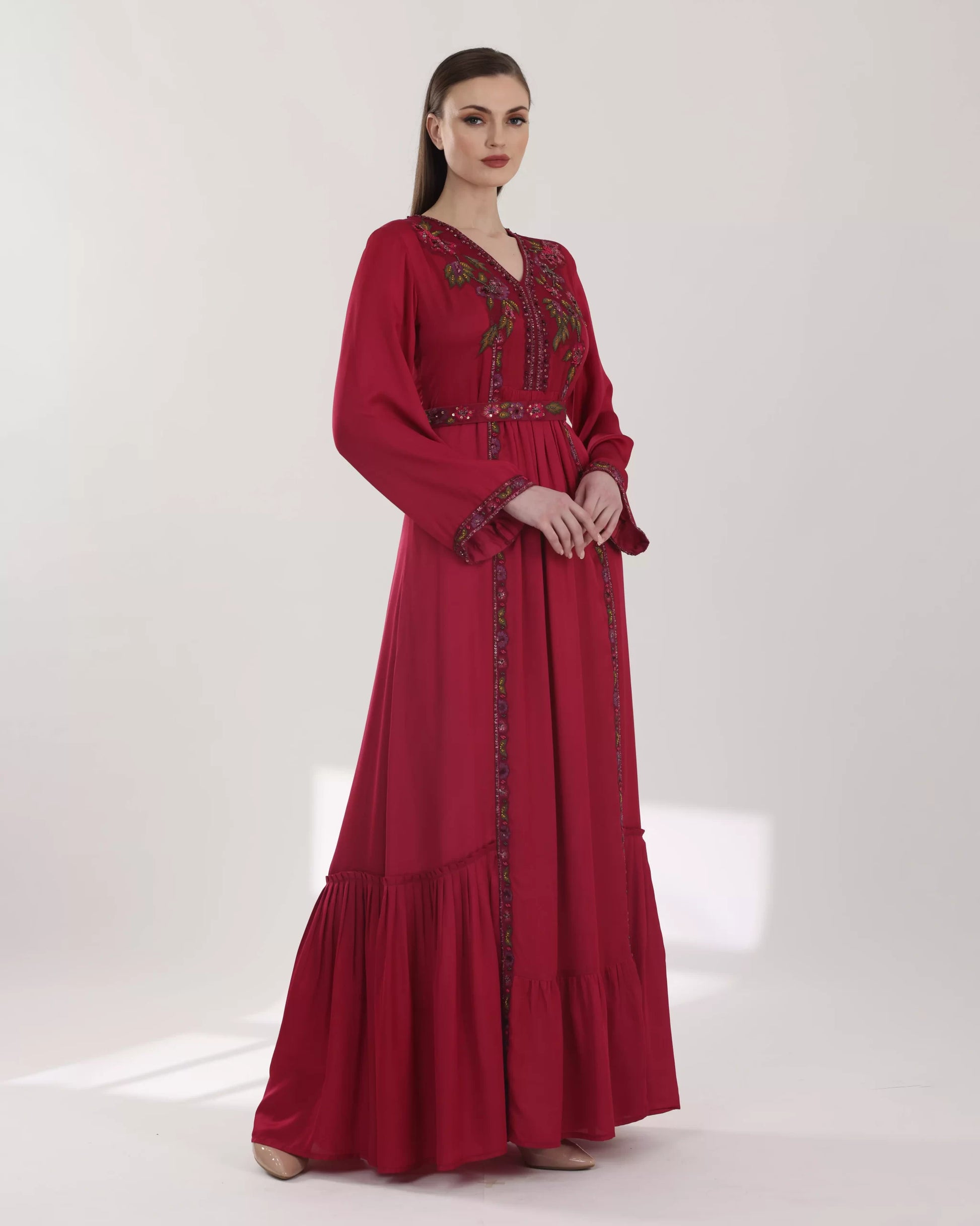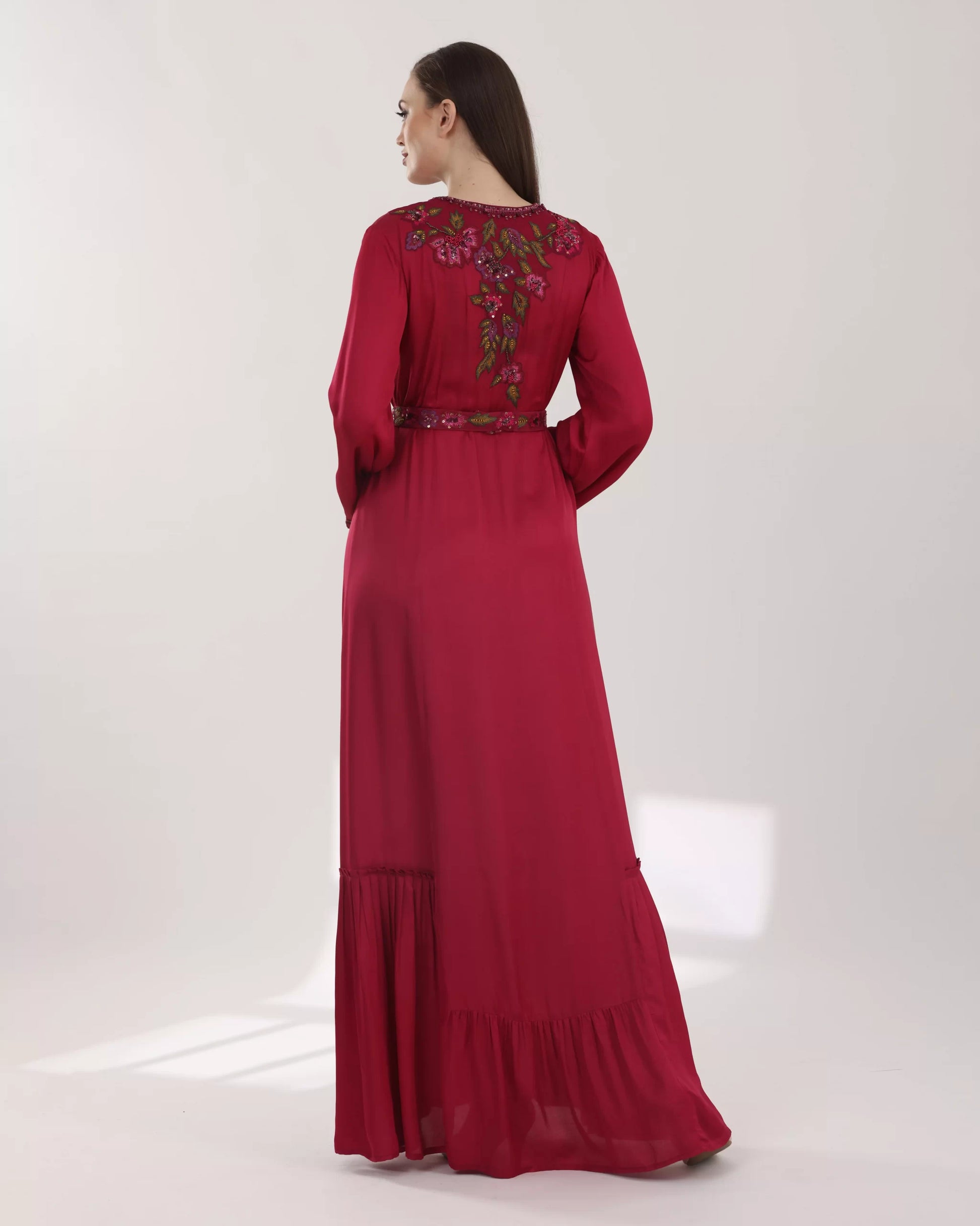 Shine brightly with the stunning long dark red "Priscilla" dress, featuring a V-neckline, wide embroidered sleeves, and a waist belt that accentuates the figure. The dress is decorated with hand-embroidered floral motifs in green and pink shades. It offers a flowing front design with a stylish pleated bottom, and an ideal length of 60 inches.