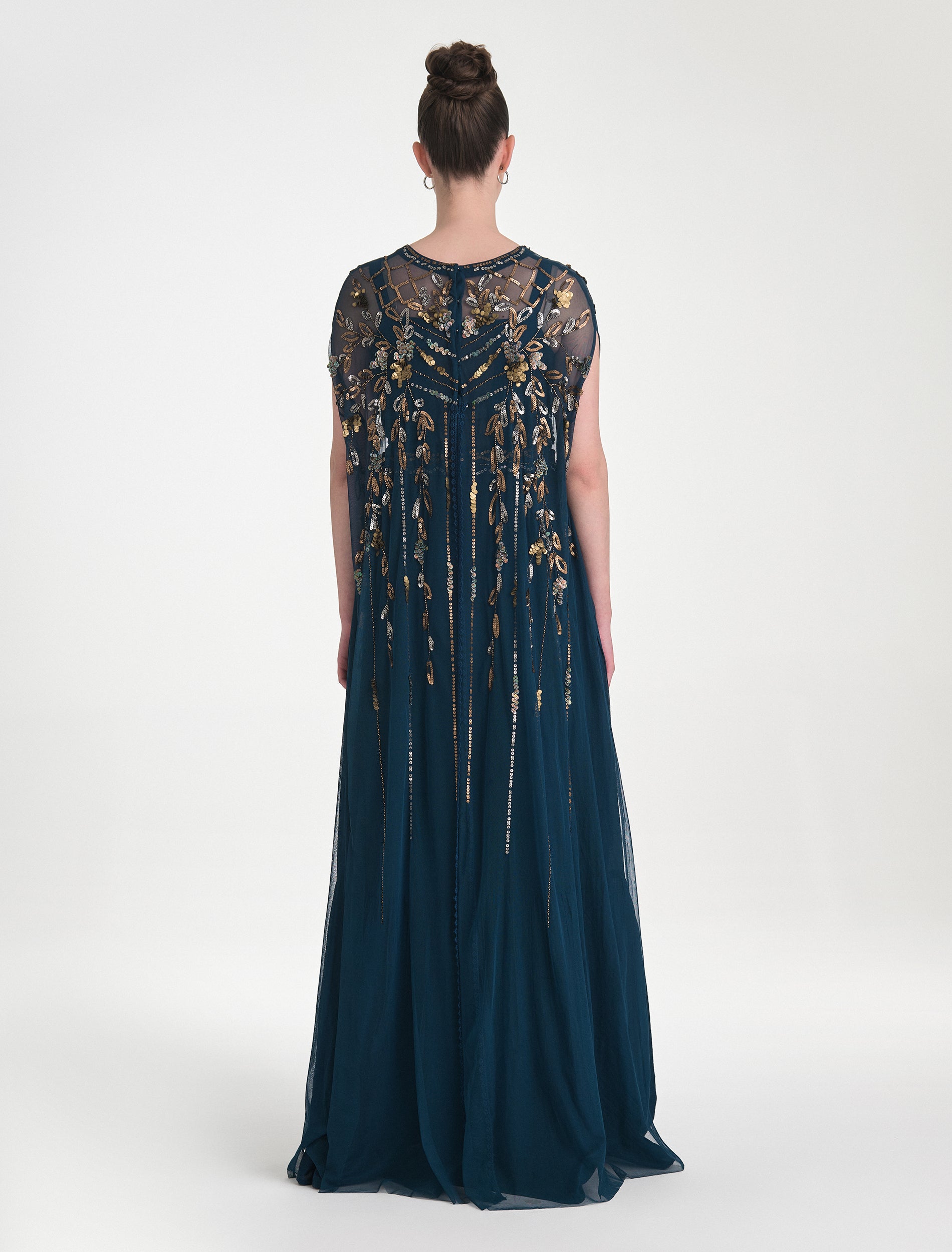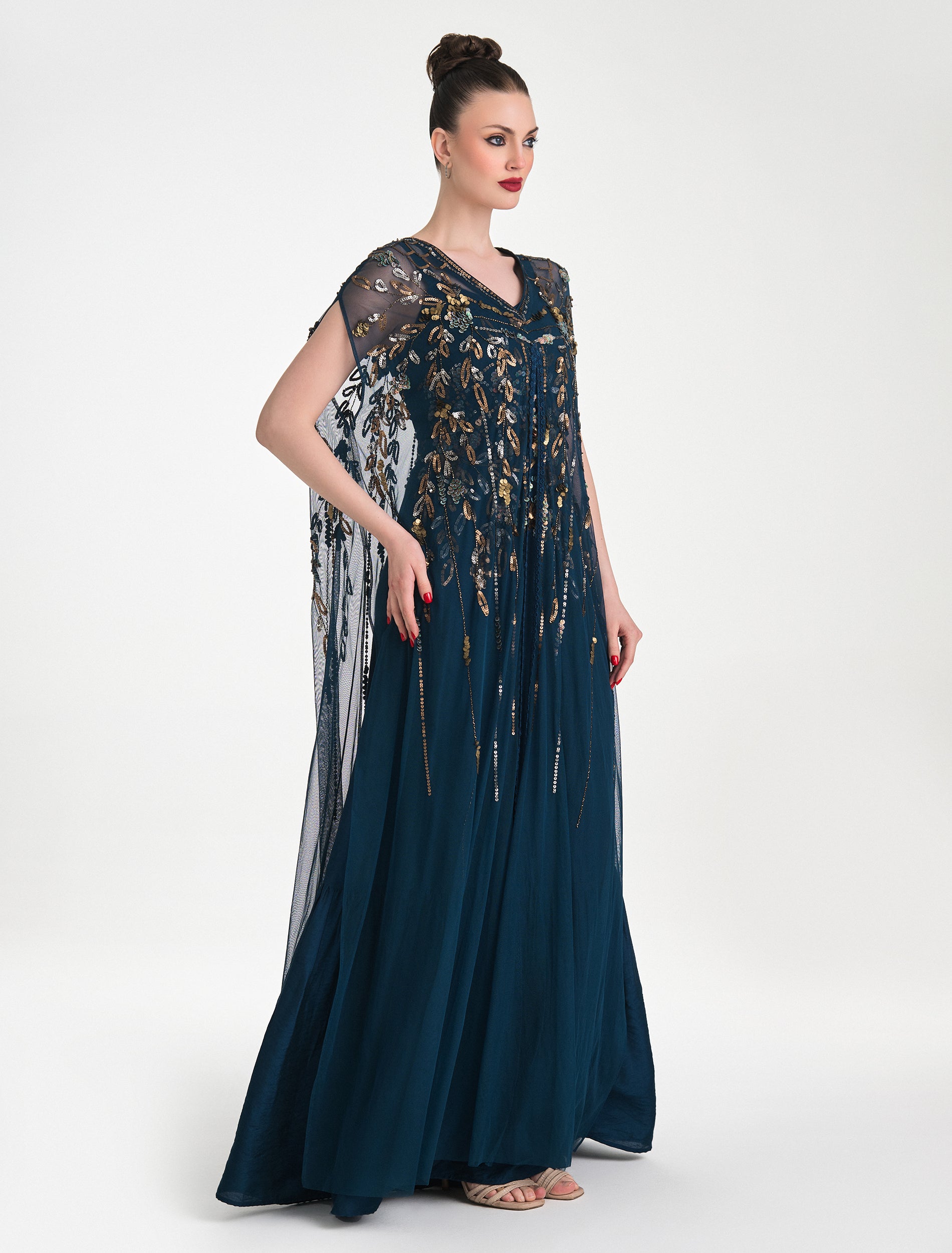 Wear this petrol blue evening dress with a long silhouette at your parties and special events. This embroidered navy evening dress features elegant hand embroidery with shimmering gold and silver beads and threads and delicate crystals. This draped long evening dress showcases a flowing, loose silhouette and vertical pleated detailing. Make a statement in this cape evening dress featuring off-shoulder butterfly-style sleeves, your ideal choice for a timeless luxury look. Explore elegance with Shalky's luxury evening gowns 2025 for an exceptional presence.