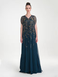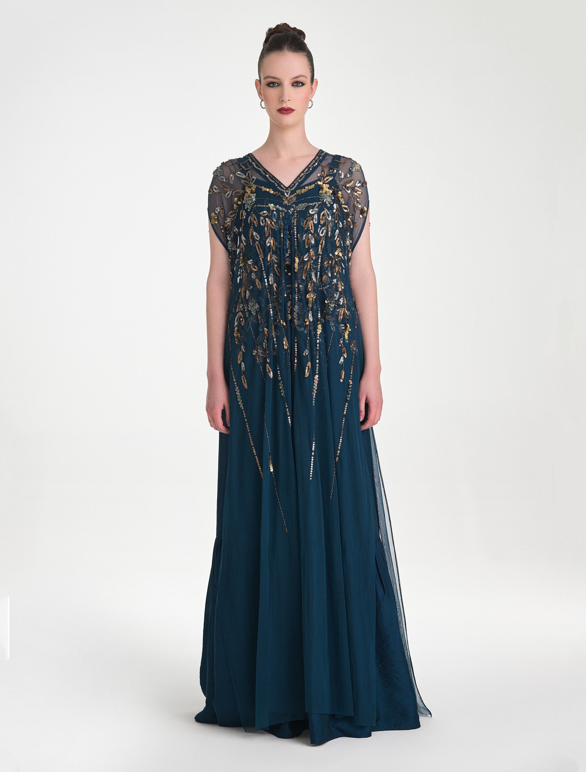 Stand out in this petrol blue evening dress featuring luxurious hand embroidery for an unparalleled look. Let your outfit speak elegance at your occasions, and discover the latest luxury evening gowns 2025 that blend luxury and elegance.