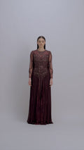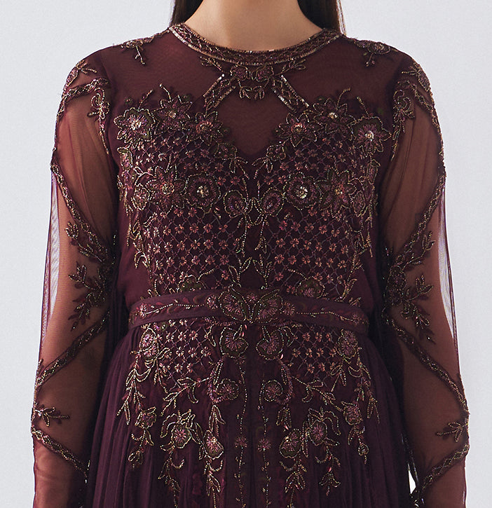 Stand out with Shalky in the ‘Rovan’ long velvet burgundy dress, featuring luxurious and fine hand_embroidered details, bringing a sense of sophistication and chicness. It’s made of smooth velvet that makes you feel comfortable and elegant at once. The dress is designed with a rounded neckline and chiffon sleeves that provides more attractiveness. With a length of 60 inches, making it the ideal choice for weddings and formal events. The fluid design and fine golden embroidery on the chest and the sleeves add a touch of sophistication. The burgundy color suits a wide range of skin tones, especially light and medium tones, and particularly highlights the beauty of dark skin.